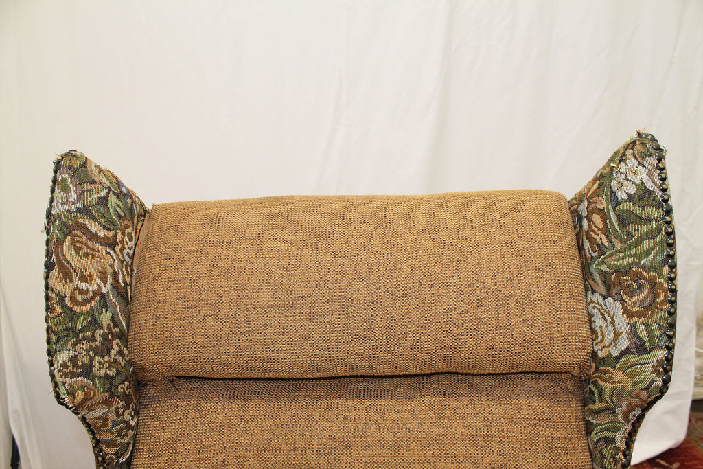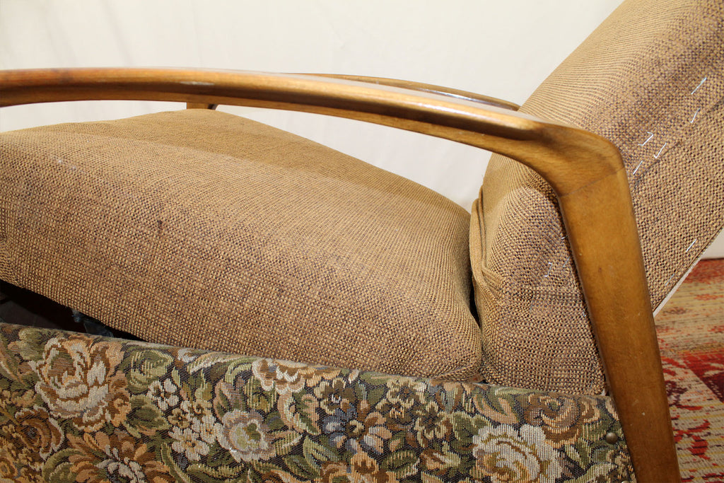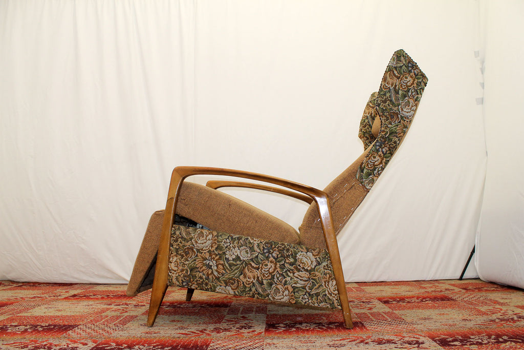 The chair is upholstered in fabric and the armrests are made of teak. The chair is very comfortable with a simple positioning system.