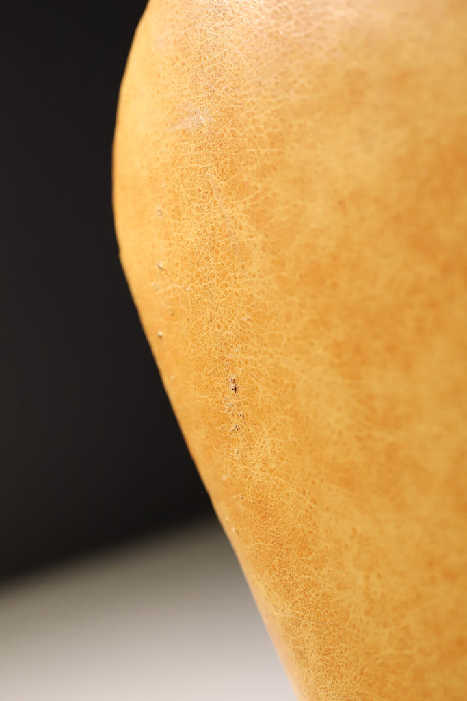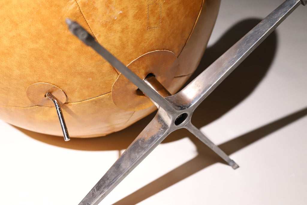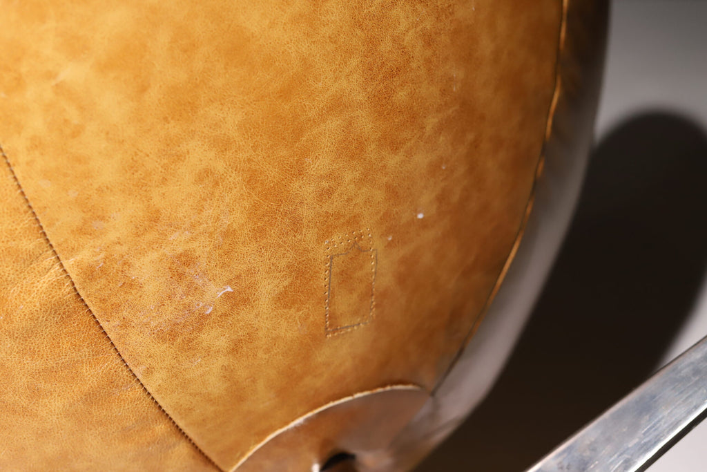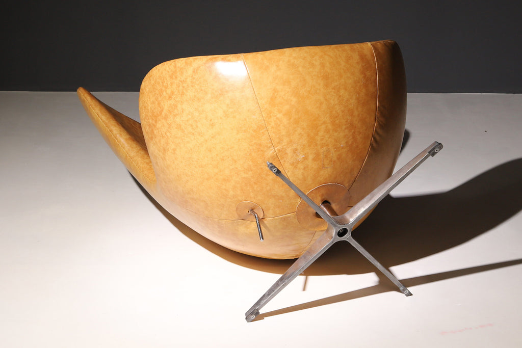 This one features a fiber glass shell with its original patinated cognac brown leather upholstery, four star aluminum base, swiveling and reclining function. This chair was made in the 1990's.