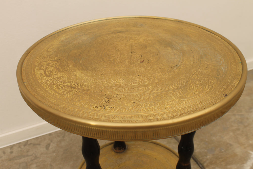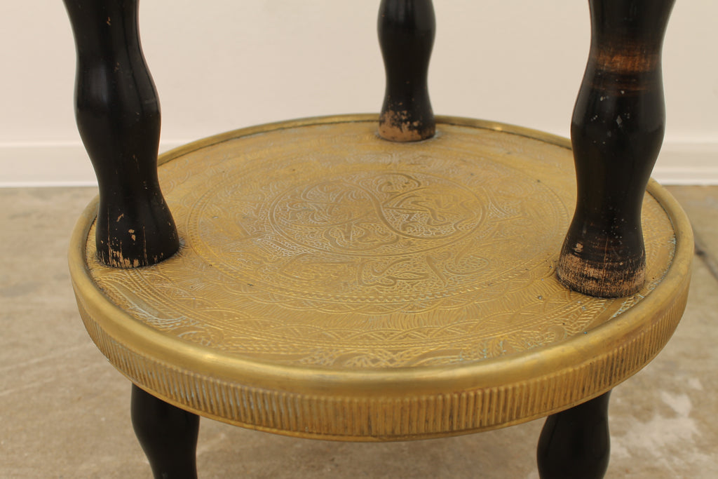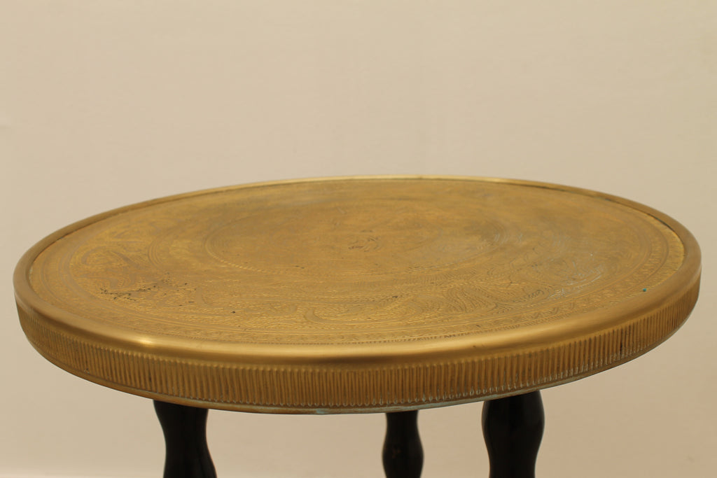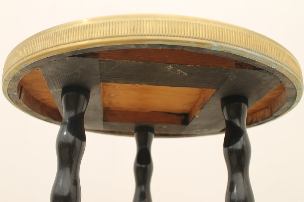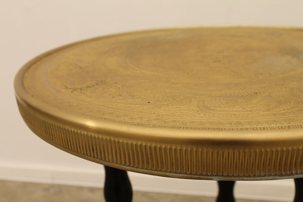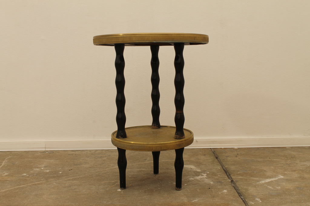 This midcentury side table was made around the 1930s and has a wooden structure, turned wavy walnut wooden legs painted black. The round table top is made of brass with engraved decorative motifs.