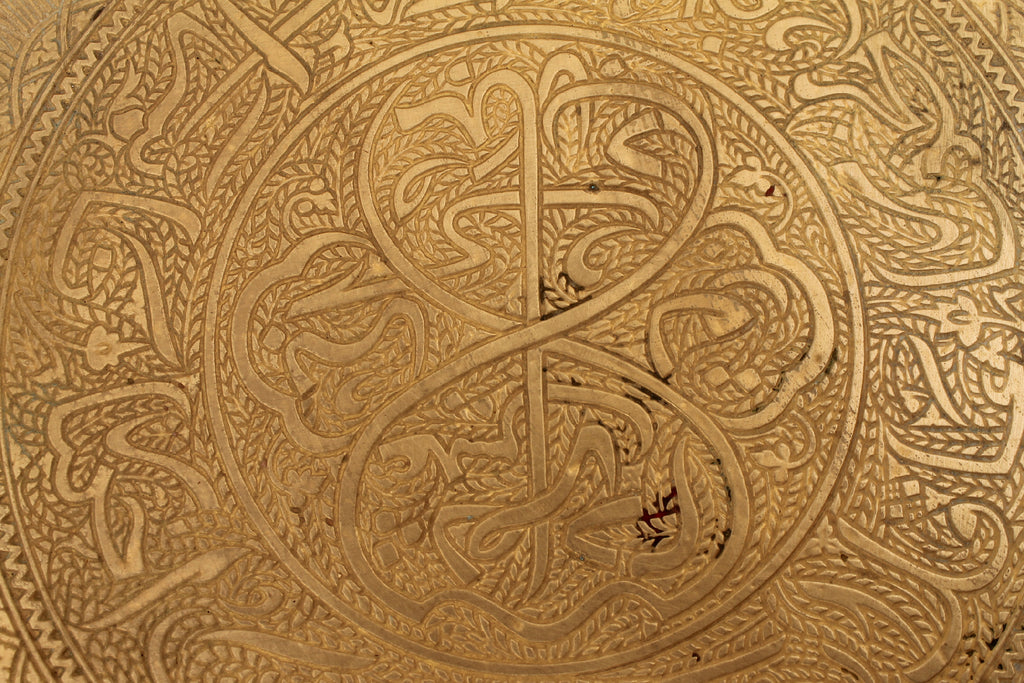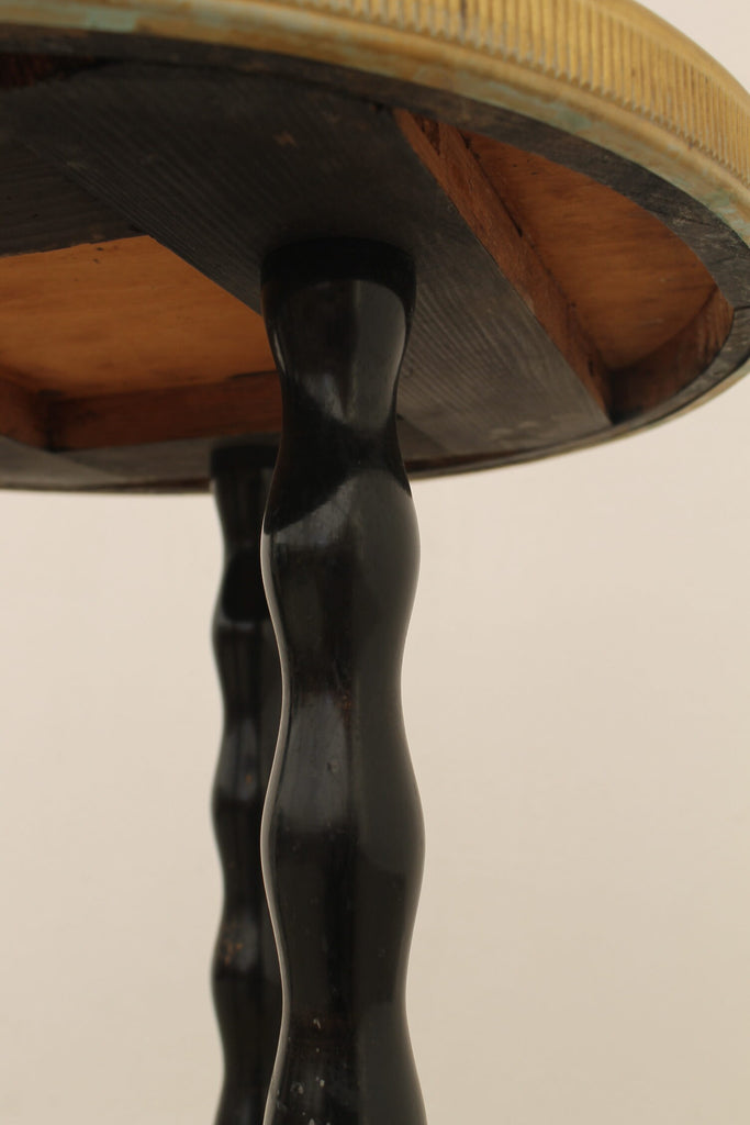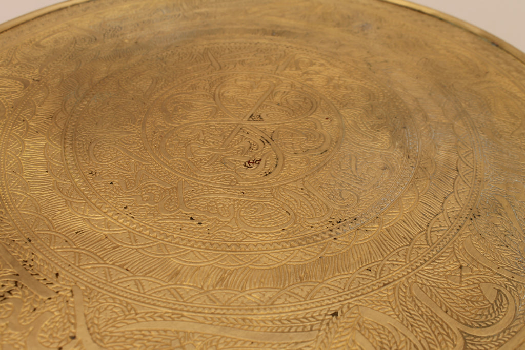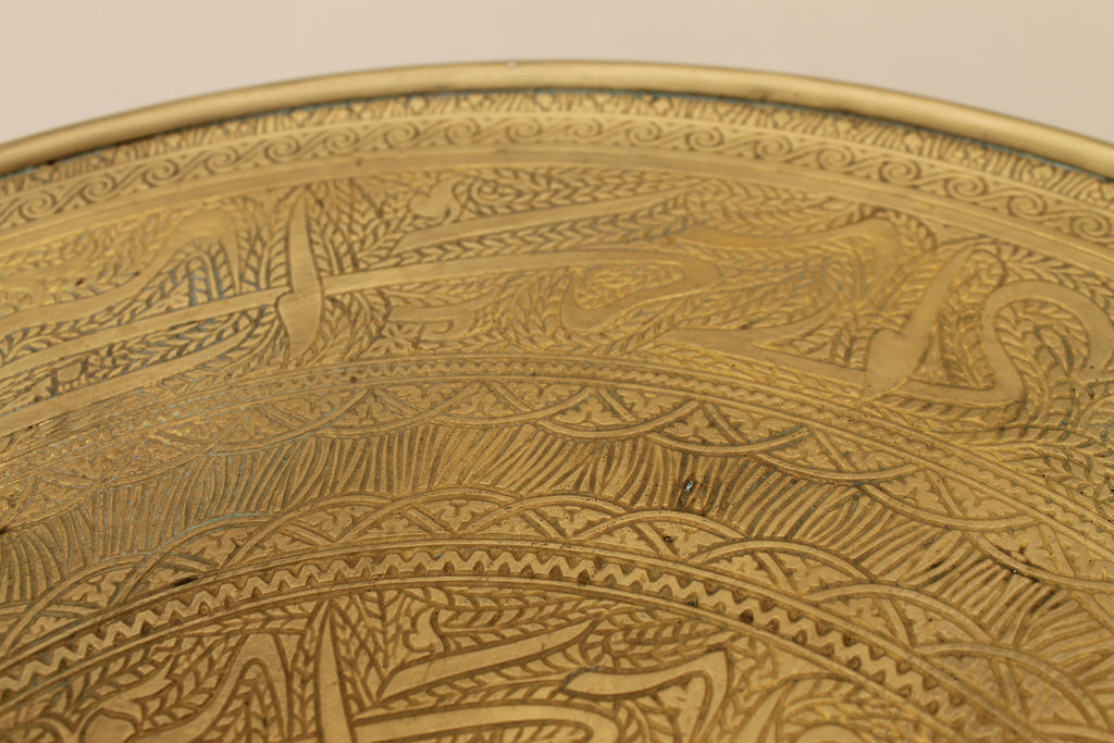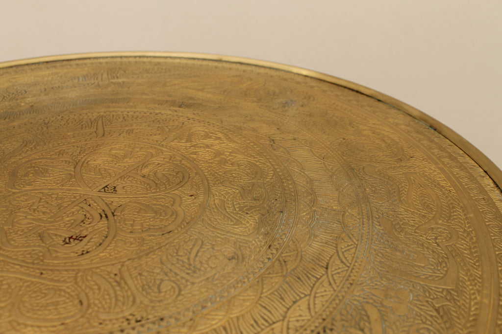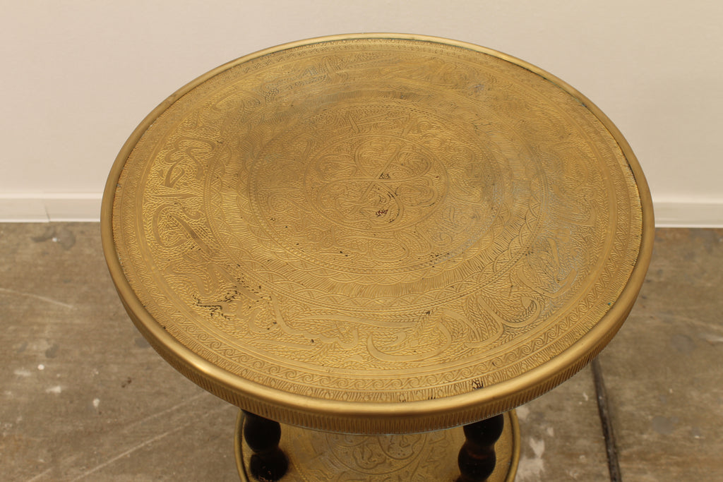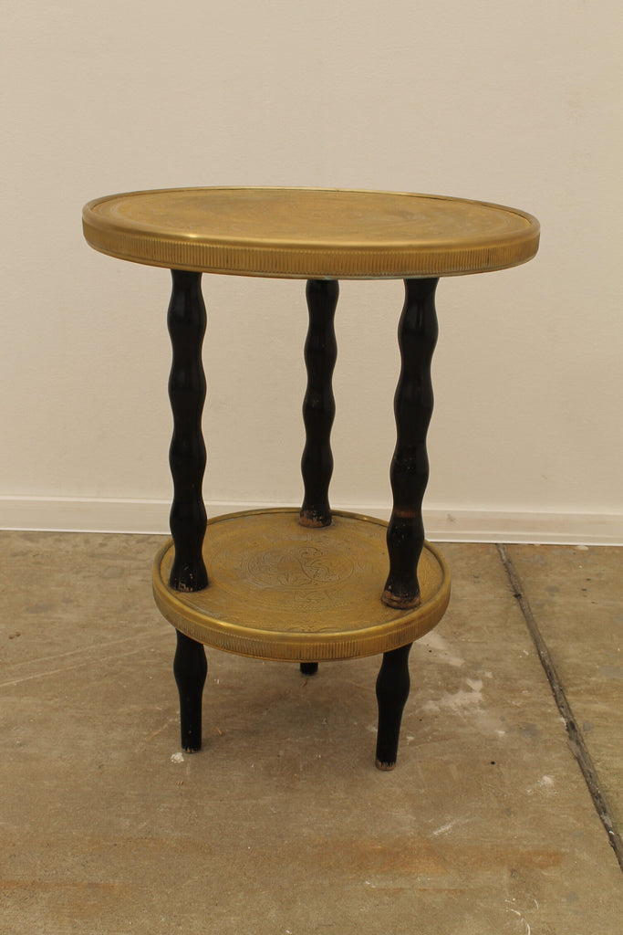 This midcentury side table was made around the 1930s and has a wooden structure, turned wavy walnut wooden legs painted black. The round table top is made of brass with engraved decorative motifs.