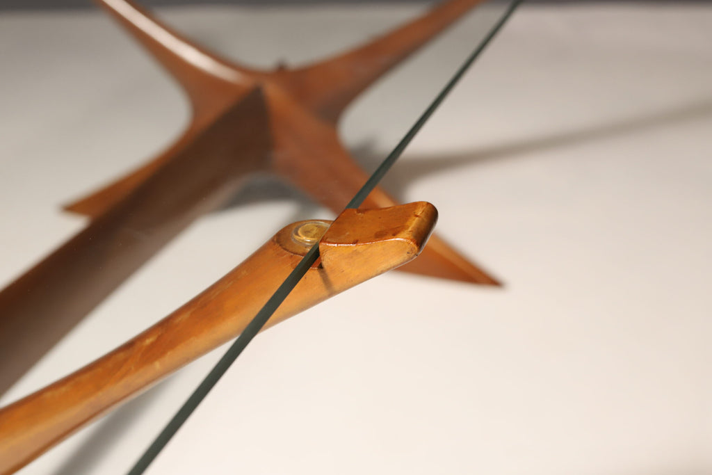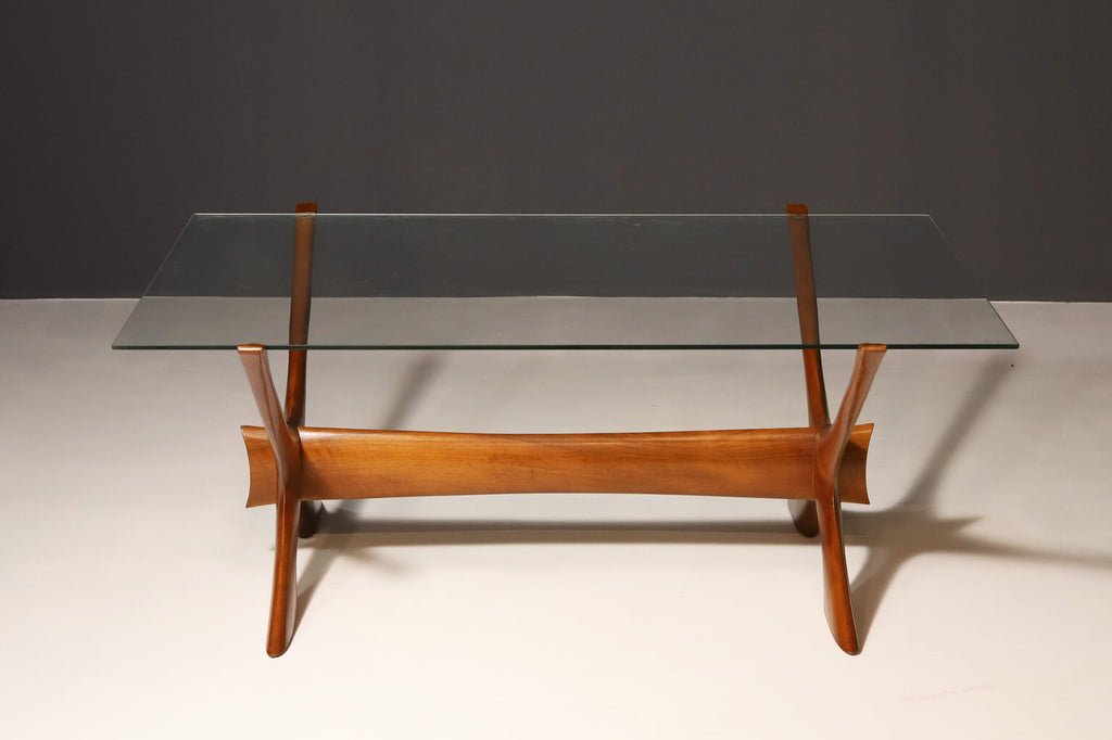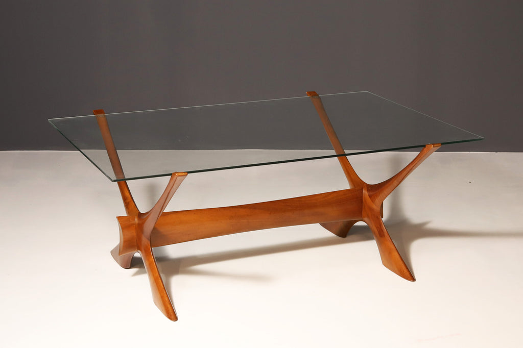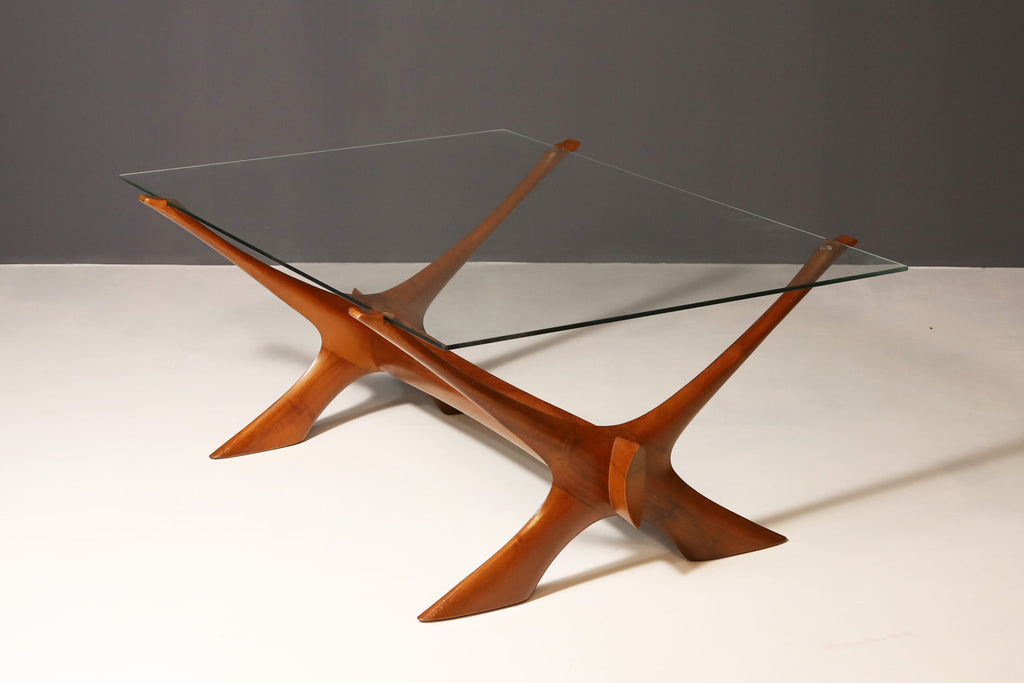 This organically sculptured Condor coffee table was designed by Fredrik Schriever-Abeln and manufactured by Örebro Glass in Sweden during the 1960s. The X-shape base was handcrafted from solid walnut. The distinct frame is contrasted by a linear smoked glass top. This piece has a beautiful and timeless design. This furniture is in original vintage condition.