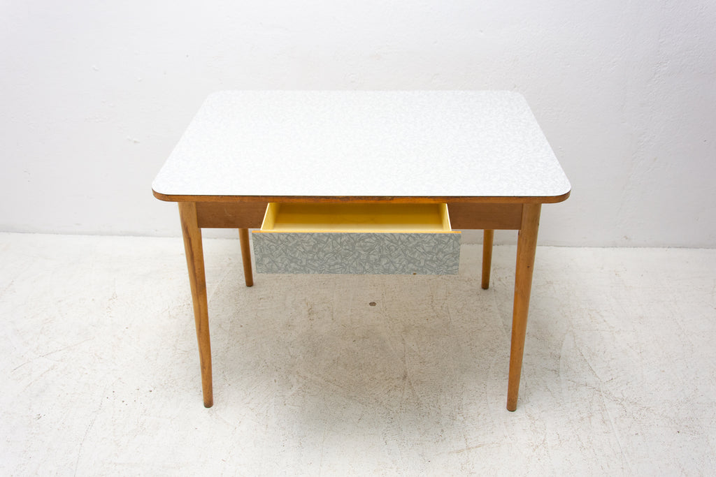 Mid Century central table with a formica plate, beech legs and one drawer. It can be used as a writing desk as well. It was made in the former Czechoslovakia in the 1960´s. In well preserved Vintage condition, shows signs of age and using.