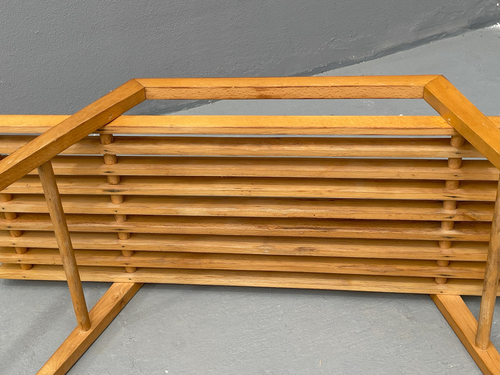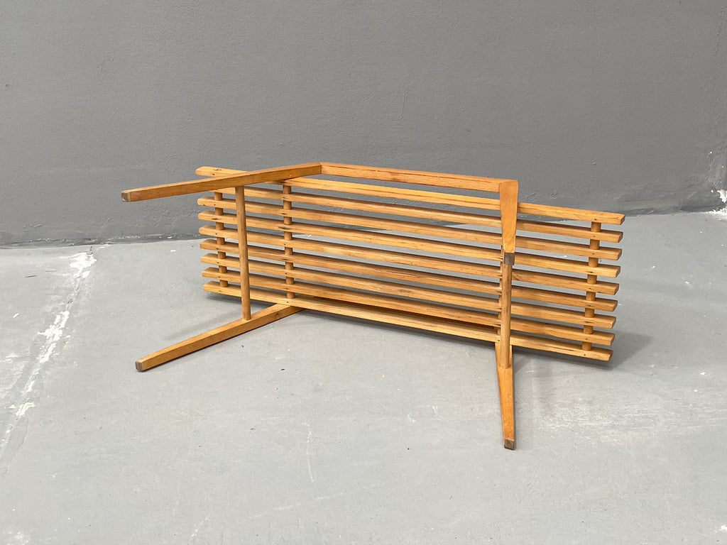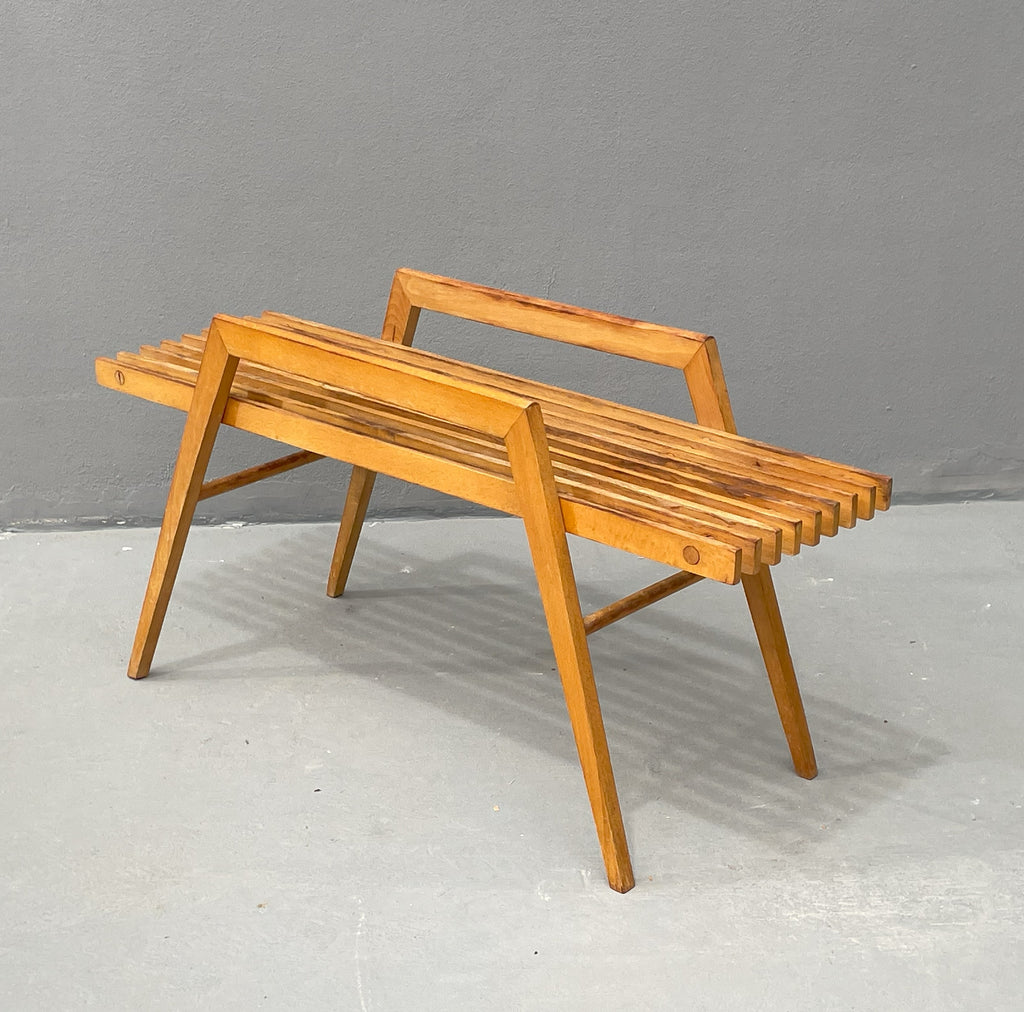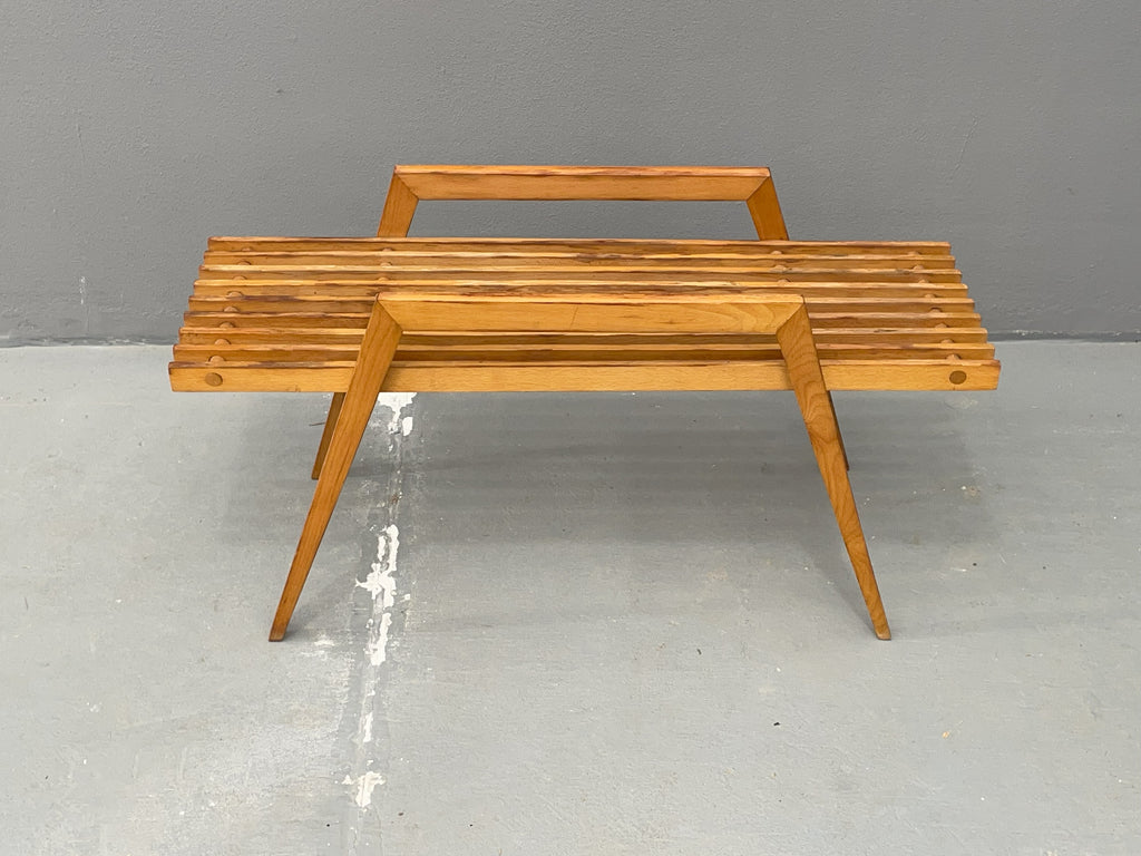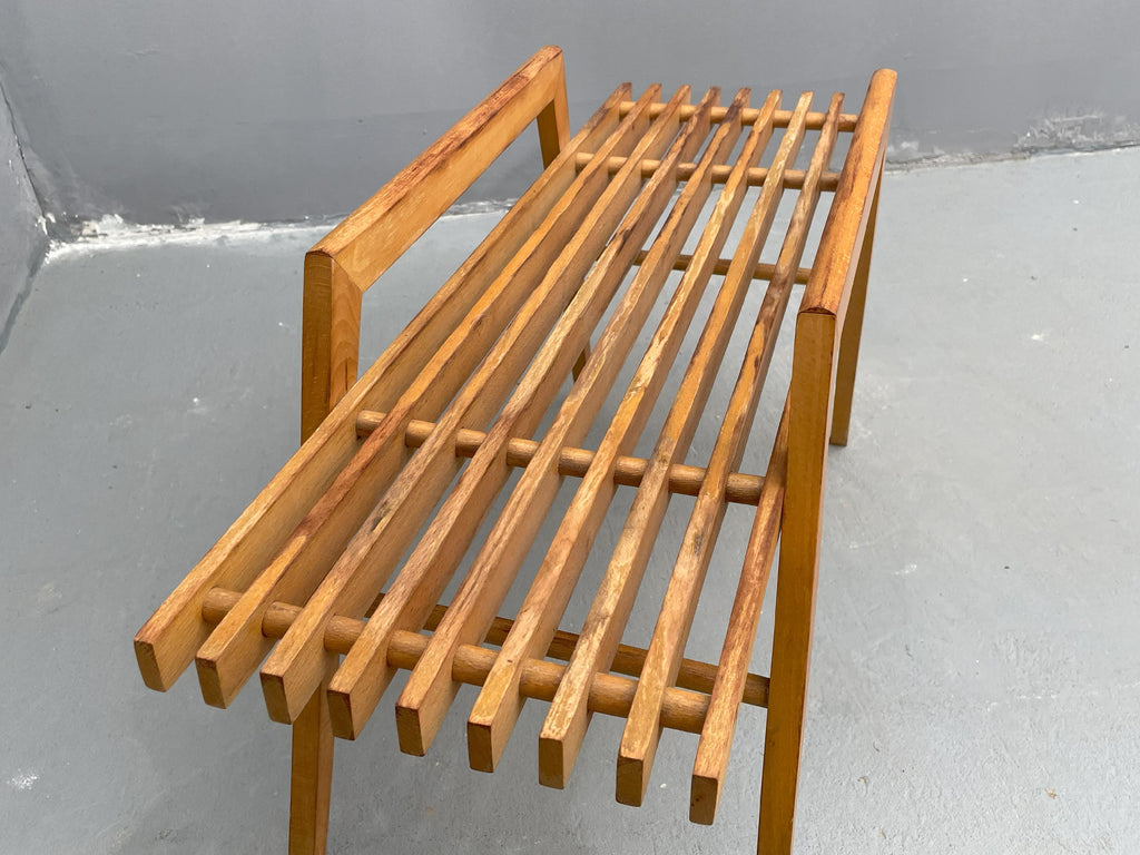 We offer a stylish beech flower stand by ULUV, crafted in Czechoslovakia during the 1970s. This unique piece is made of solid beech wood and features a distinctive, geometric design that complements both modern and retro interiors. The stand is in very good original condition, showing minimal signs of wear and retaining a beautiful natural patina. A perfect choice as a decorative piece or a functional plant display stand.