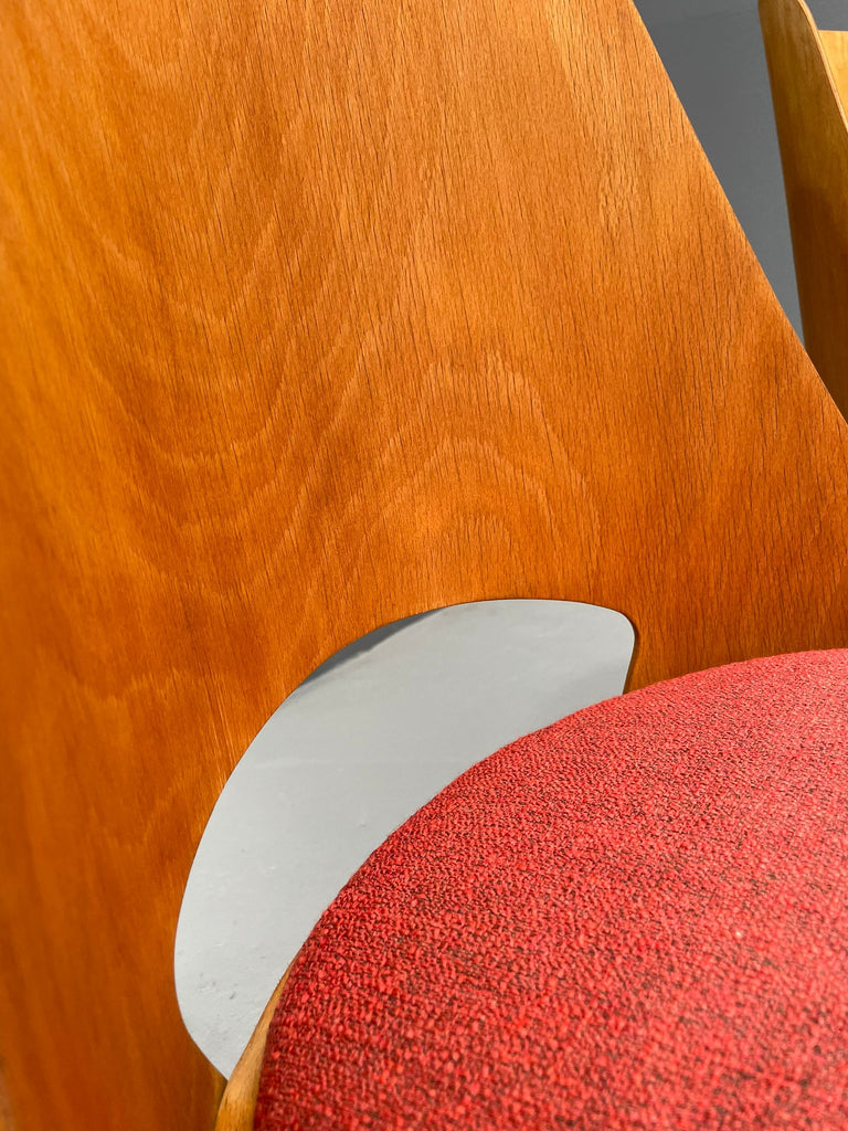 These chairs feature a classic mid-century silhouette with a curved plywood backrest and shaped seat. The original upholstery is intact – a textured red fabric that pairs well with the light tone of the beech wood frame. The structure is solid, and the chairs are in good vintage condition with natural patina and light wear consistent with age.