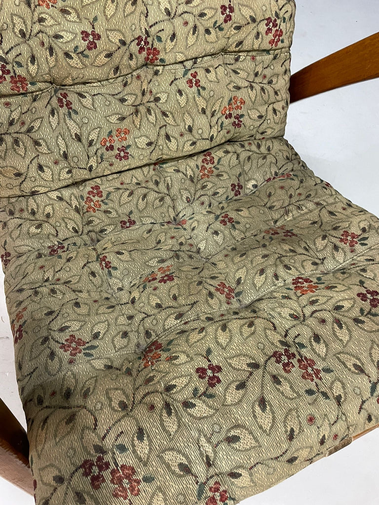Featuring a clean wooden frame with a gently sloped backrest, sculptural armrests, and original removable cushions in floral upholstery.