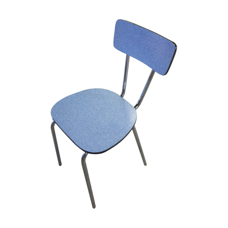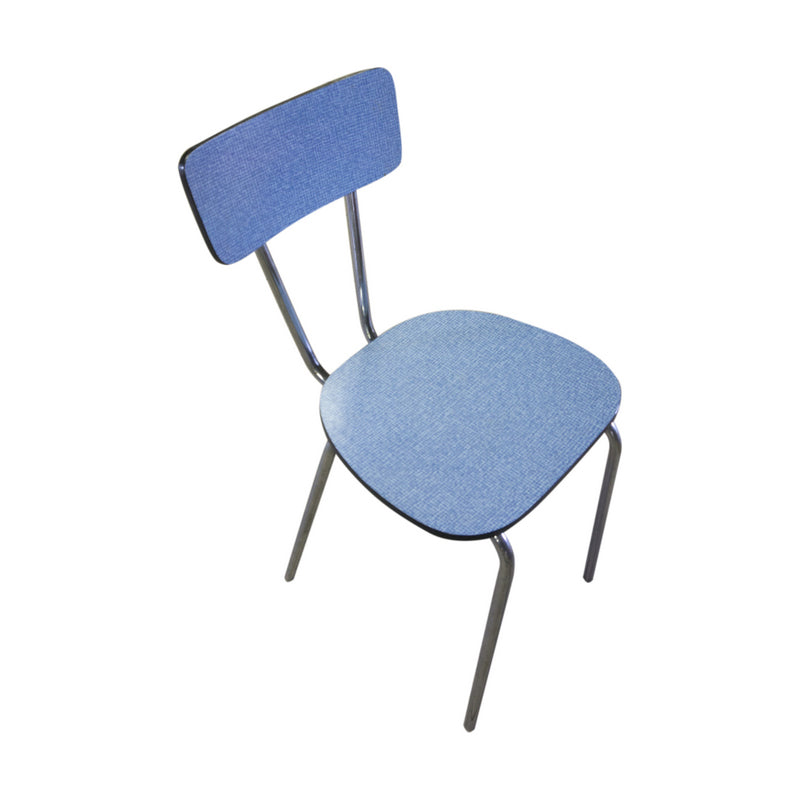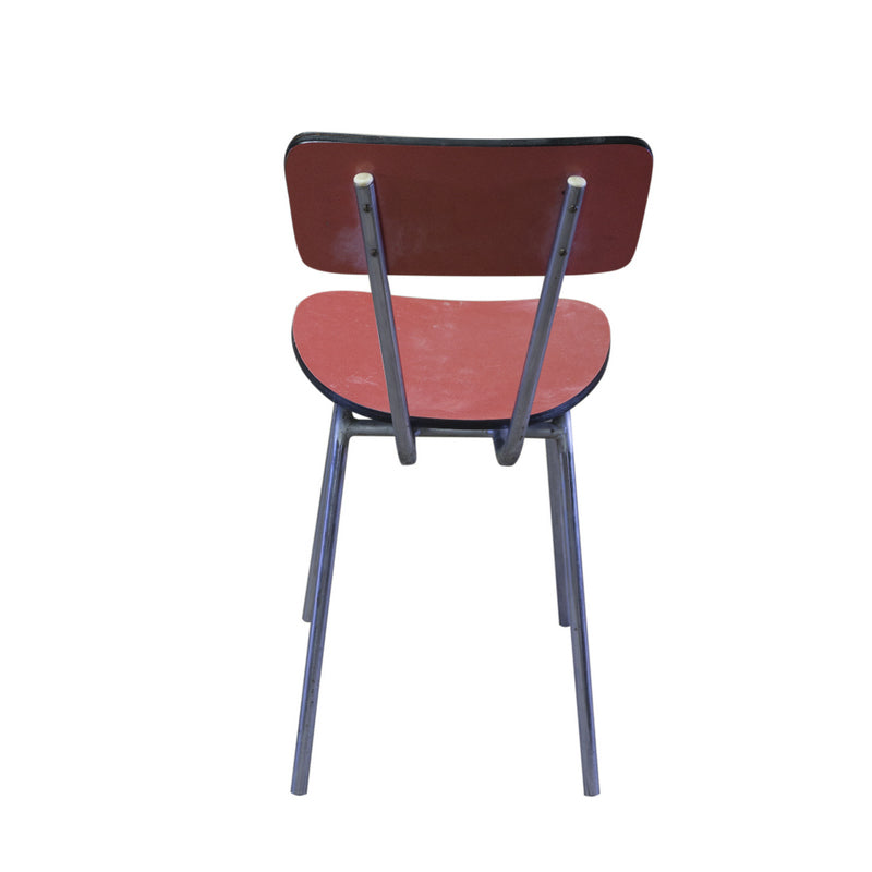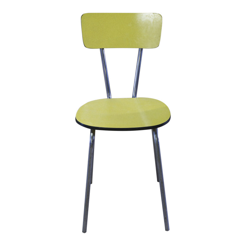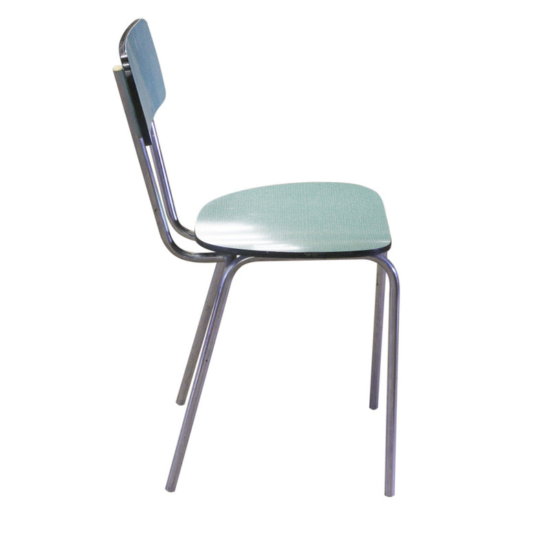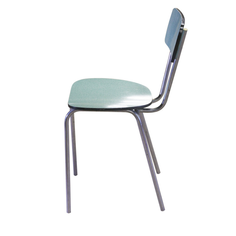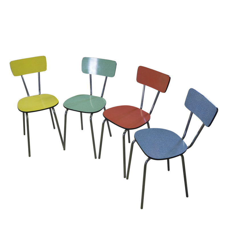 French coloured formica cafe or dining chairs with chrome legs. circa 1960's. Great condition. Price is for the set of four.
