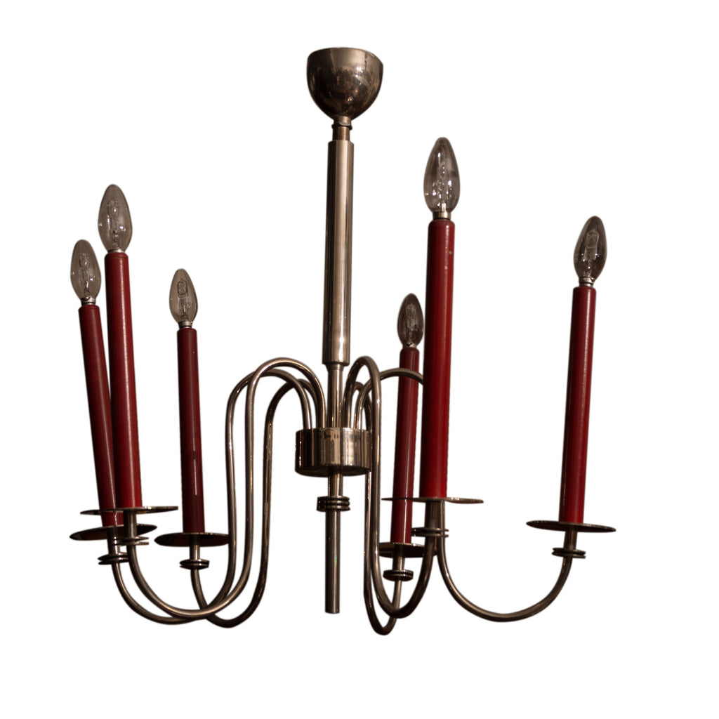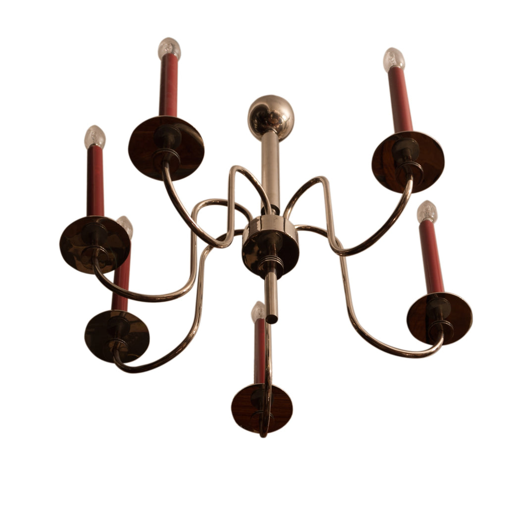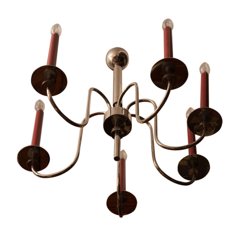 Six-arm chromed chandelier, circa 1930´s. It is possible to set the positioning of each arm. Chromed base metal. Fully functional. Dimensions: height 70 cm, width 50 cm.