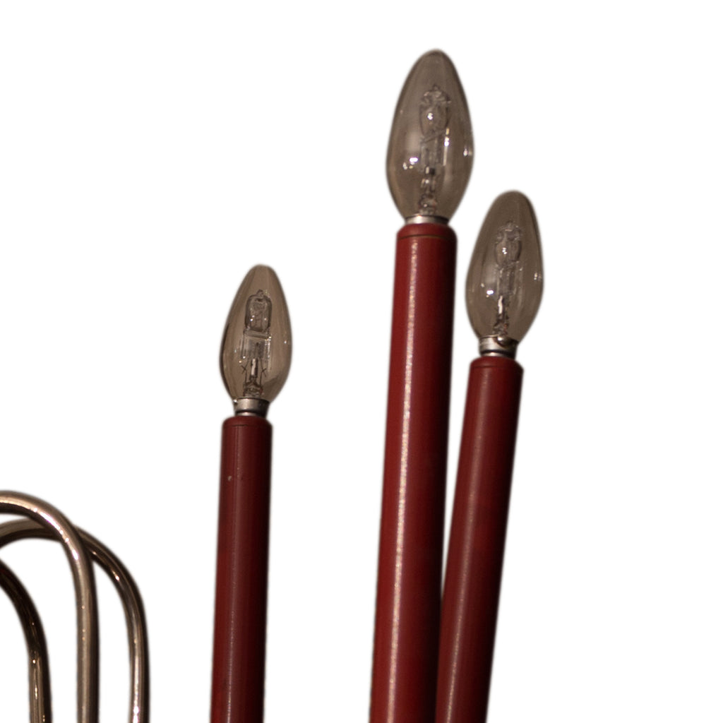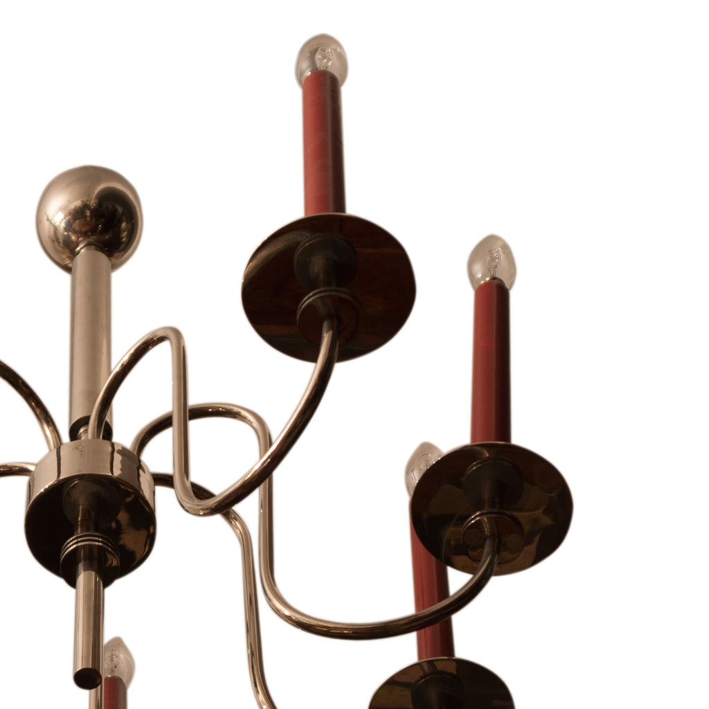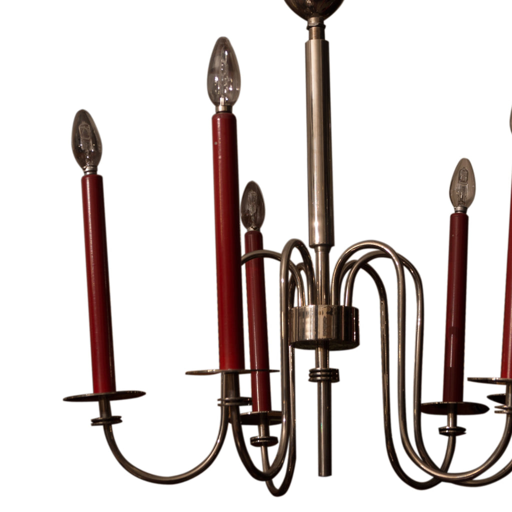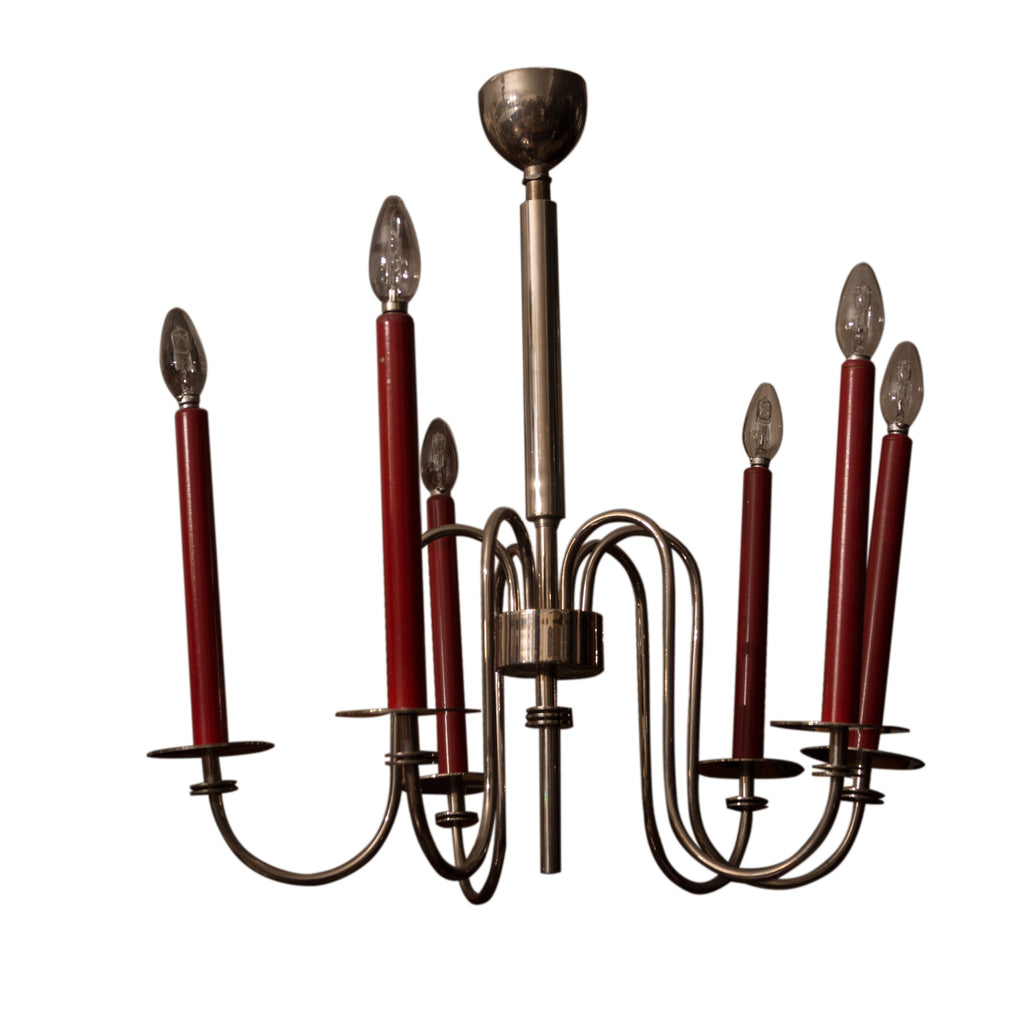 Six-arm chromed chandelier, circa 1930´s. It is possible to set the positioning of each arm. Chromed base metal. Fully functional. Dimensions: height 70 cm, width 50 cm.