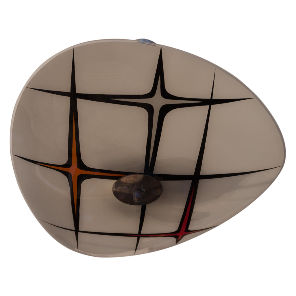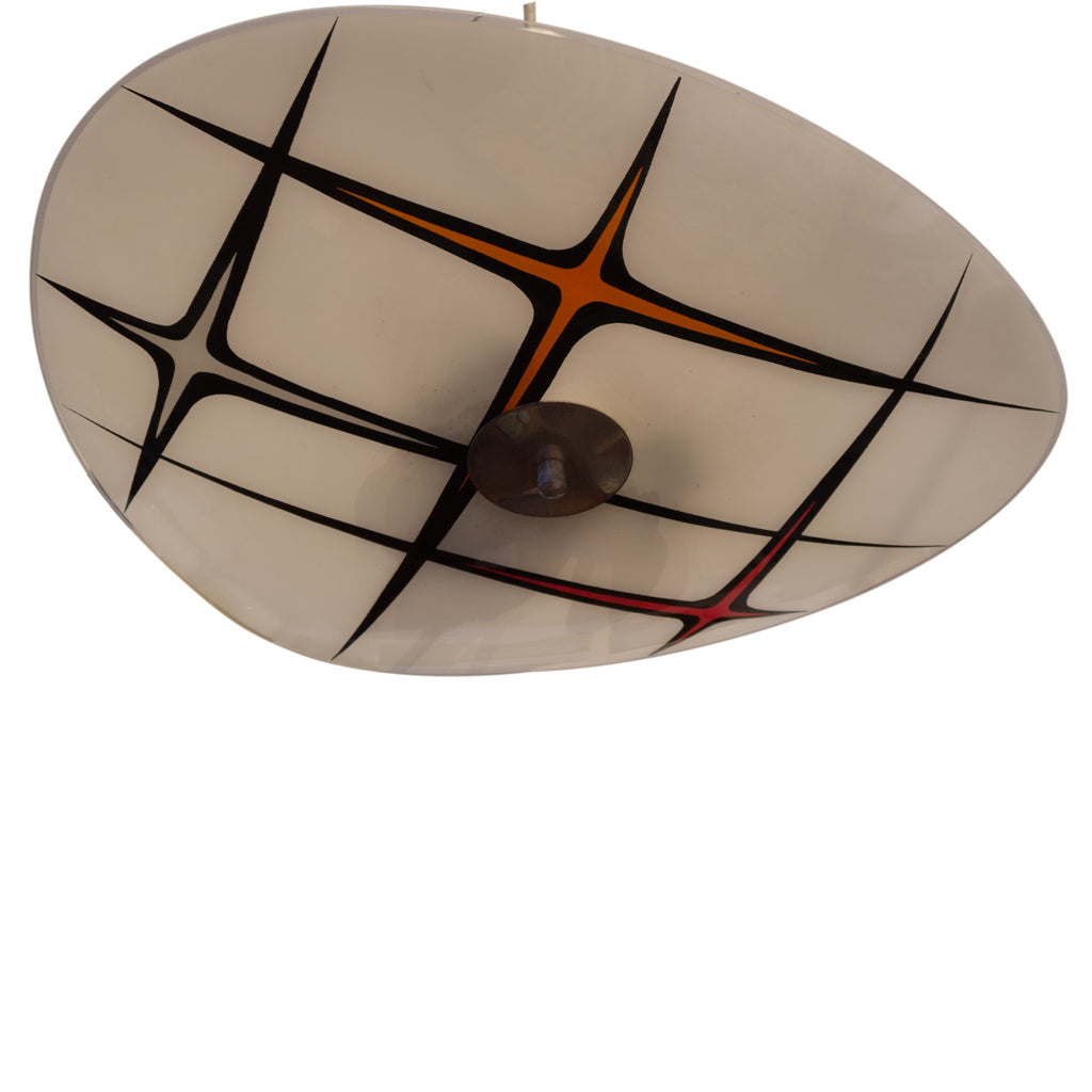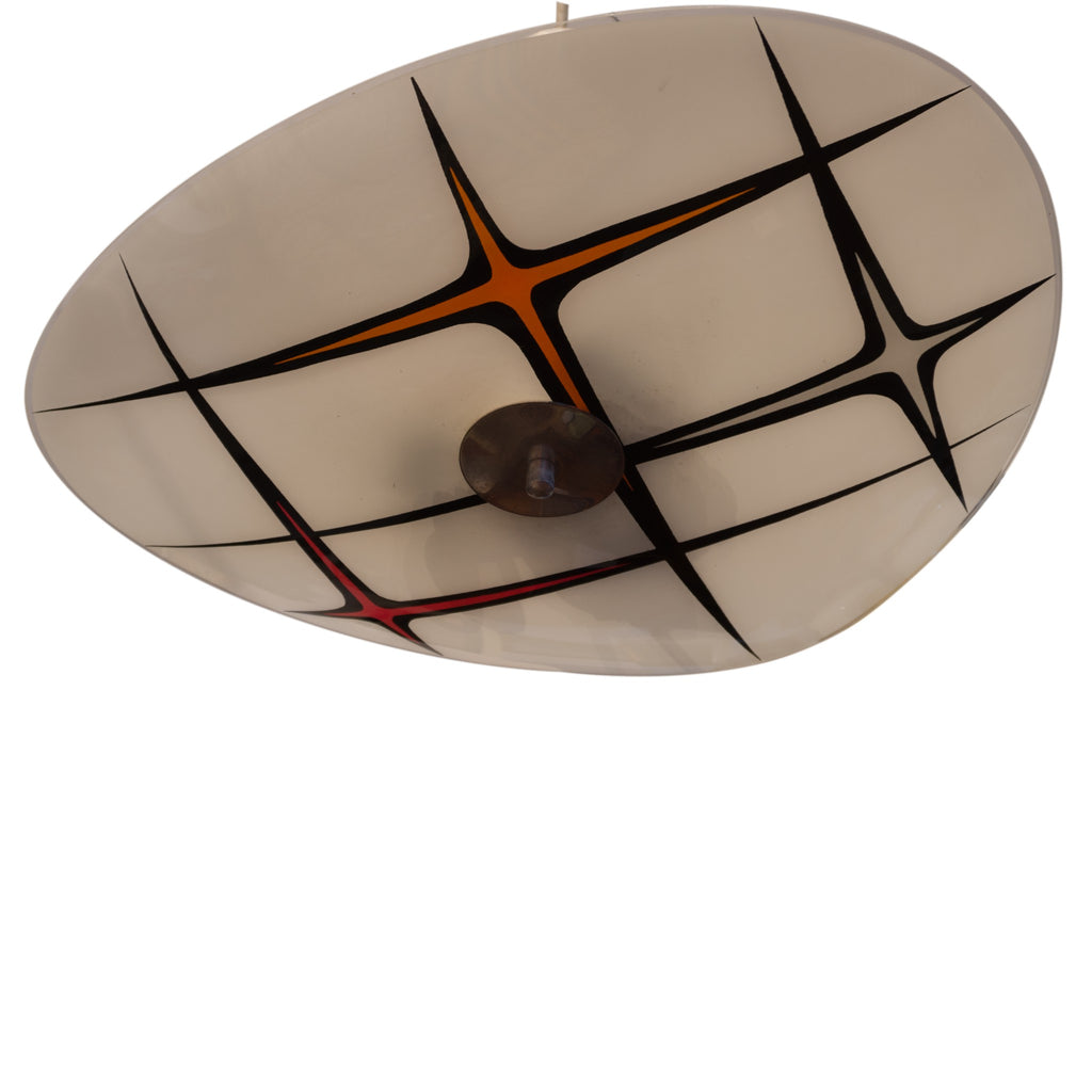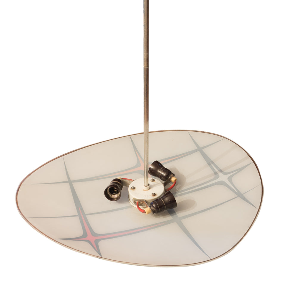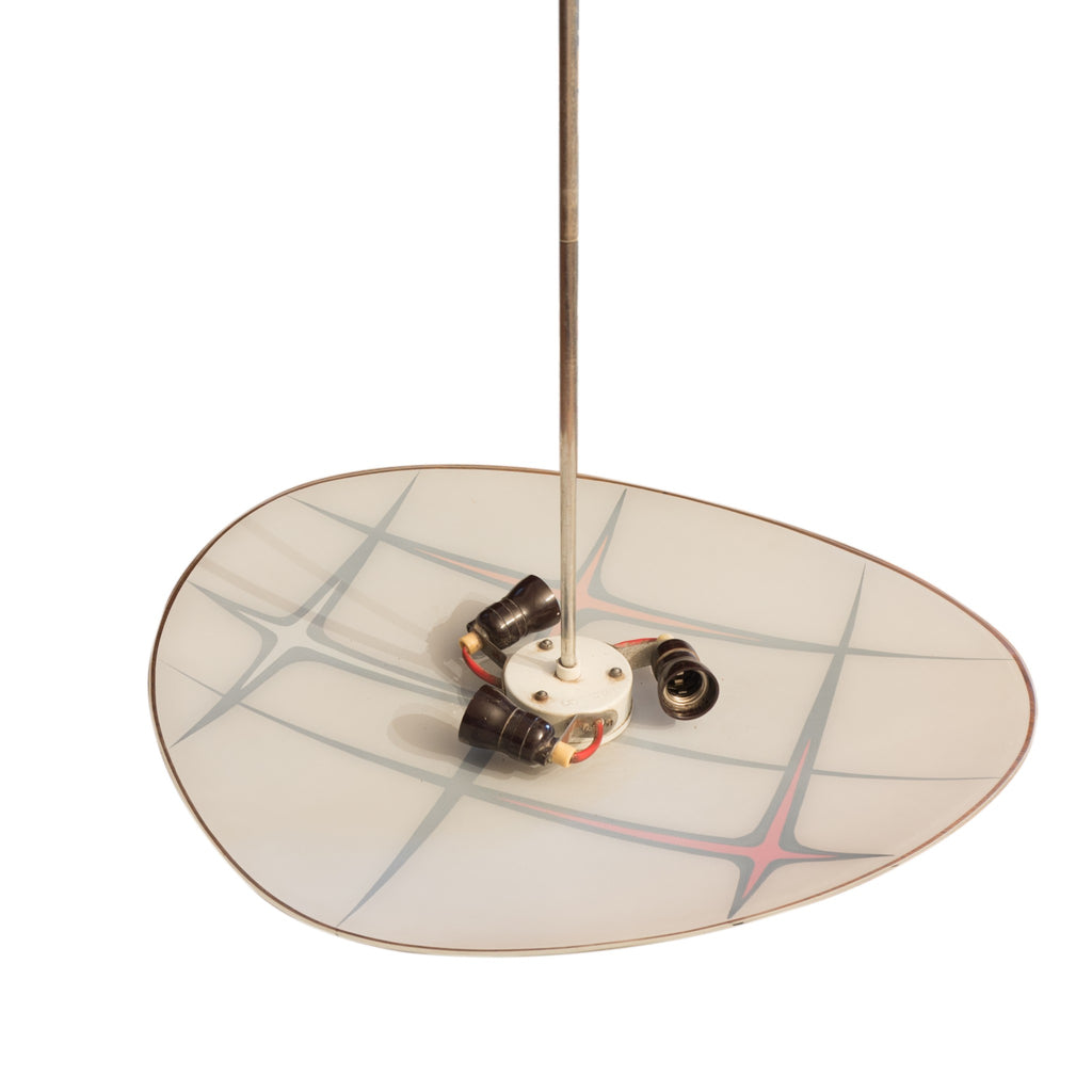 Popular chandelier from the turn of the 50s and 60s, connected with the EXPO 58 exhibition in Brussels. Awesome design. Painted motifs. Without damage. Chrome-plated rod. Fully functional. Original electrics. Dimensions: 60X50 cm.