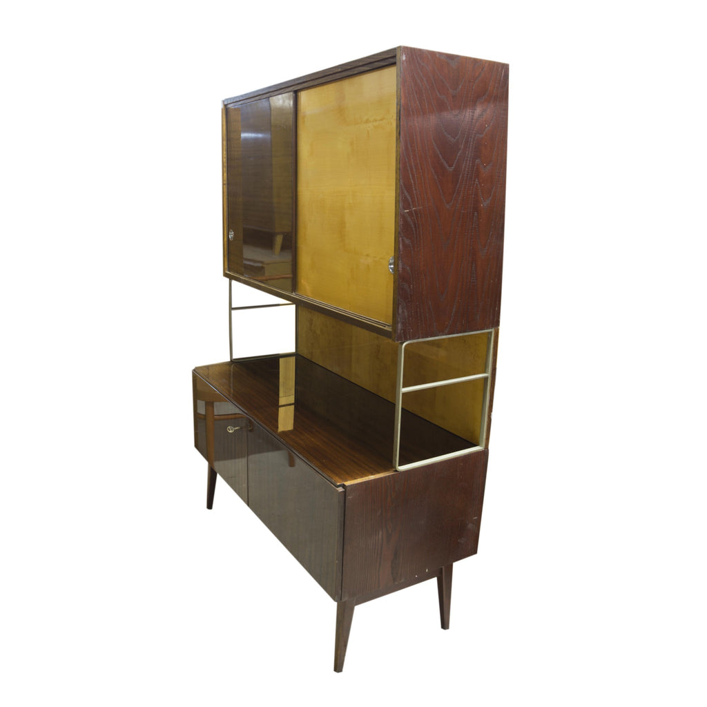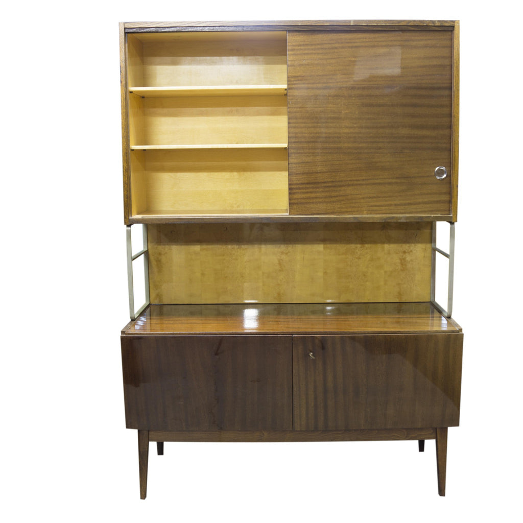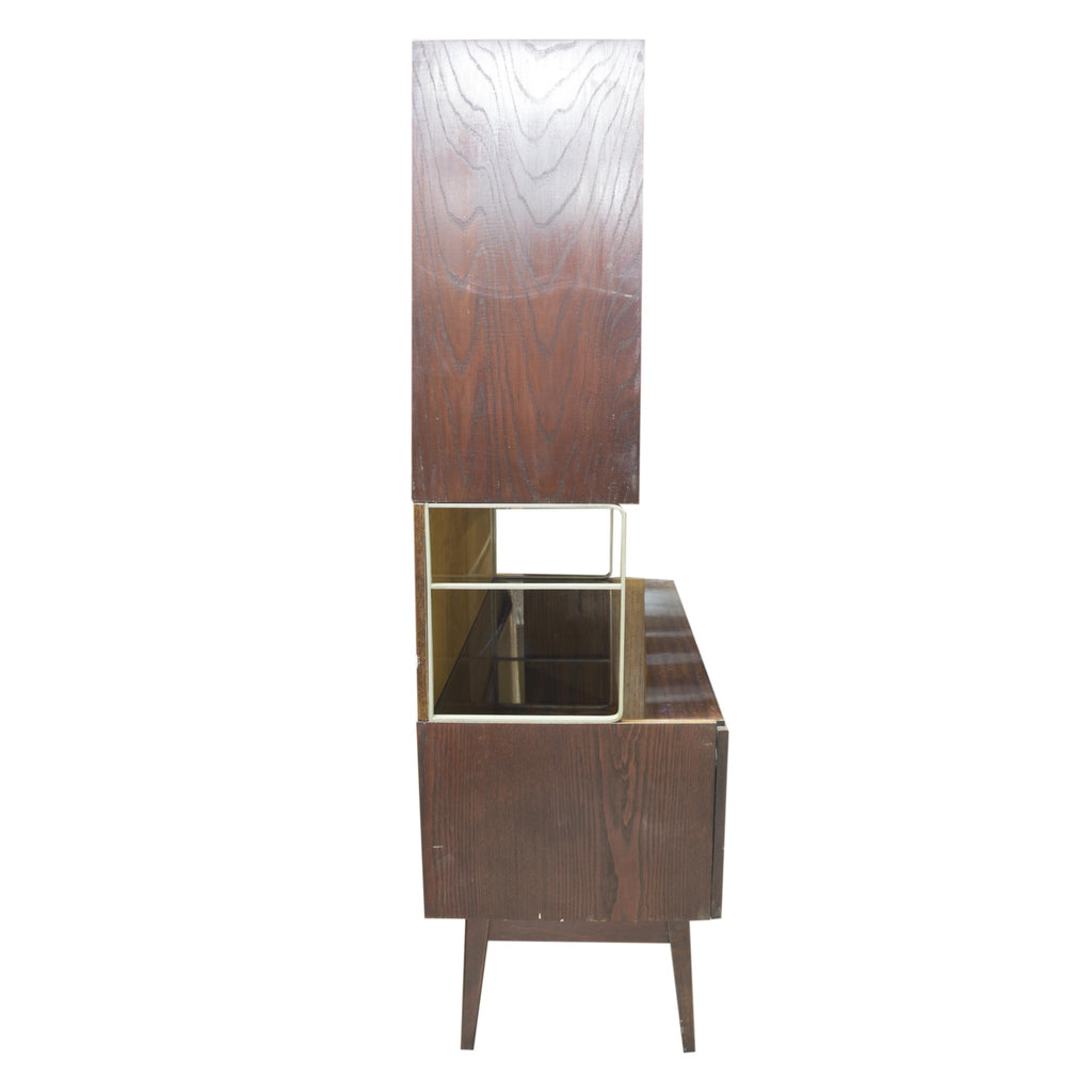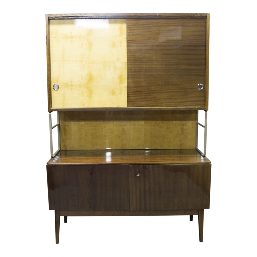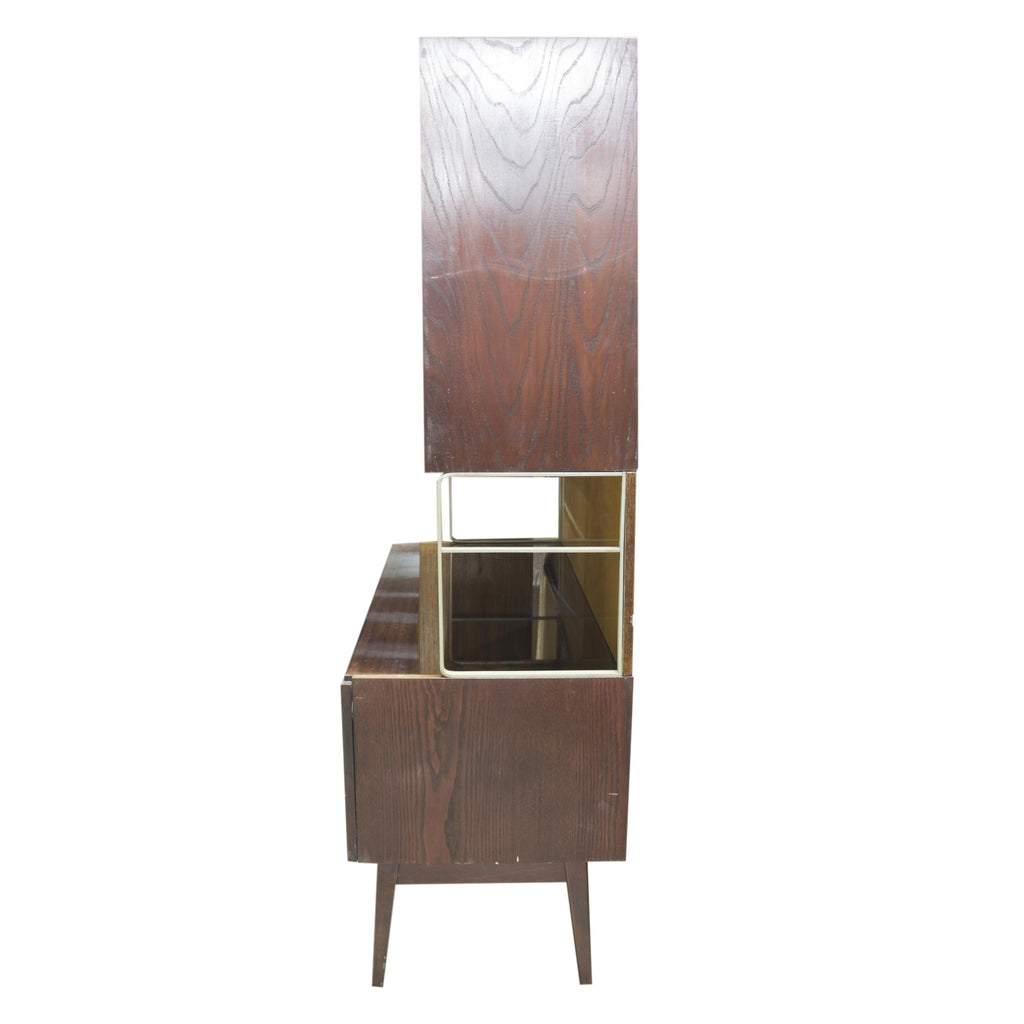 Czechoslovakia, 1970's. Beautiful modern piece of furniture. This piece has two sections. The bottom with doors, opening to reveal two shelves. The top section with sliding doors and shelves. Chromed steel structural supports in the mid-section. Polished rosewood veneer. Very good condition.