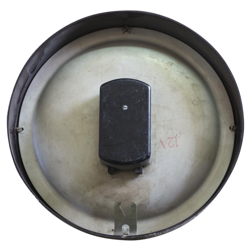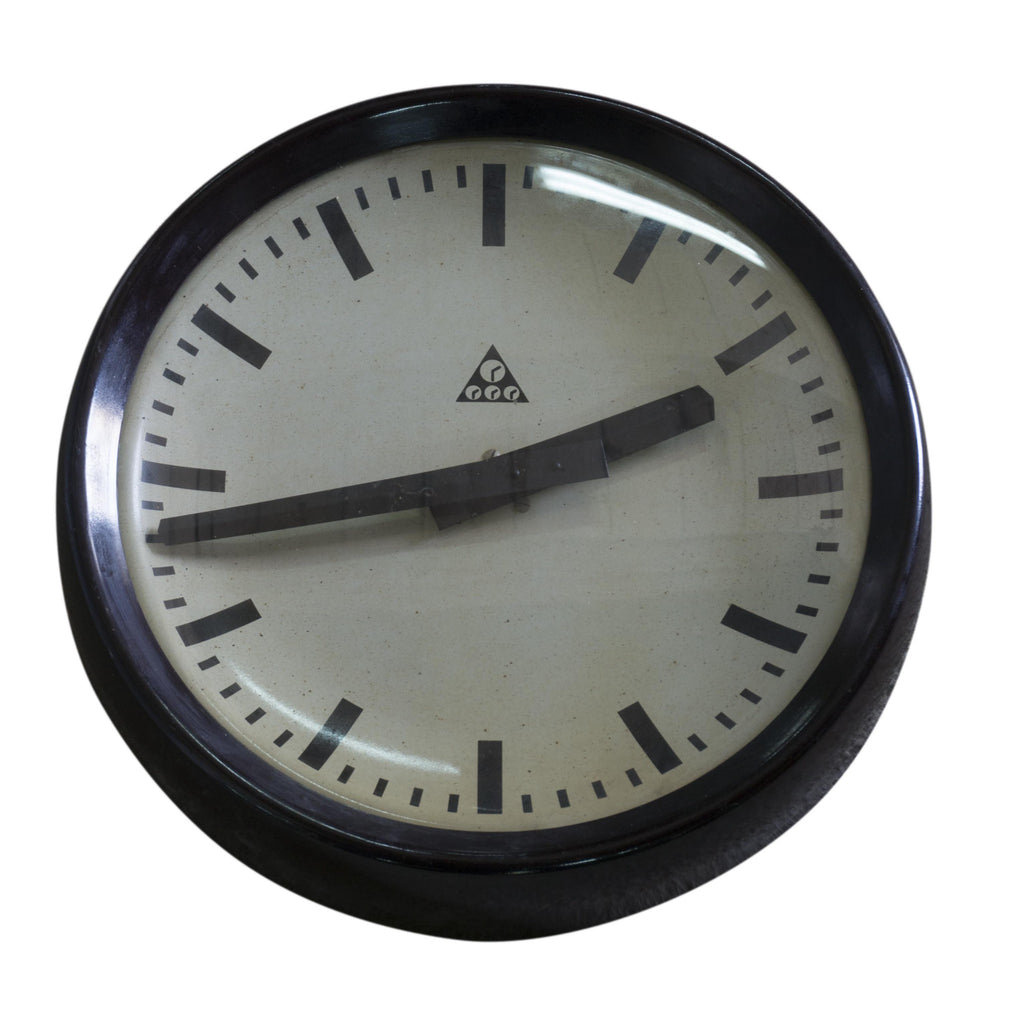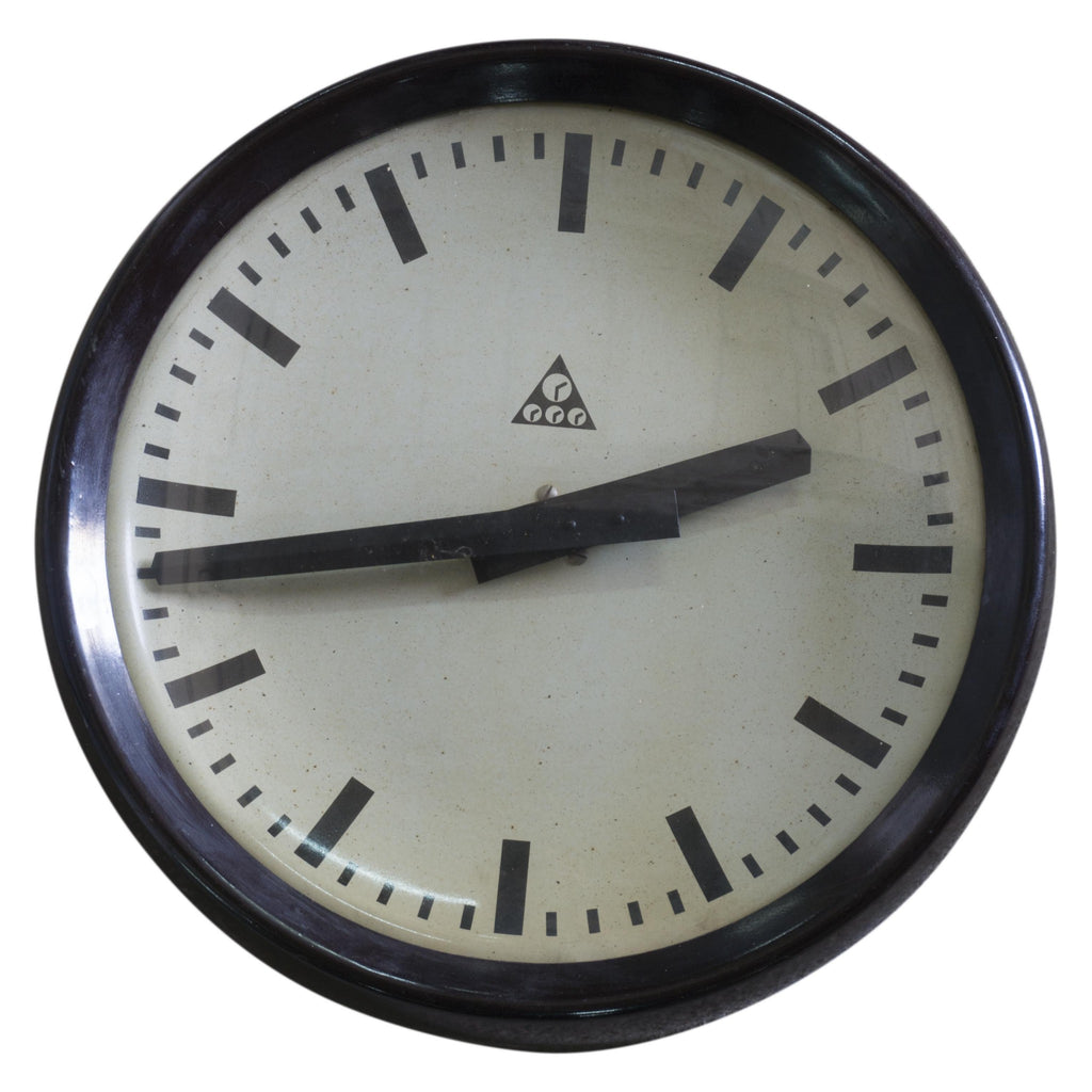 A large cold war era clock, often found in railway stations, factories and schools. Timeless industrial design with echoes of the Eastern Bloc.