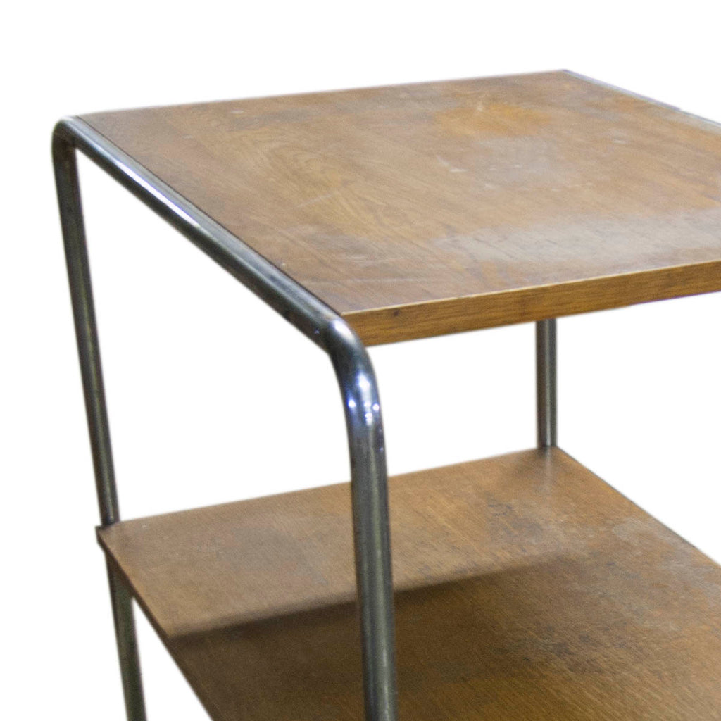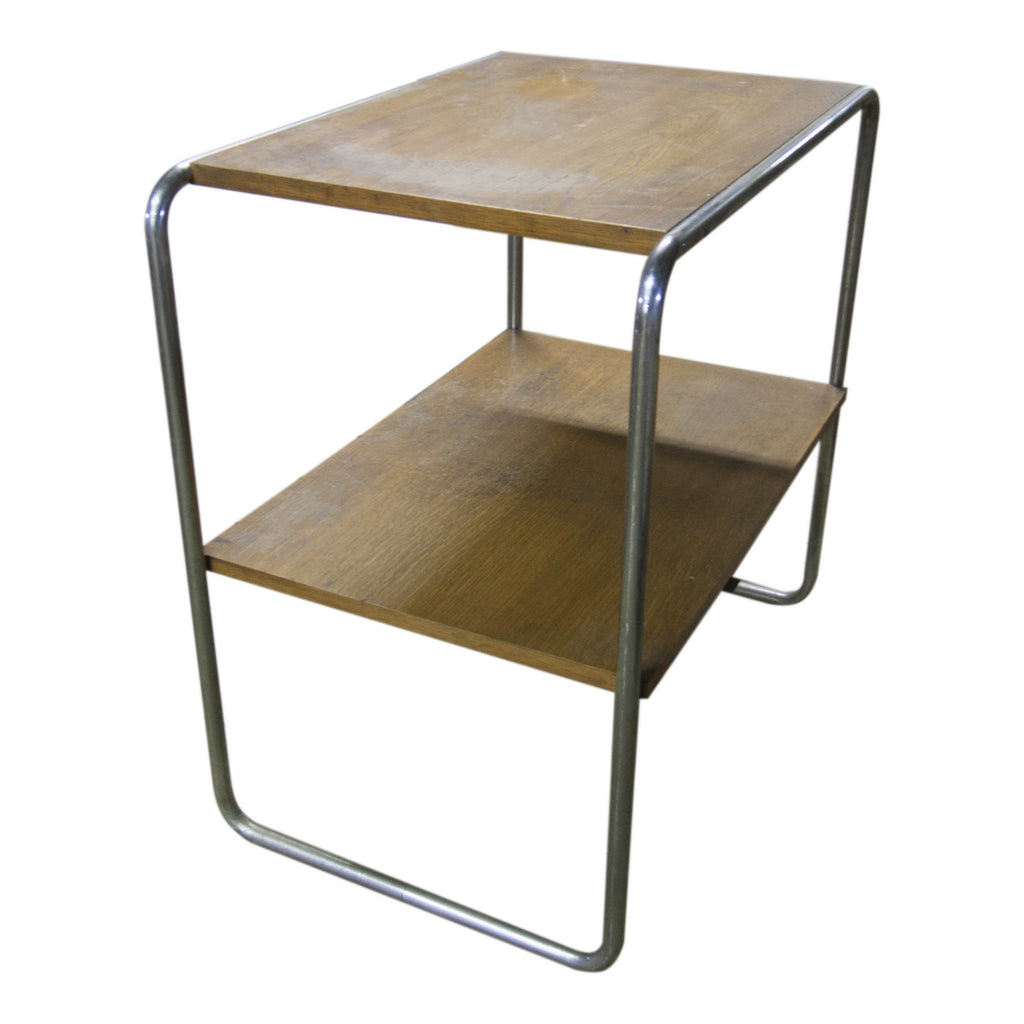 A chromium plated side table in the manner of Marcel Breuer, Bauhaus period, 1930´s, made in Bohemia. chromium-plated base metal, wooden boards, size 70x70x46 cm, in original Vintage condition.