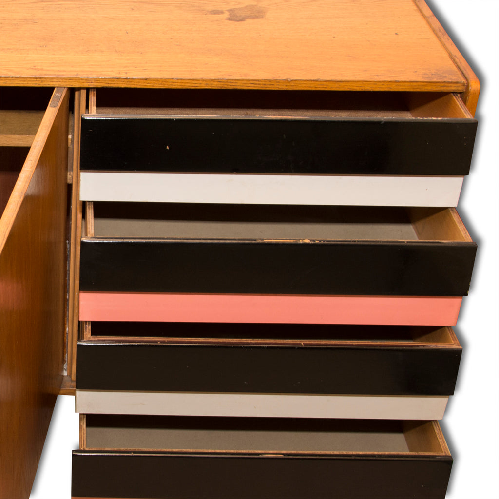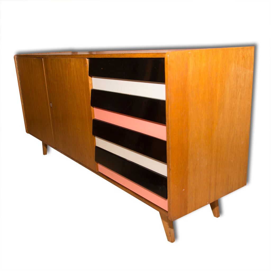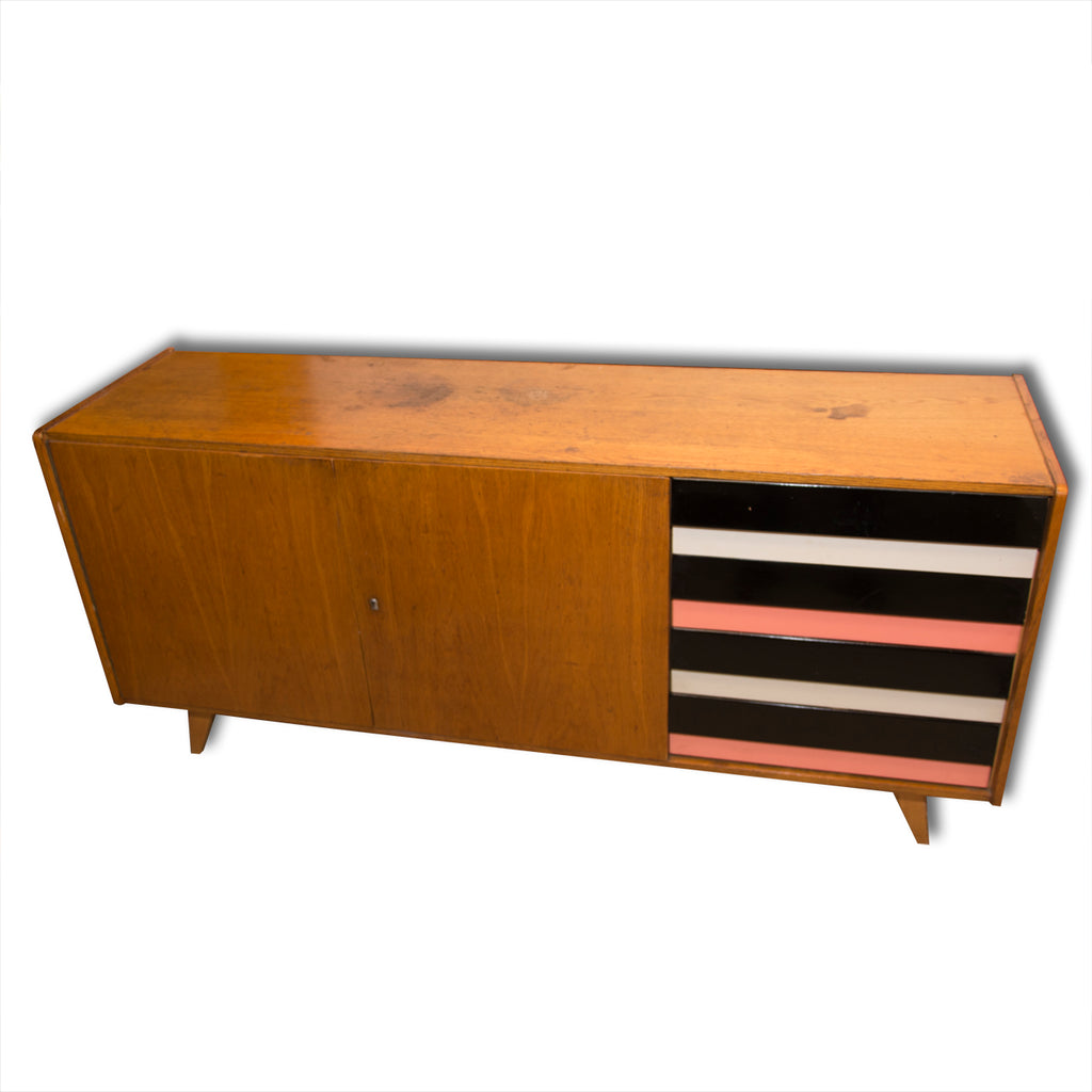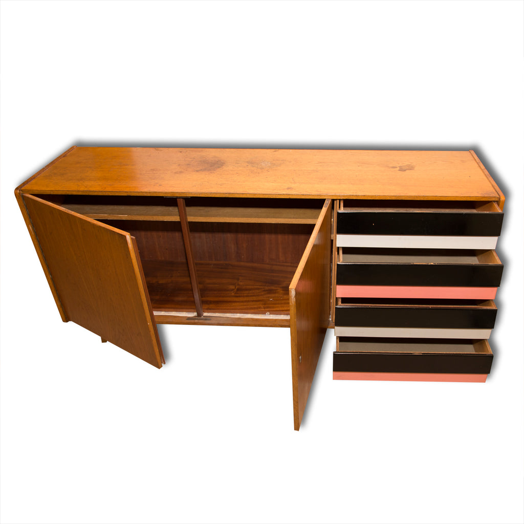 Designed by Jiri Jiroutek. Czechoslovakia. Beechwood, plywood. Colored lacquered drawers. The wooden structure is in its original condition. This sideboard remains fully functional, but it shows sign of age through scuffs, dings or faded finishes. An abrasions and scratches in the context of age and use.
