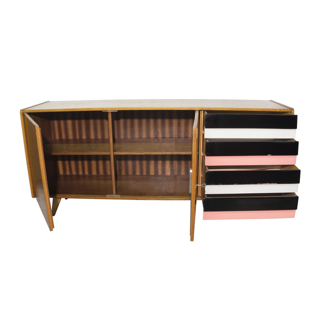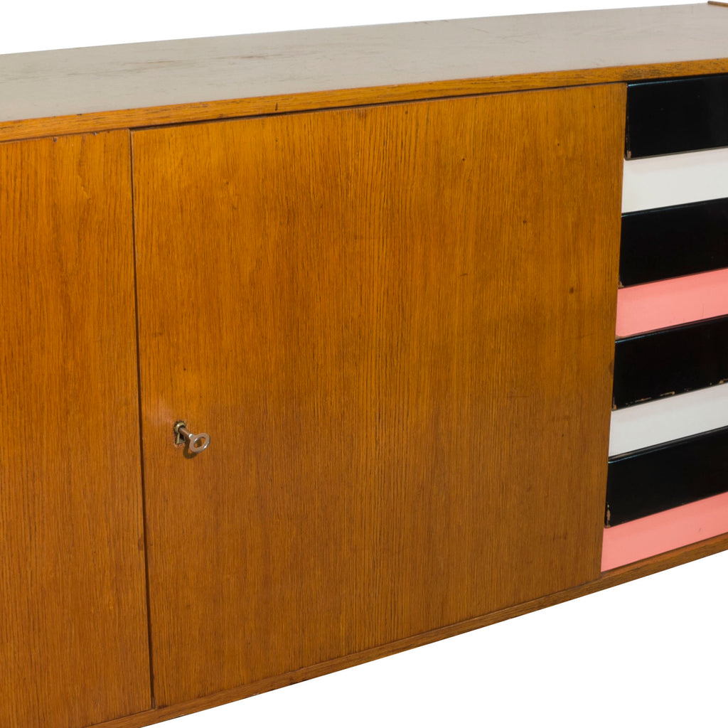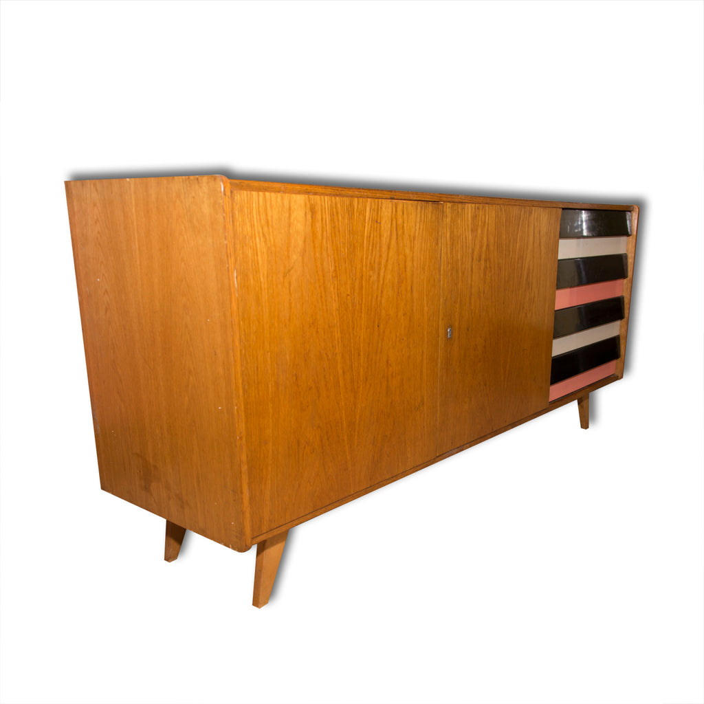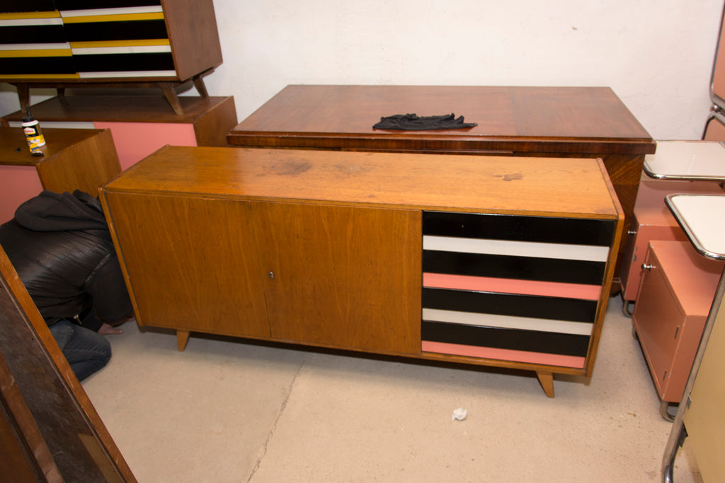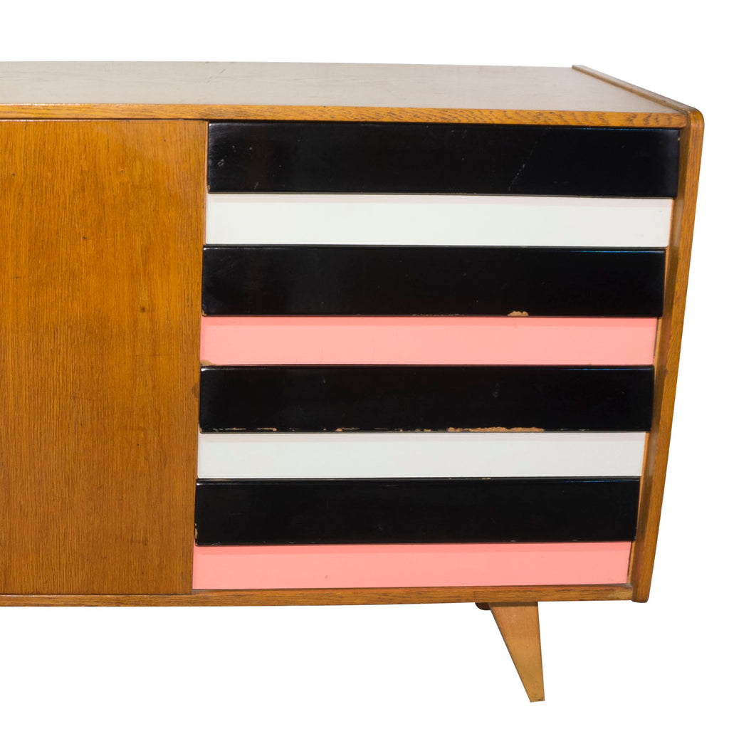 Designed by Jiri Jiroutek. Czechoslovakia. Beechwood, plywood. Colored lacquered drawers. The wooden structure is in its original condition. This sideboard remains fully functional, but it shows sign of age through scuffs, dings or faded finishes. An abrasions and scratches in the context of age and use.