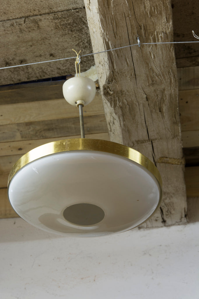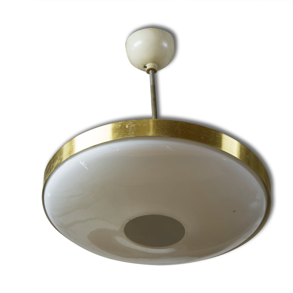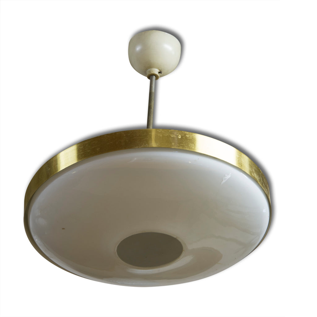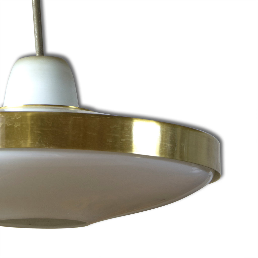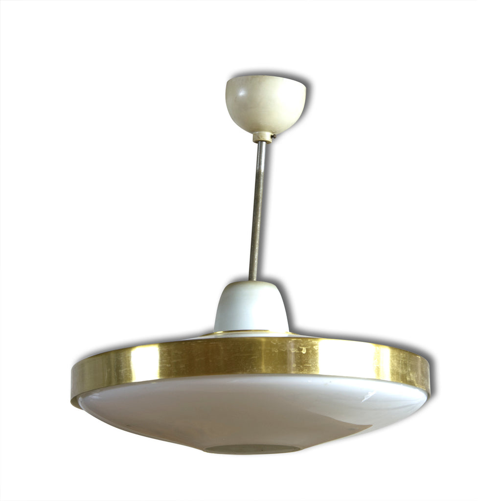 Mid century pendant "UFO", 1960´s. Material: metal, milky glass, brass, chromium plated rod.