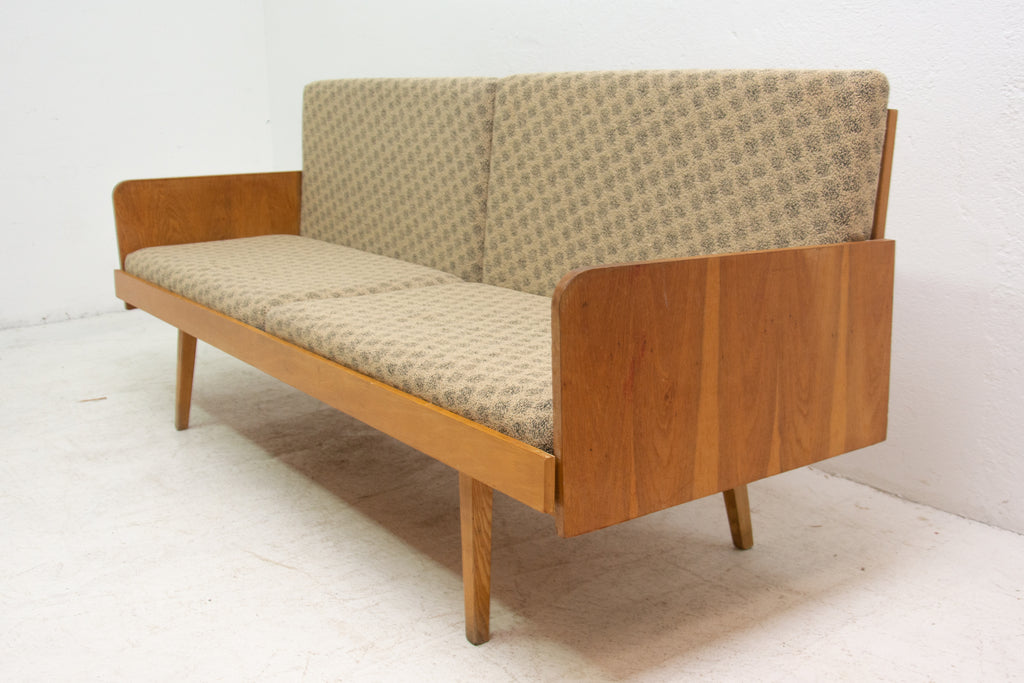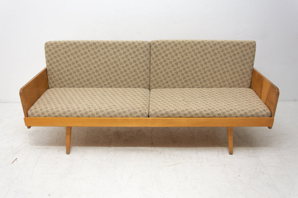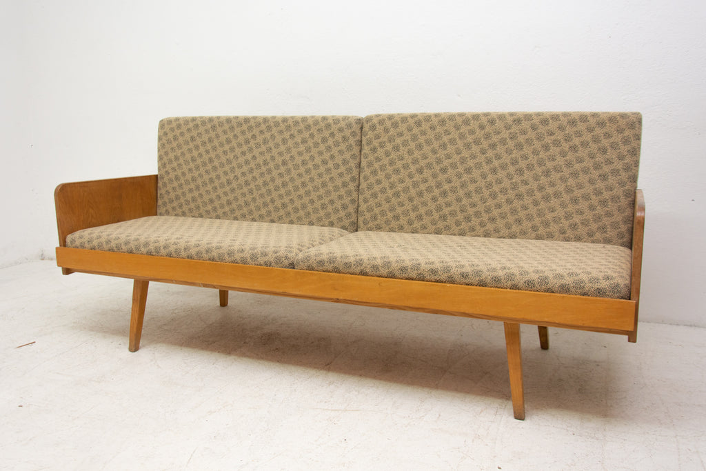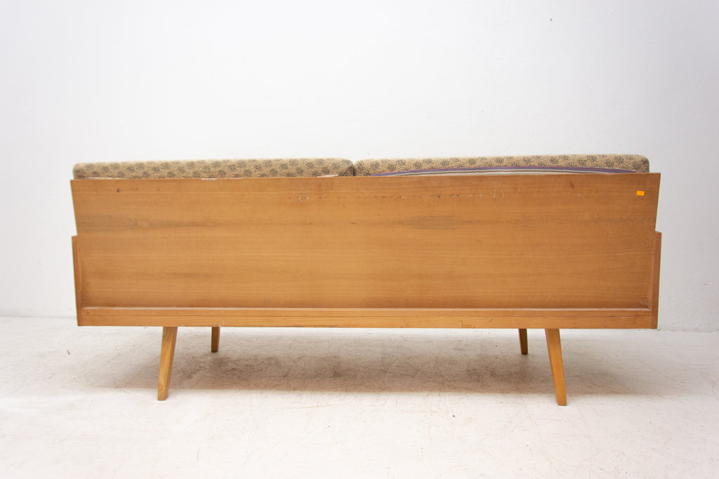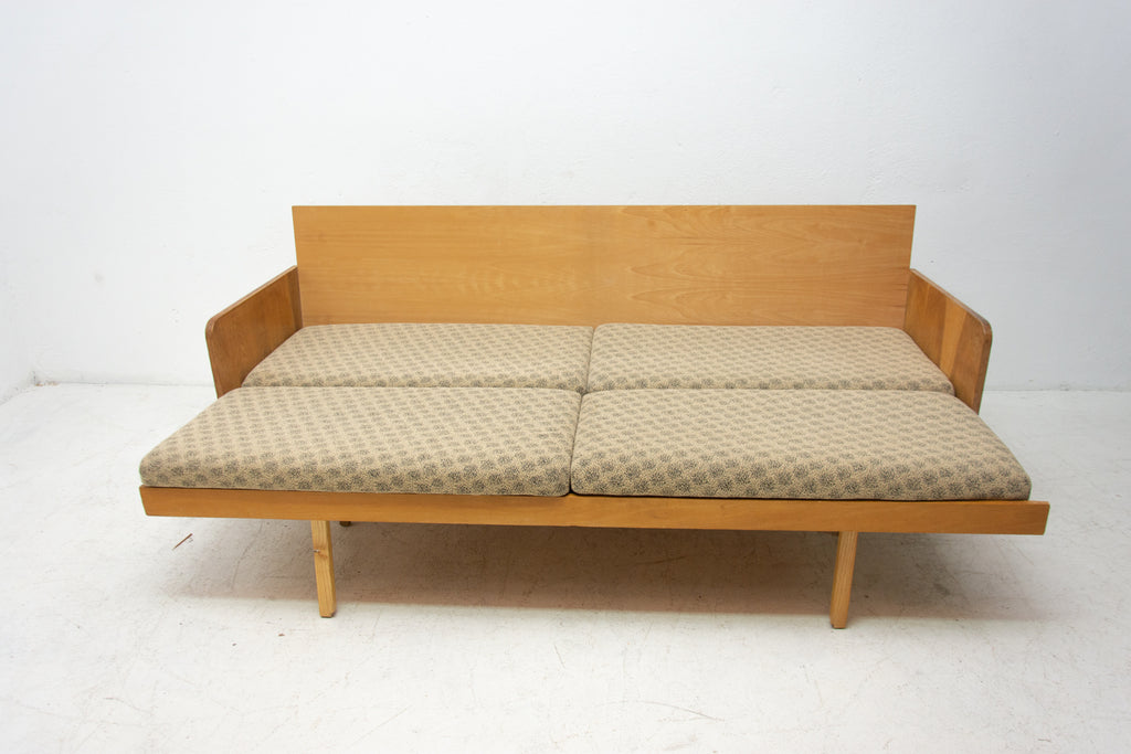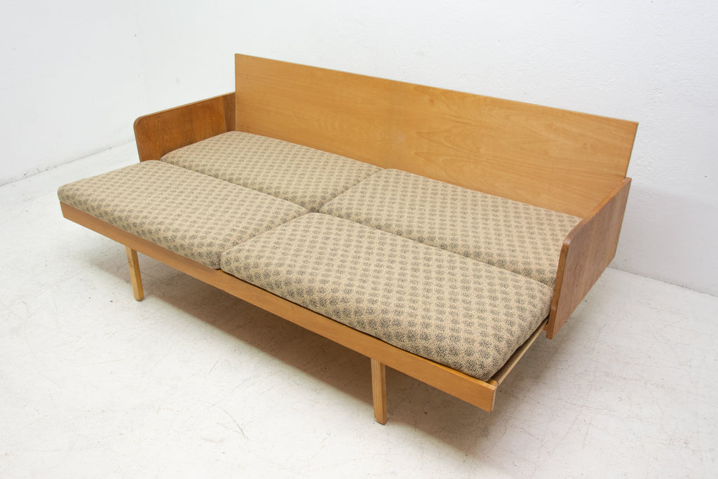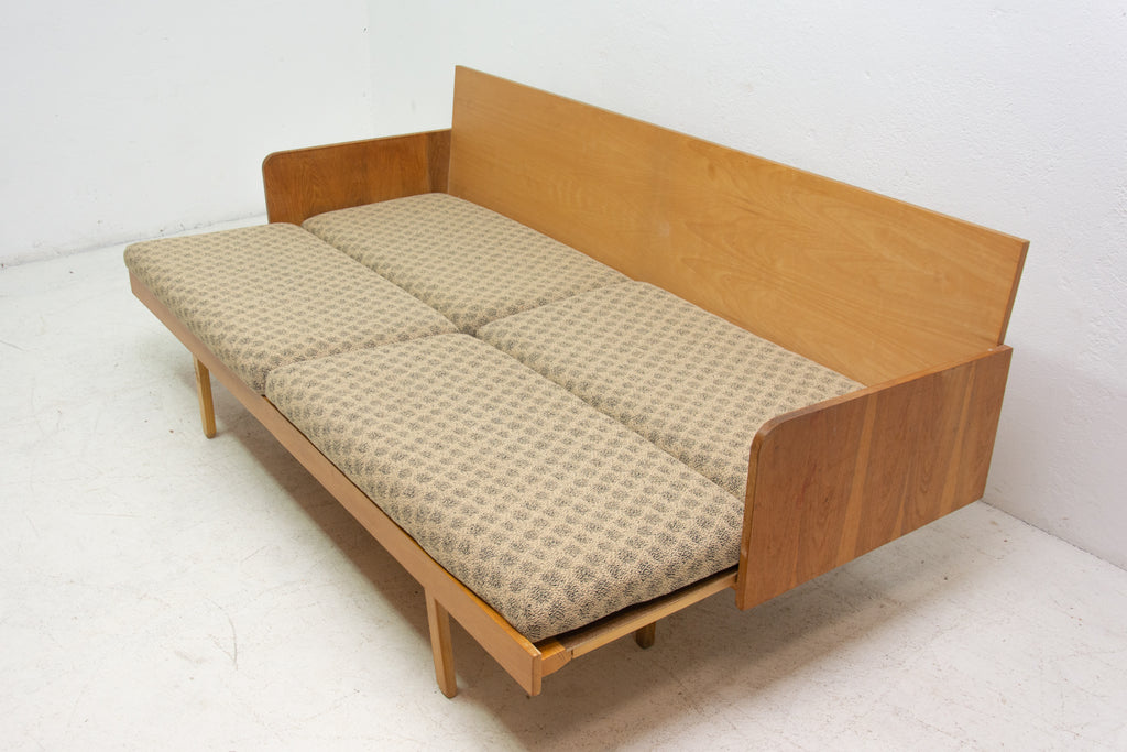 Mid century sofabed from Interiér Praha. It was made in the former Czechoslovakia in the 1960´s. This sofa has a wooden structure that is veneered in beech wood. The mattresses are rather soft but comfortable. Overall in very good Vintage condition.