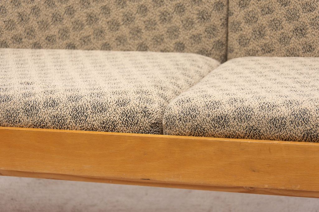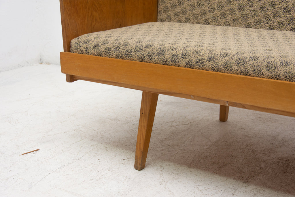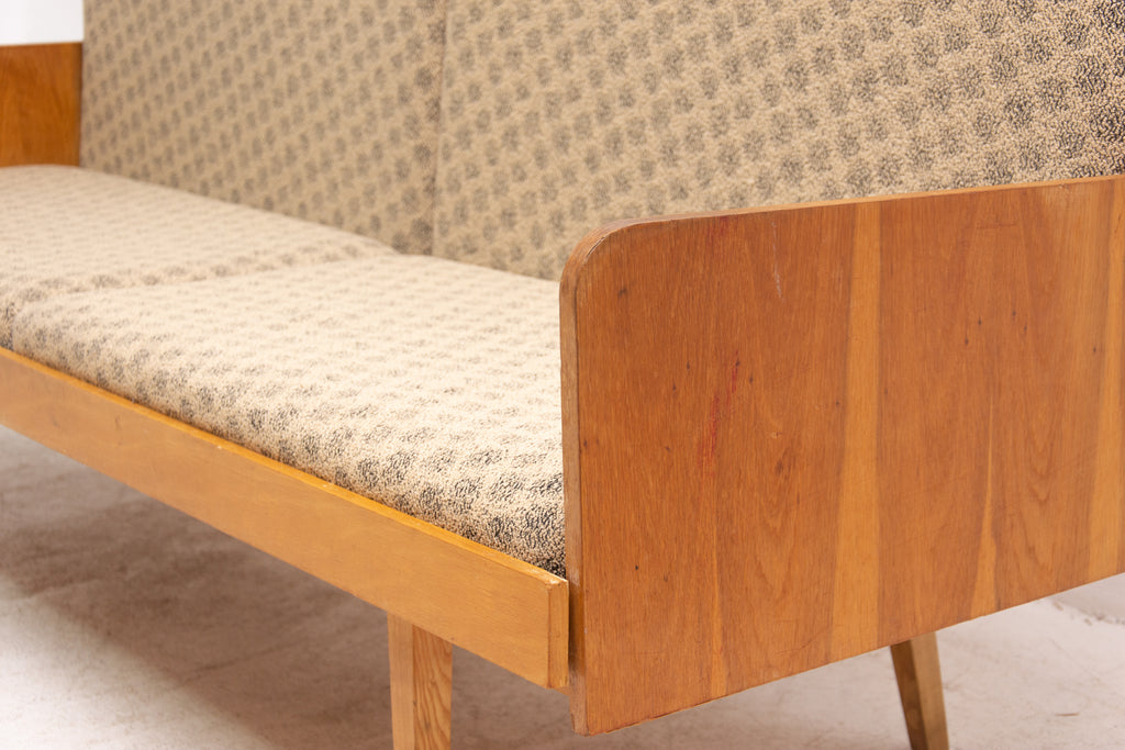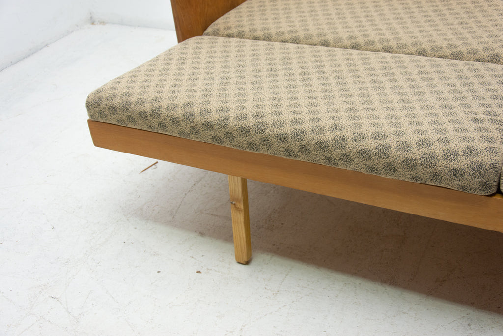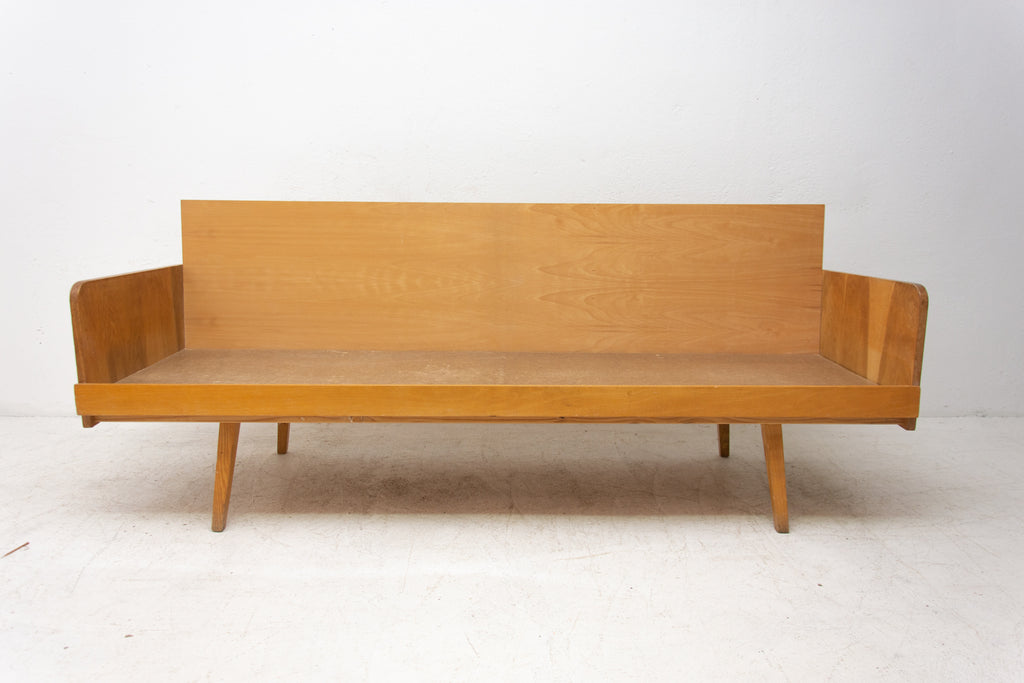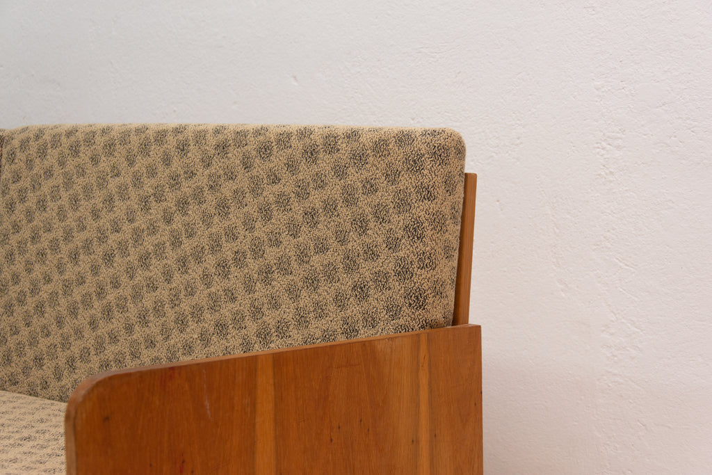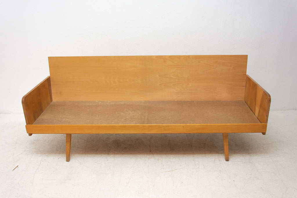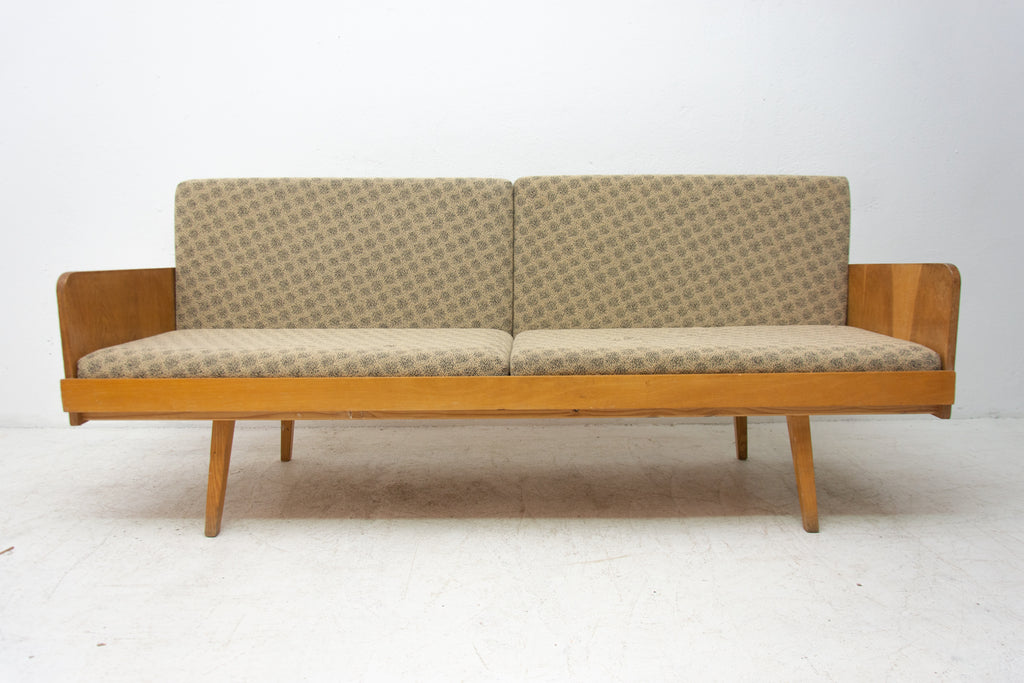 Mid century sofabed from Interiér Praha. It was made in the former Czechoslovakia in the 1960´s. This sofa has a wooden structure that is veneered in beech wood. The mattresses are rather soft but comfortable. Overall in very good Vintage condition.