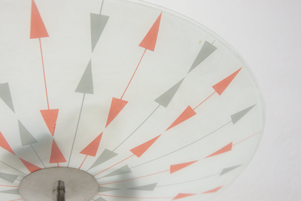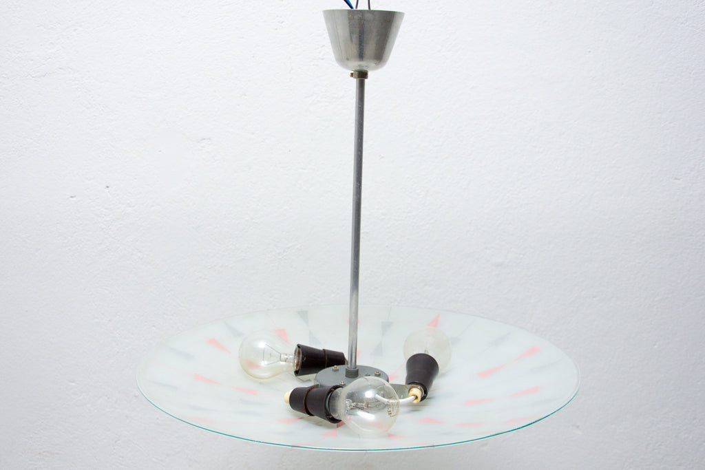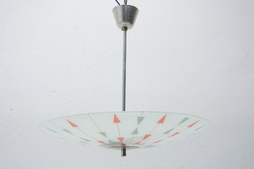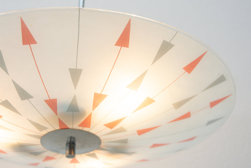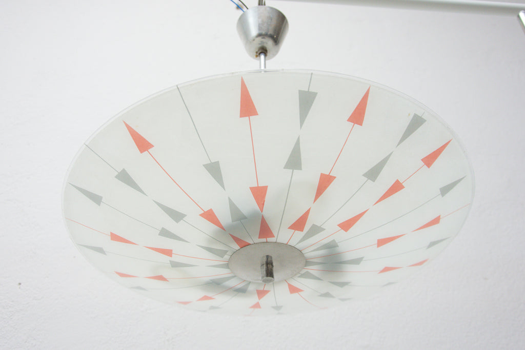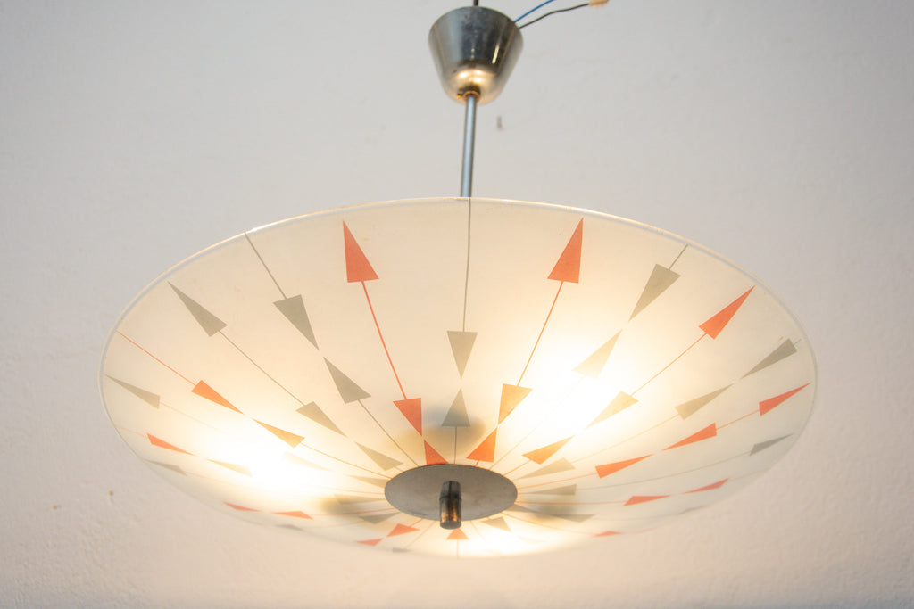 Mid century space age chandelier from the turn of the 50s and 60s connected with the exhibition EXPO 58 in Brussels. Awesome design. Painted motifs. Chrome-plated rod. In very good condition, new wiring.