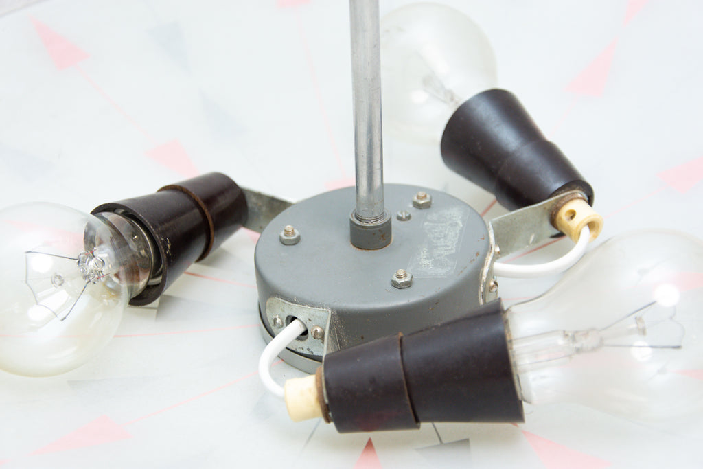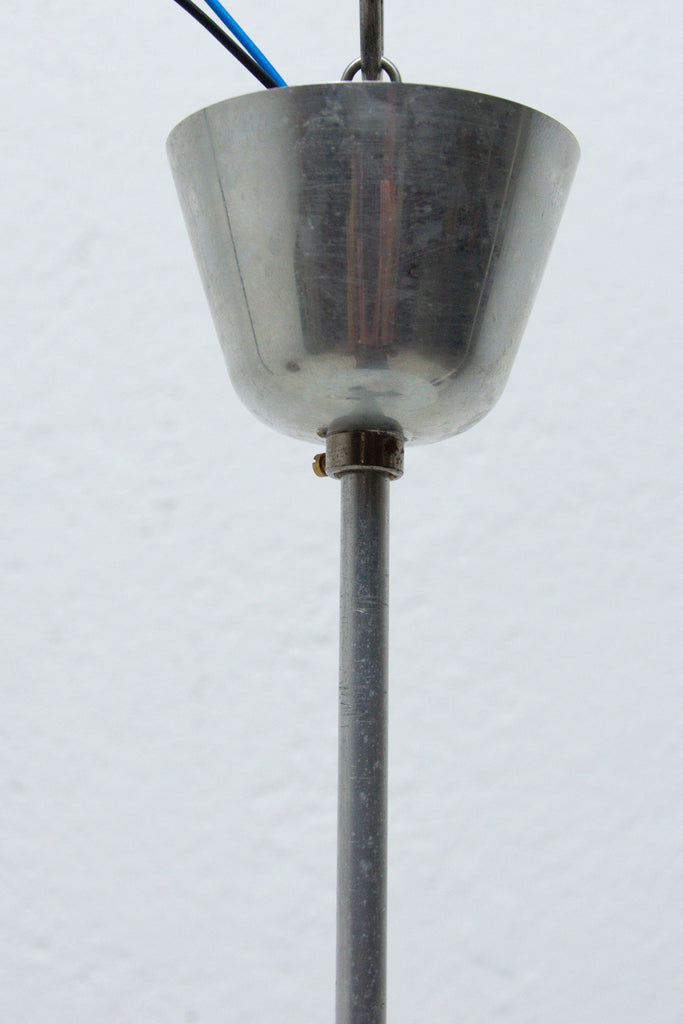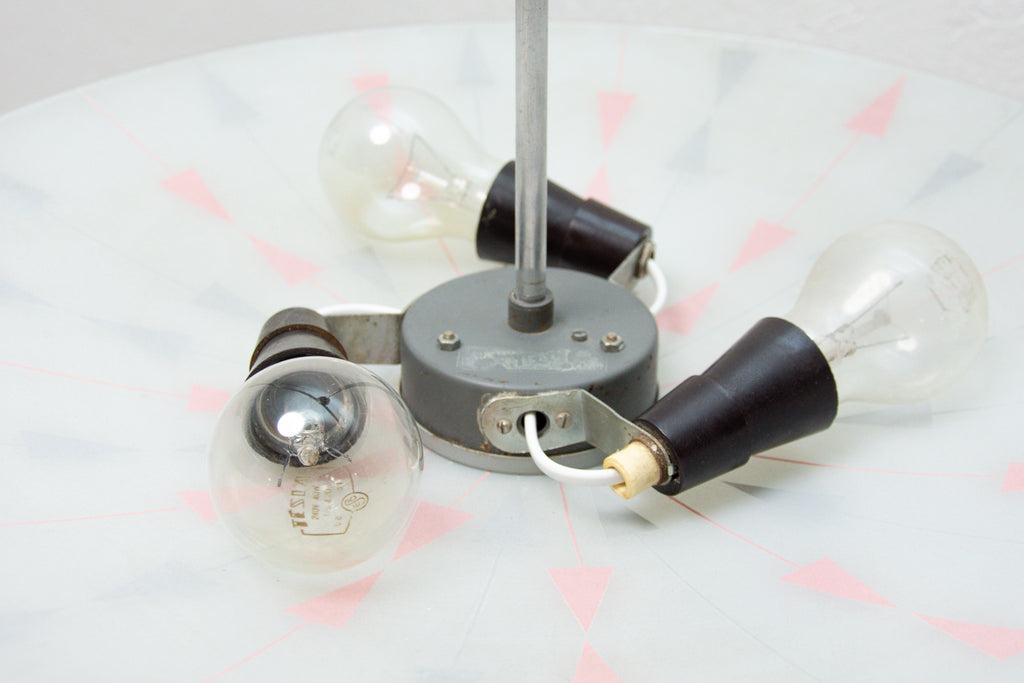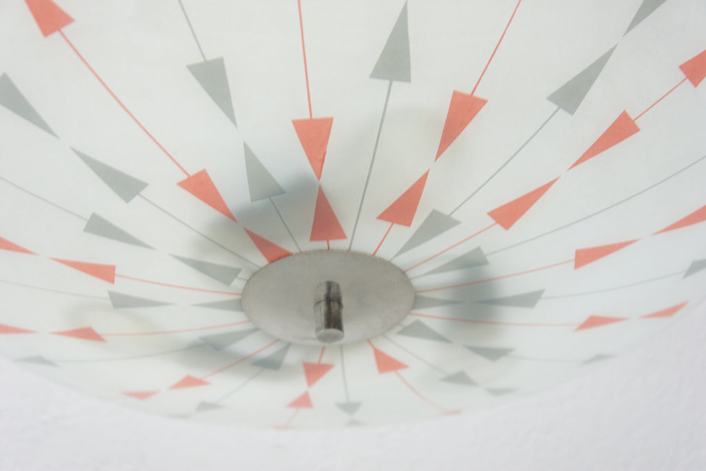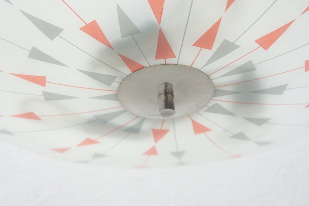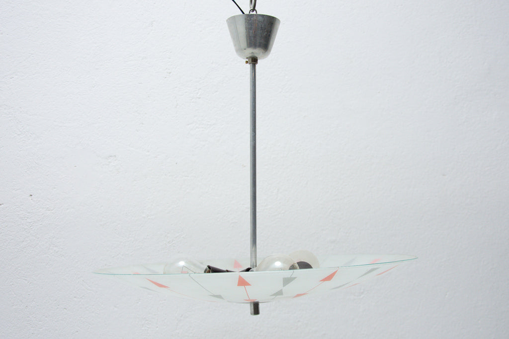 Mid century space age chandelier from the turn of the 50s and 60s connected with the exhibition EXPO 58 in Brussels. Awesome design. Painted motifs. Chrome-plated rod. In very good condition, new wiring.