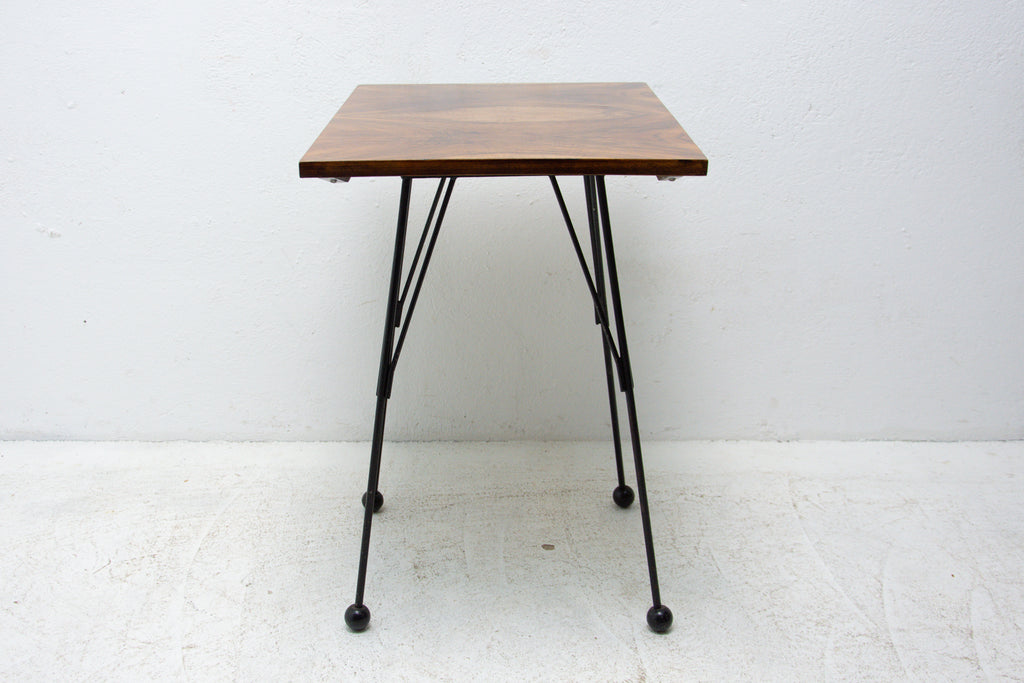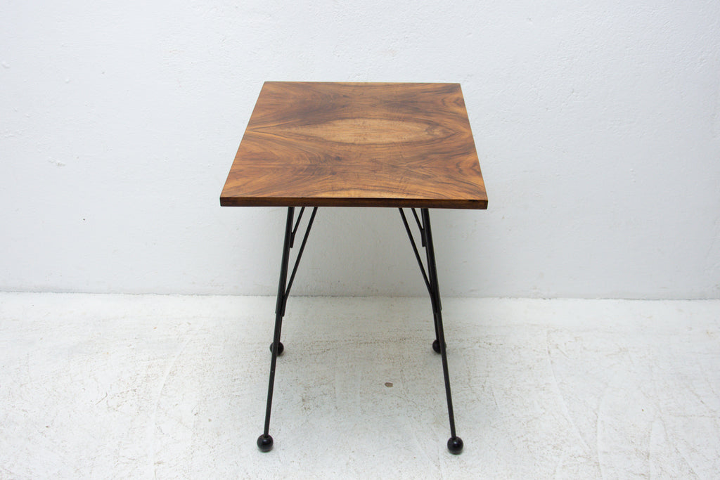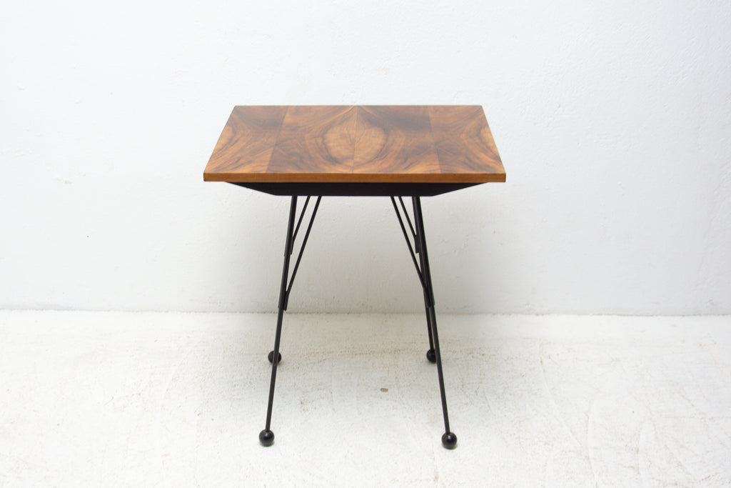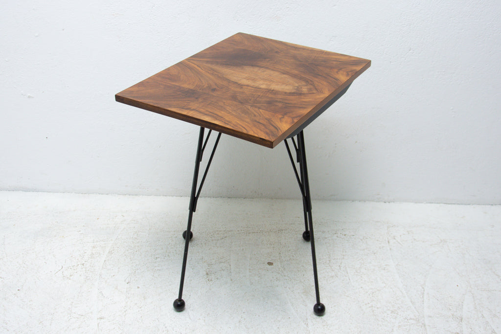 This coffee table was made in the former Czechoslovakia in the 1960´s. The table reminiscents to the Scandinavian Design School and is characterized by simplicity and black painted metal legs under the desk top. The plate is made of walnut. The table was renovated. It in very good condition.
