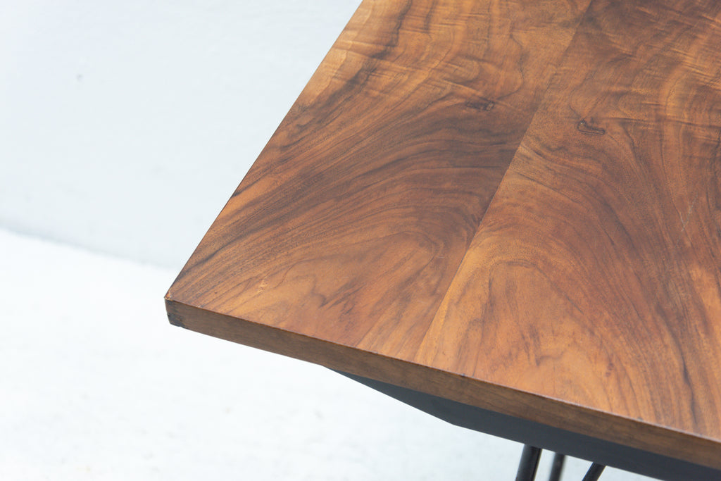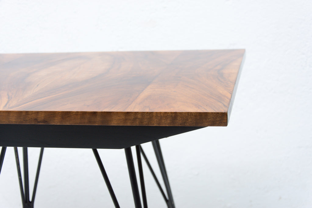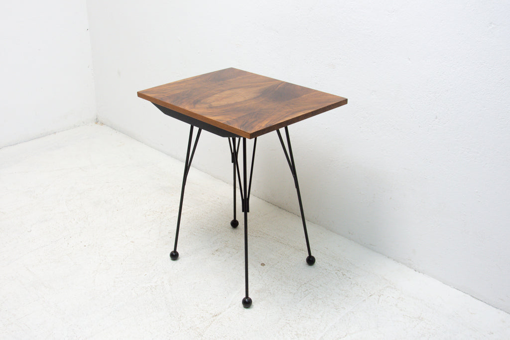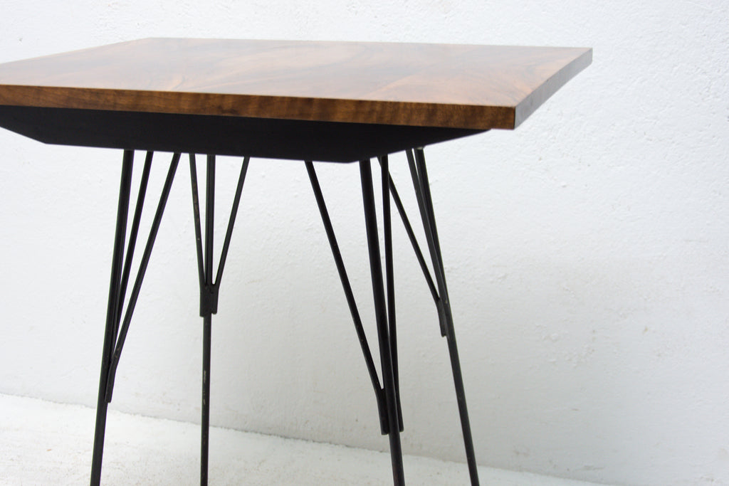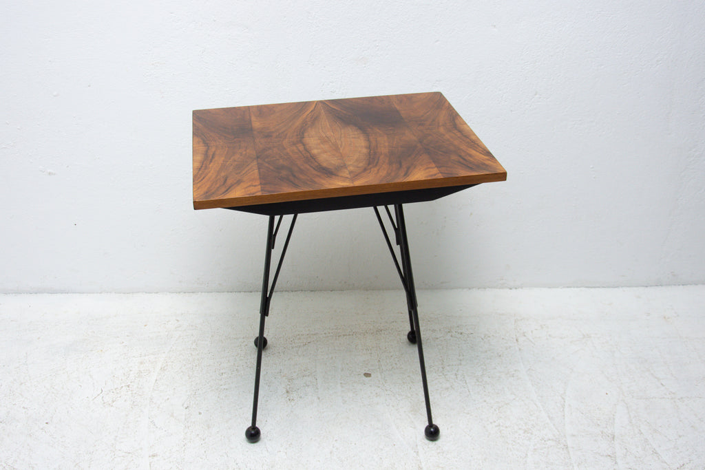 This coffee table was made in the former Czechoslovakia in the 1960´s. The table reminiscents to the Scandinavian Design School and is characterized by simplicity and black painted metal legs under the desk top. The plate is made of walnut. The table was renovated. It in very good condition.