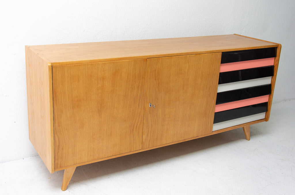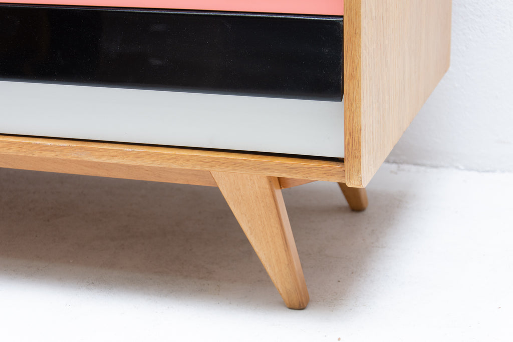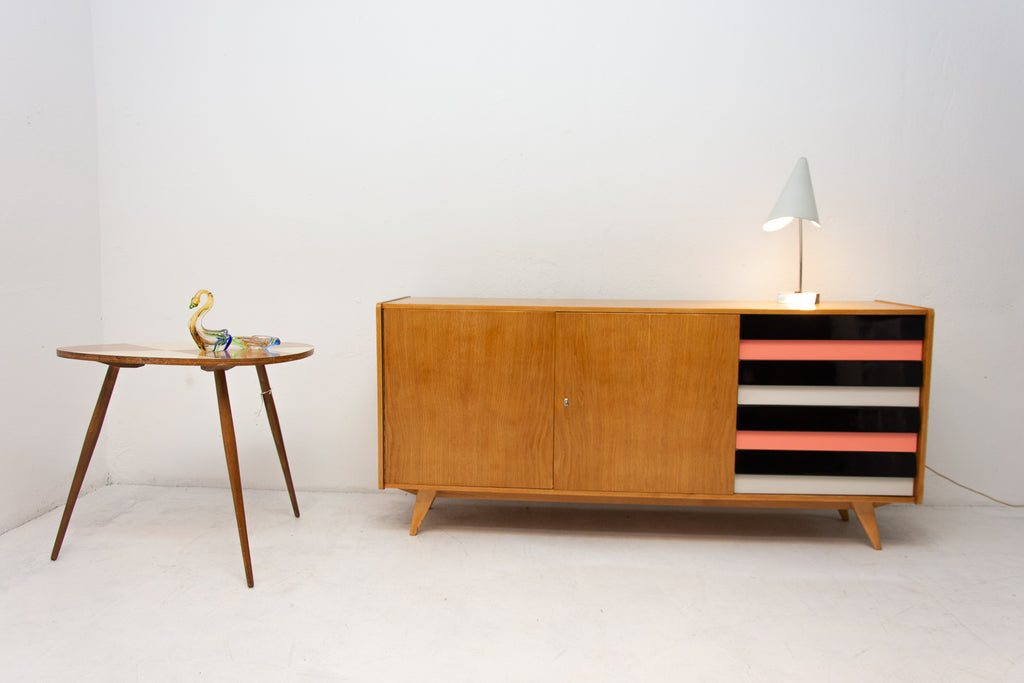 A popular Vintage sideboard model U-460 from the 1960´s. It was designed by Jiri Jiroutek for Interier Praha. It features a beech wood, plywood, colored lacquered drawers. In excellent condition, fully refurbished.
