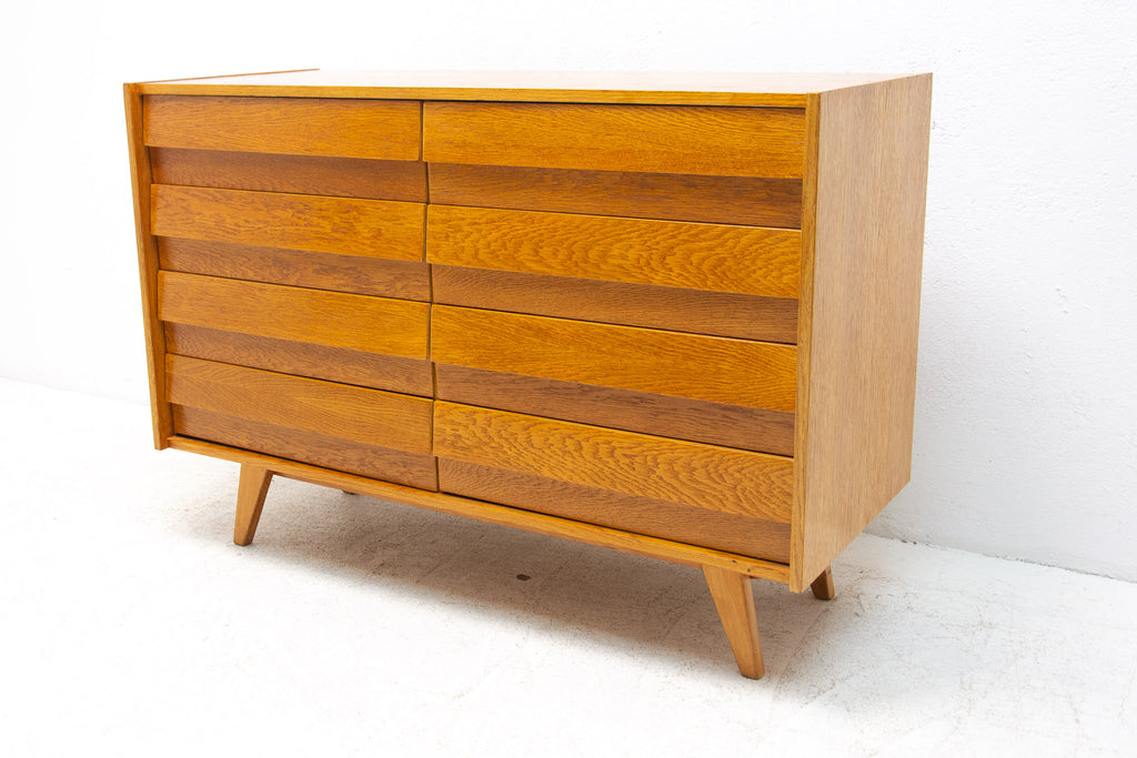 Mid century chest of drawers, model no. U-453, designed by Jiří Jiroutek for Interiér Praha. It was made in the former Czechoslovakia in the 1960´s. This model is associated with the world-famous EXPO 58 in Brussels. It´s made of oak wood and and plywood and drawers have plastic inner parts.