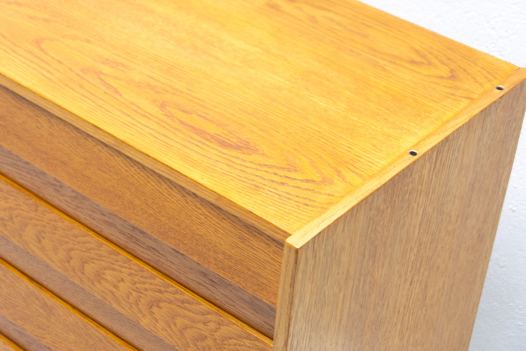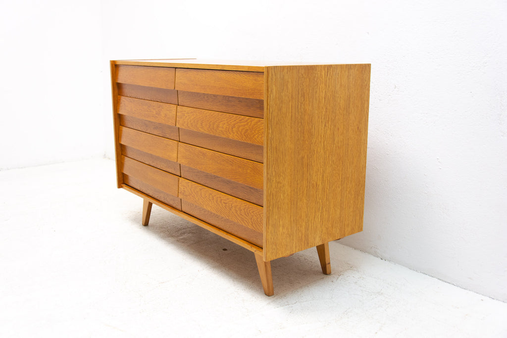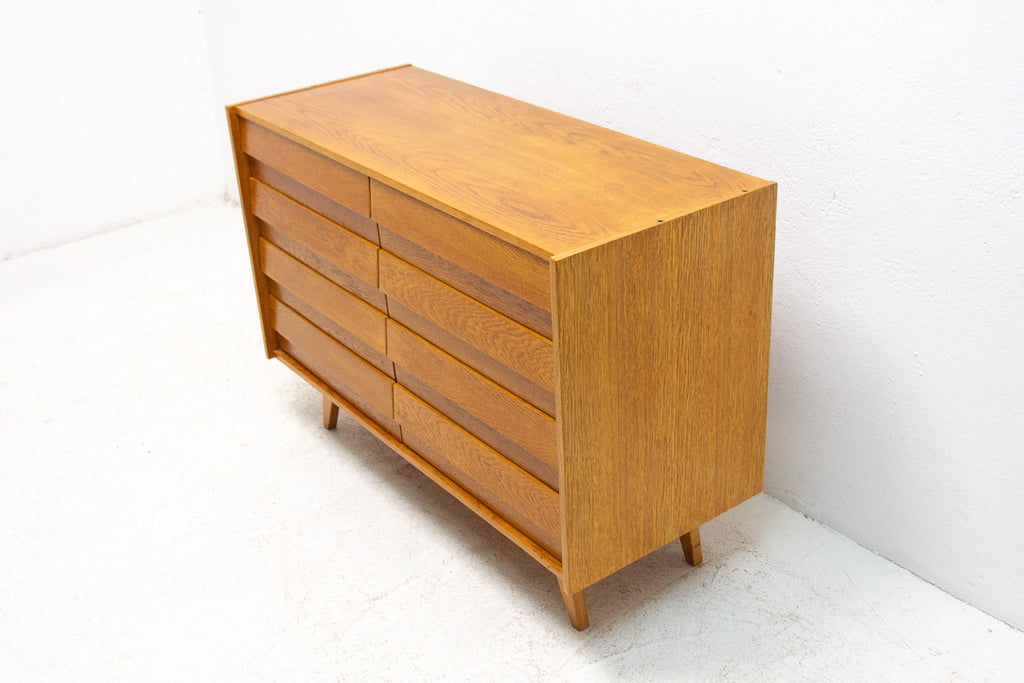 Mid century chest of drawers, model no. U-453, designed by Jiří Jiroutek for Interiér Praha. It was made in the former Czechoslovakia in the 1960´s. This model is associated with the world-famous EXPO 58 in Brussels. It´s made of oak wood and and plywood and drawers have plastic inner parts.