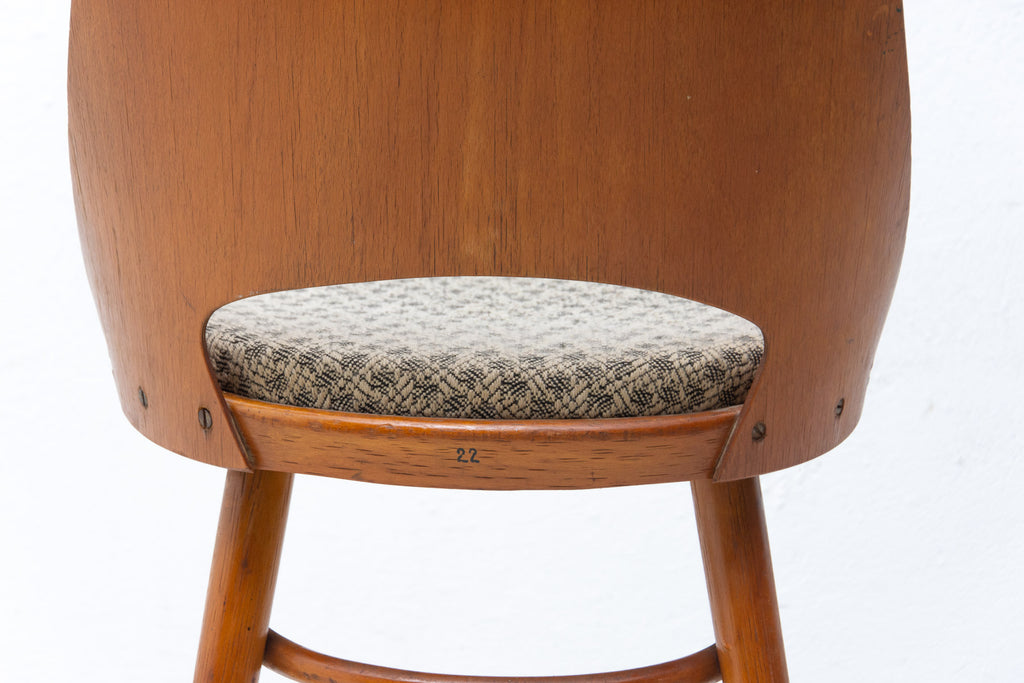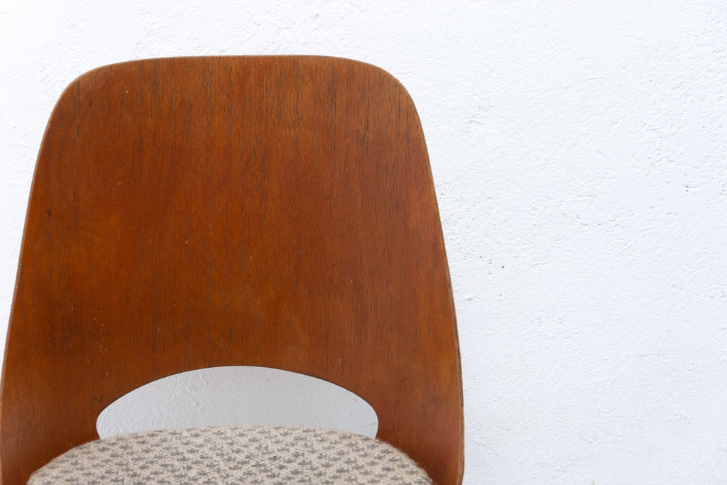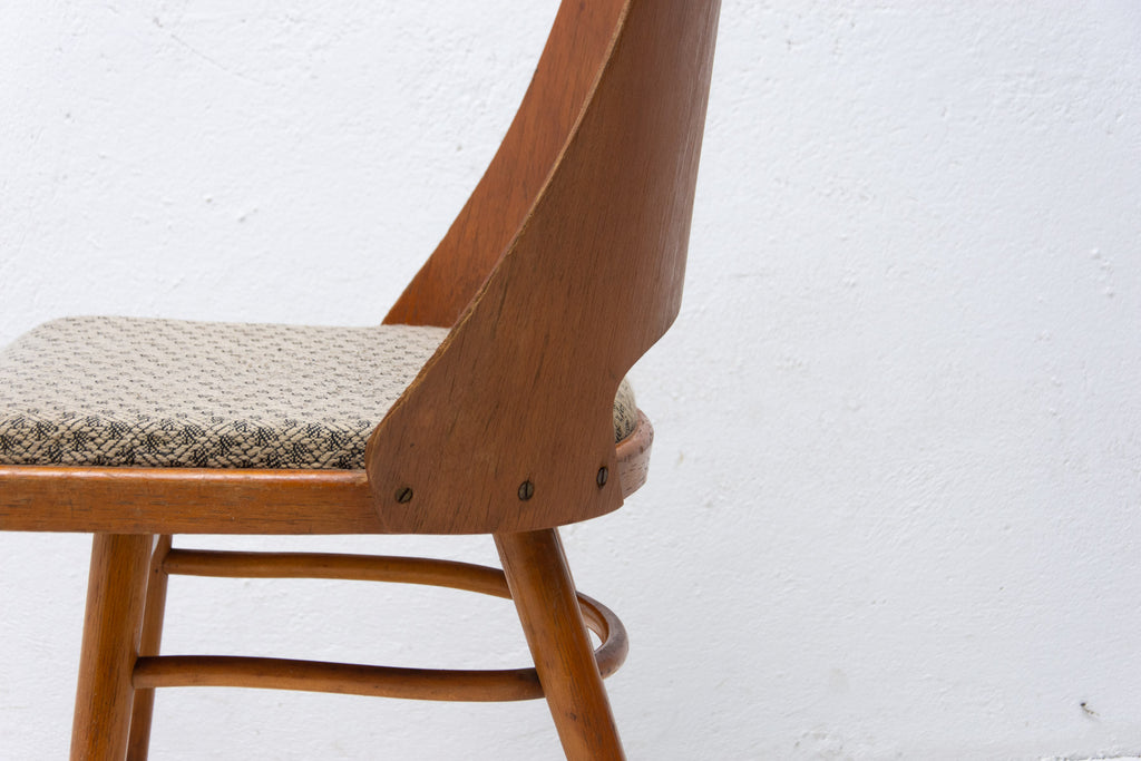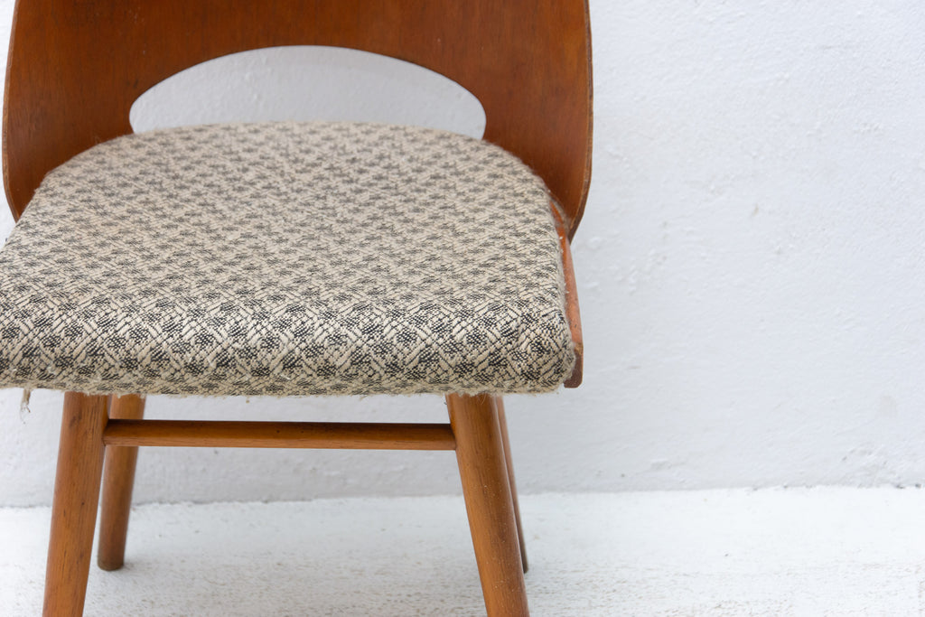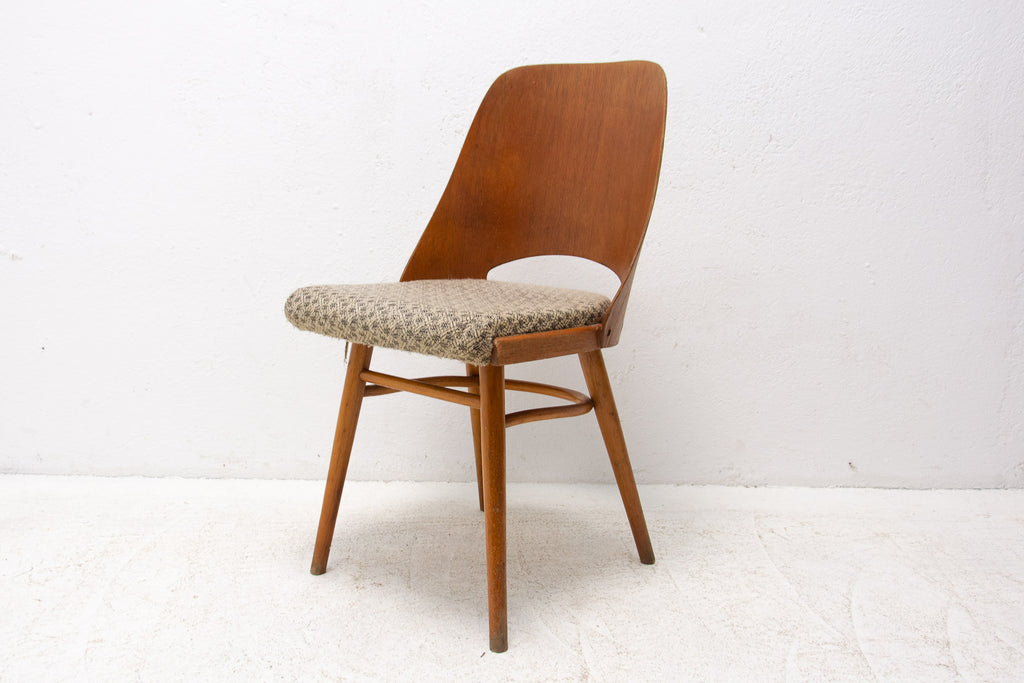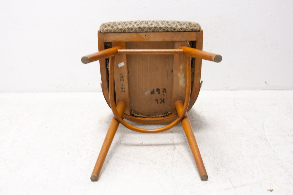 Interesting model of vintage bentwood dining chairs designed by Radomír Hofman for TON Bystřice pod Hostýnem (Thonet successor in Czechoslovakia after World War 2) . They were made in the former Czechoslovakia in the 1960´s. The chairs are made of bent plywood and beech wood with upholstered seats. An interesting example of Czechoslovak design after the huge success of the Czechoslovak pavilion at Expo 58 in Brussels. The chairs are in good Vintage condition, bears signs of age and using. Price is for the pair.