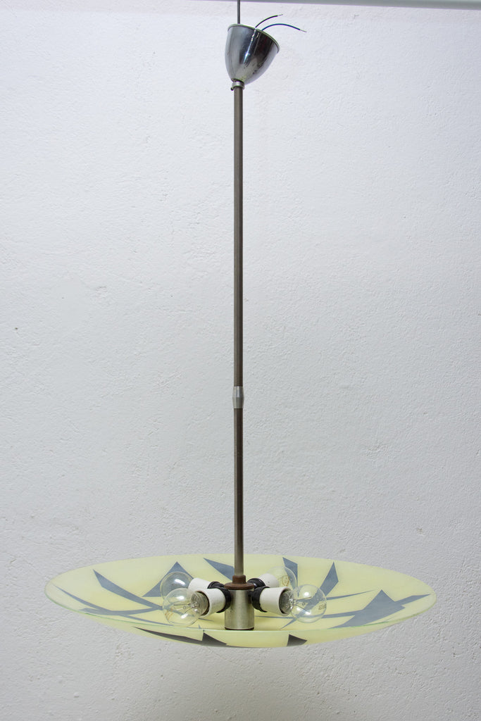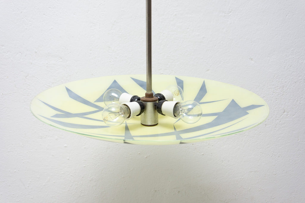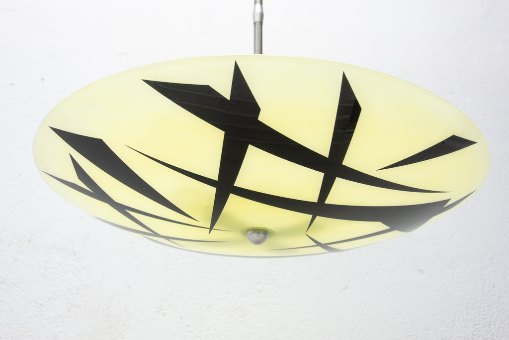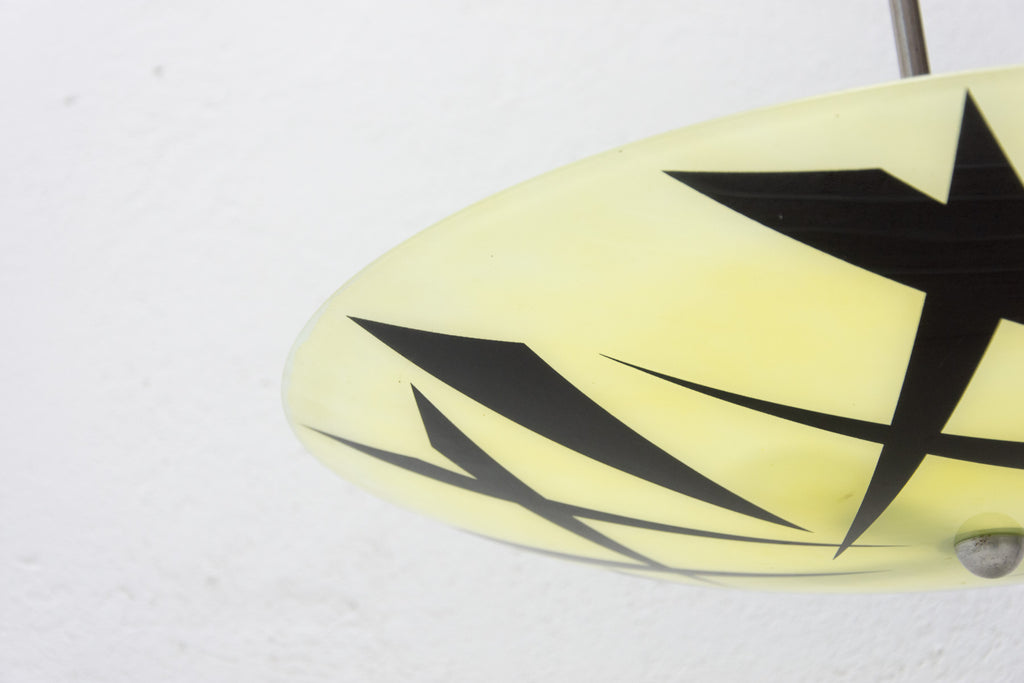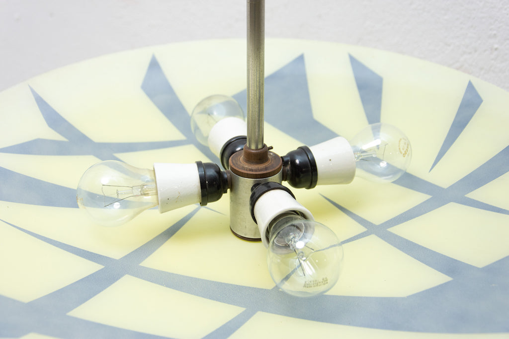 Mid century space age chandelier from the turn of the 50s and 60s connected with the exhibition EXPO 58 in Brussels. Awesome design. Painted motifs. Chrome-plated rod. In very good condition, new wiring.