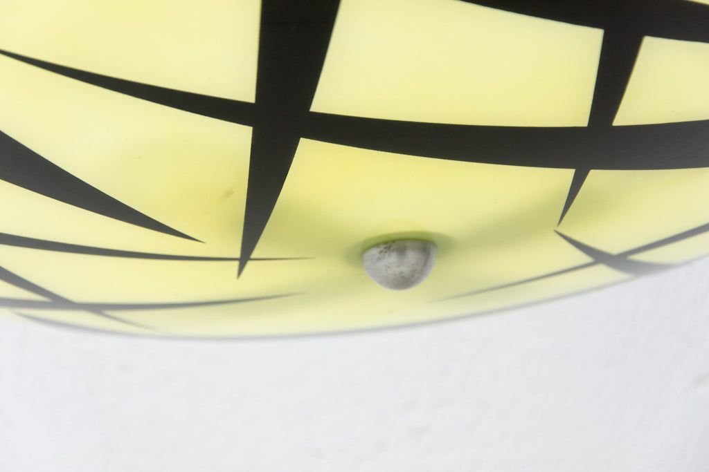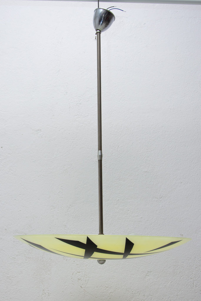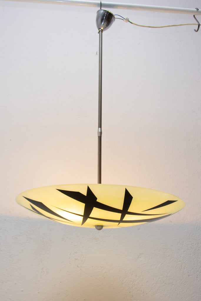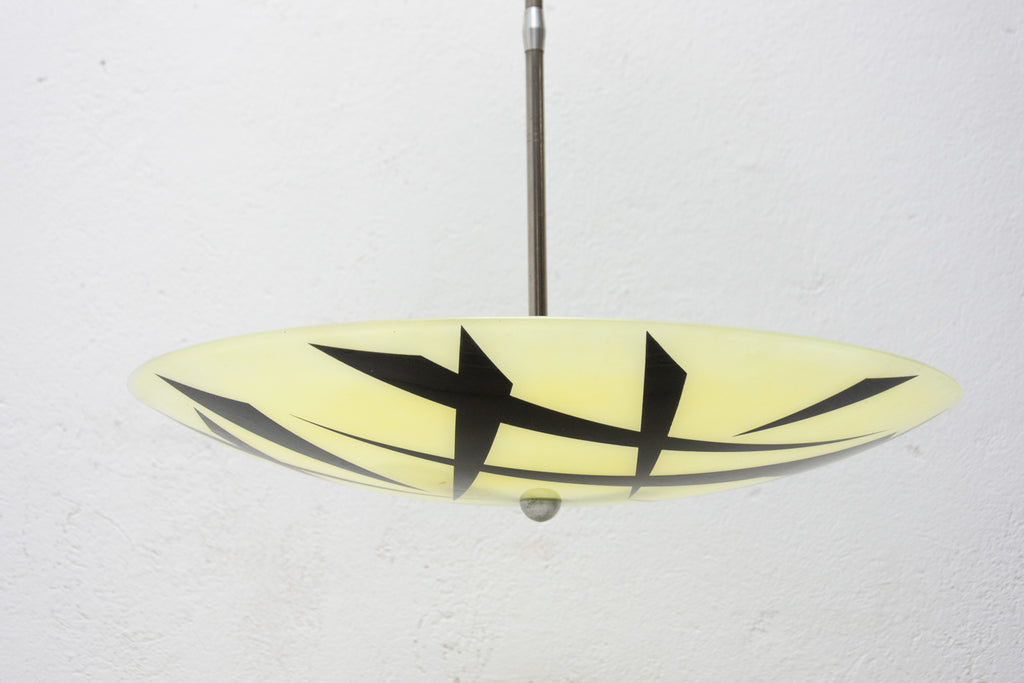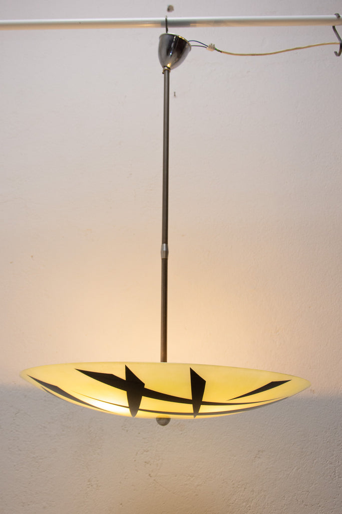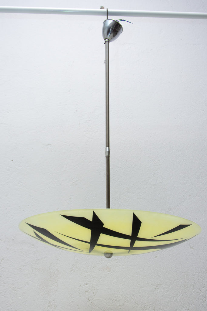 Mid century space age chandelier from the turn of the 50s and 60s connected with the exhibition EXPO 58 in Brussels. Awesome design. Painted motifs. Chrome-plated rod. In very good condition, new wiring.