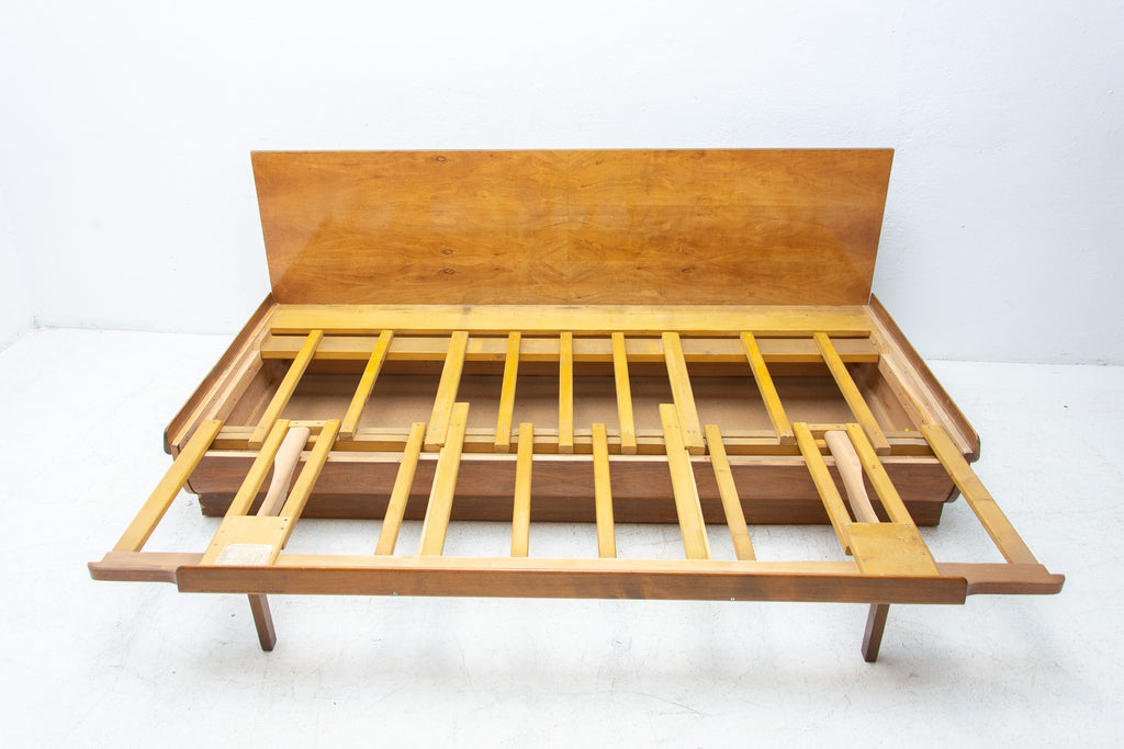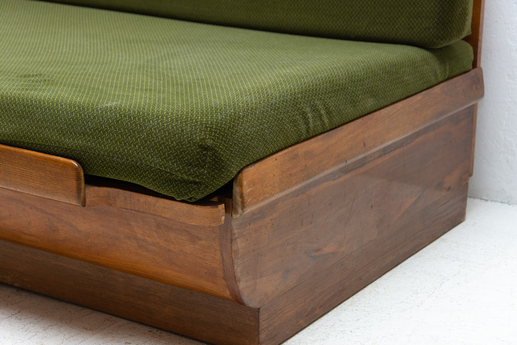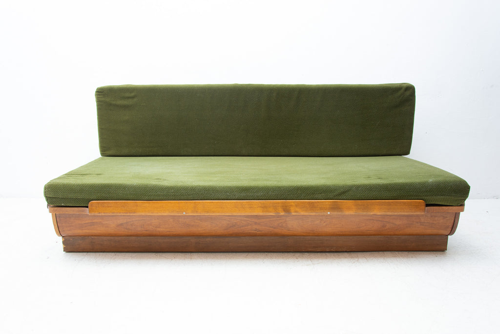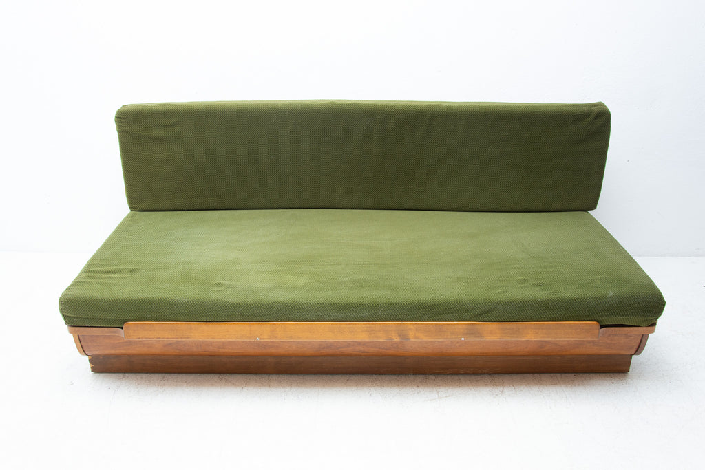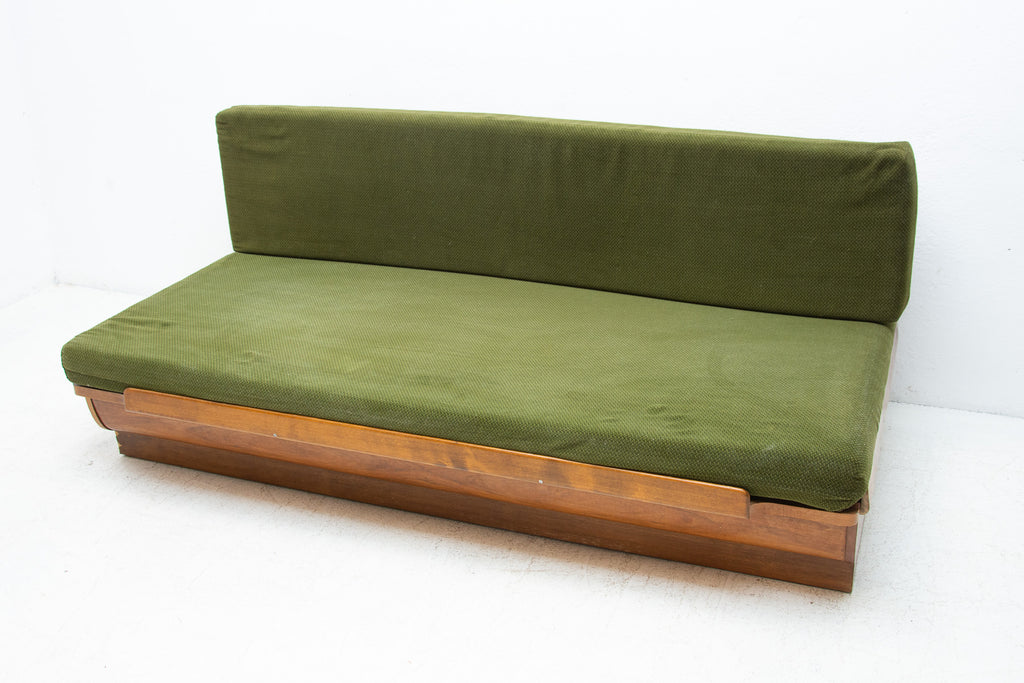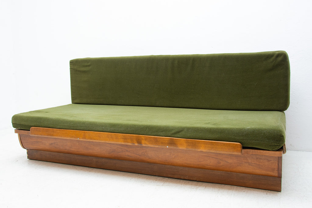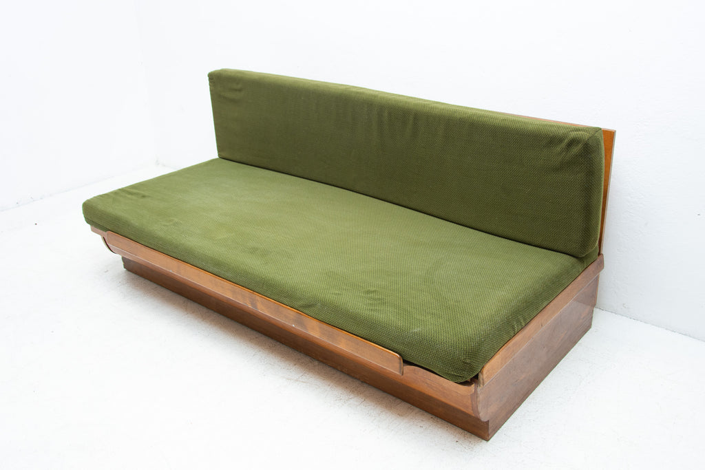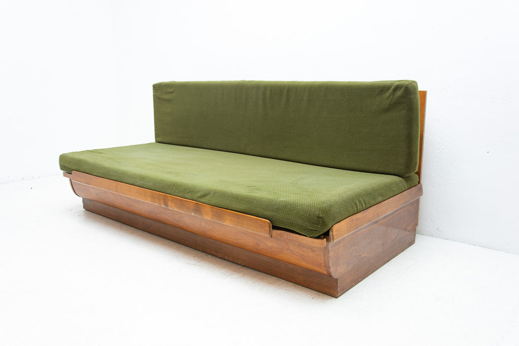 Mid century sofabed designed by Jindřich Halabala. It was made in the former Czechoslovakia in the 1950´s. This sofa features a wooden structure that is veneered in the walnut and a storage space for bedding. Sofa is adjustable for sleeping. The sofa is in good Vintage condition, the mattresses are not original and shows signs of age and using.