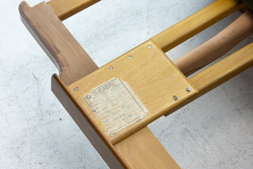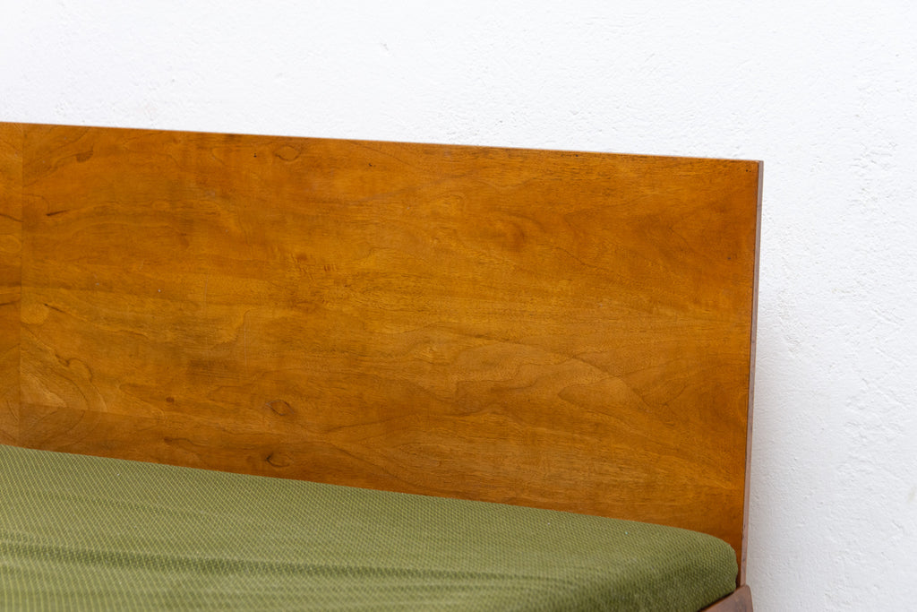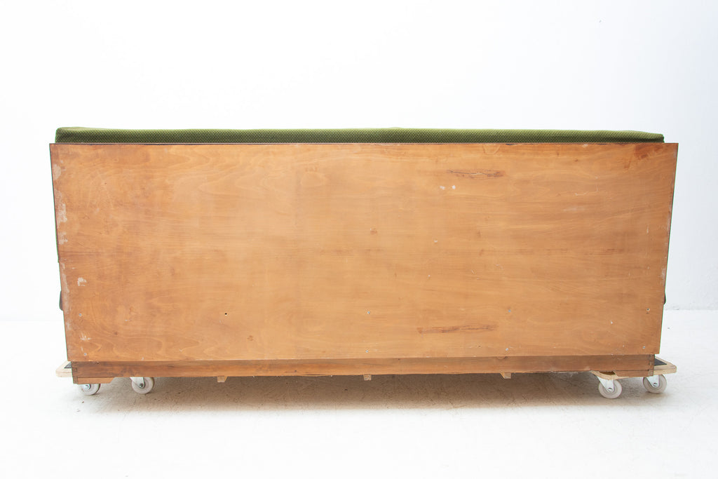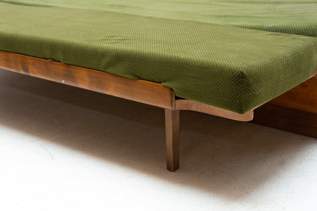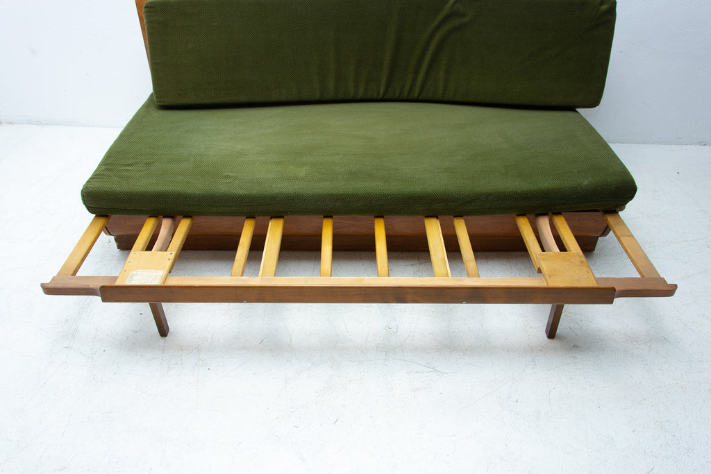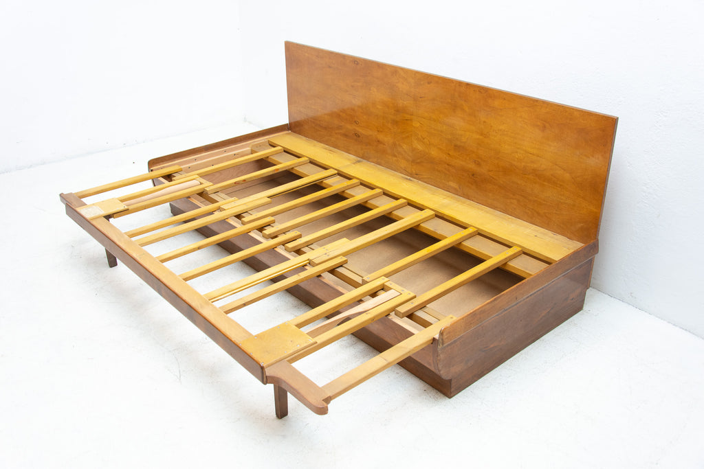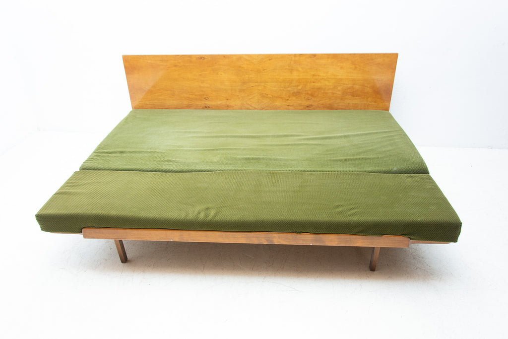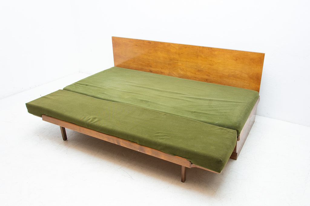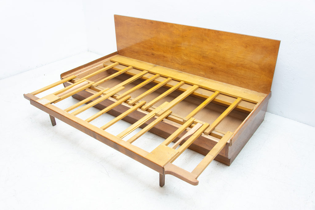 Mid century sofabed designed by Jindřich Halabala. It was made in the former Czechoslovakia in the 1950´s. This sofa features a wooden structure that is veneered in the walnut and a storage space for bedding. Sofa is adjustable for sleeping. The sofa is in good Vintage condition, the mattresses are not original and shows signs of age and using.
