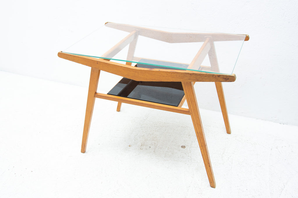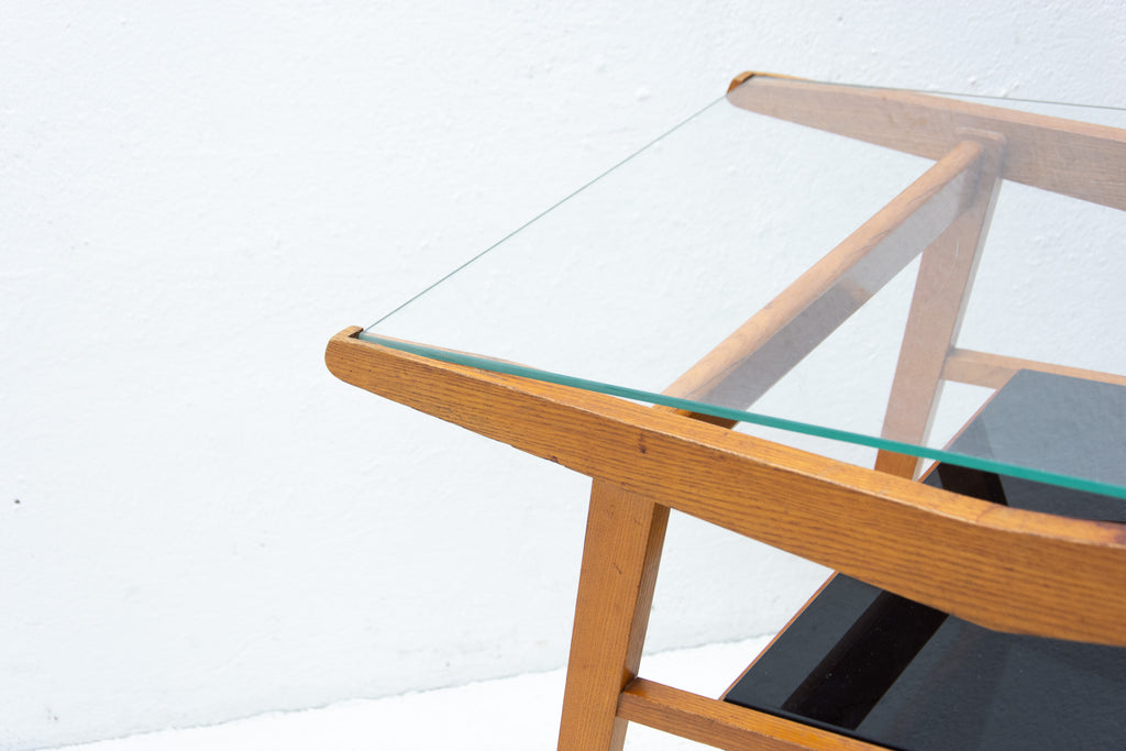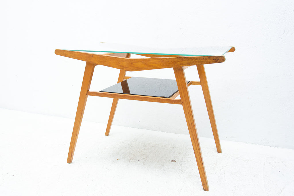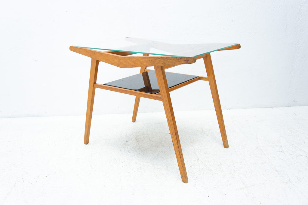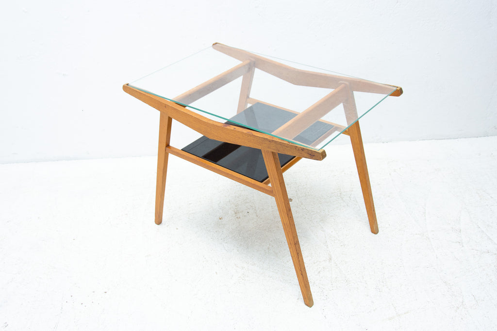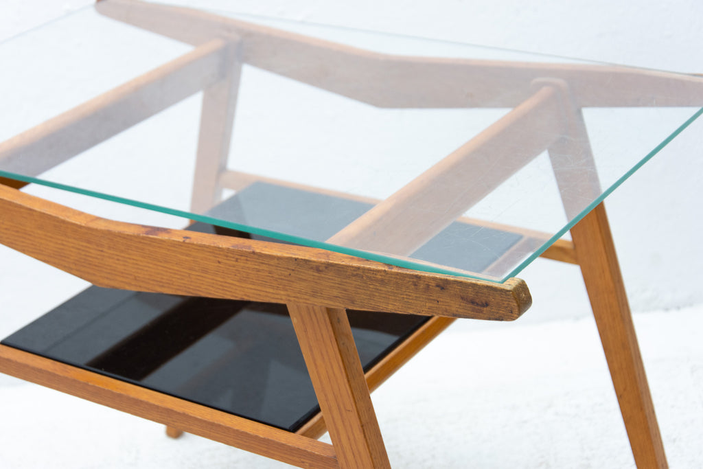 Mid century coffee table, made in the 1960´s in the former Czechoslovakia. Associated with world-renowned EXPO 58 exhibition in Brussels. Glass tabletop, black glass middle part of the table, beech wood construction.