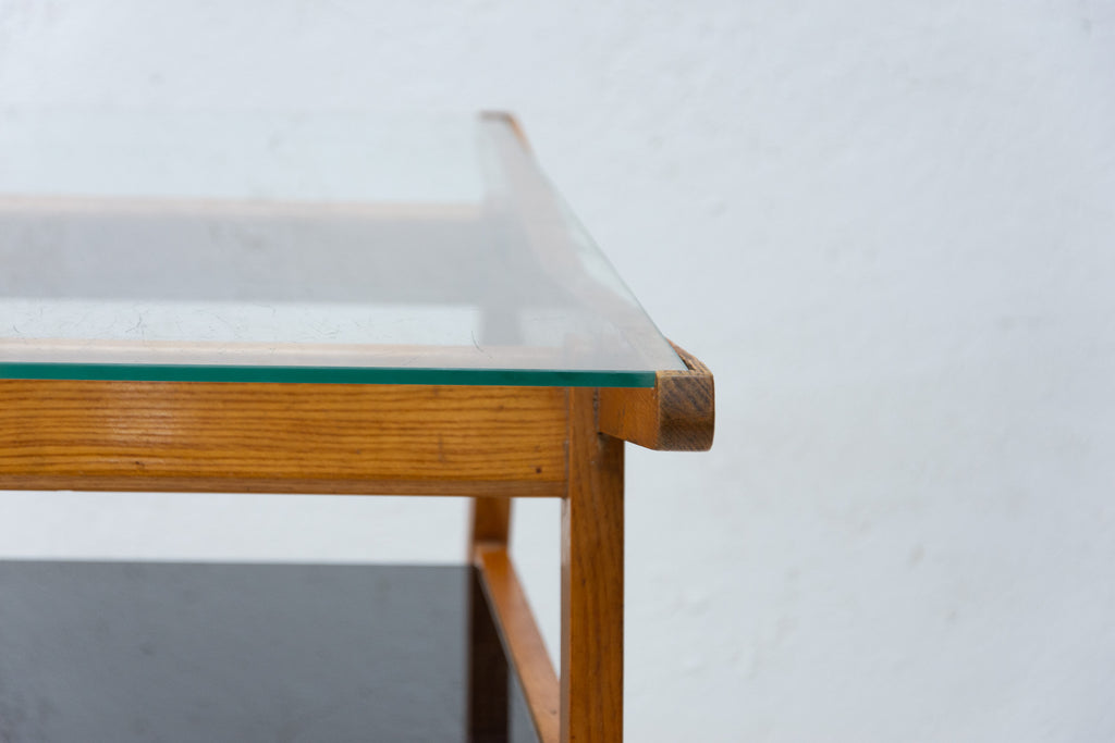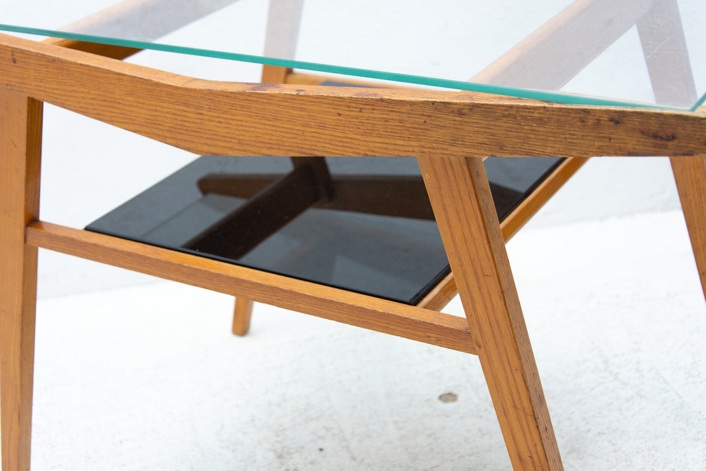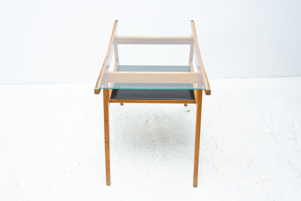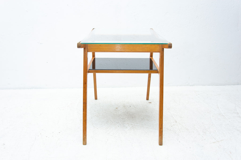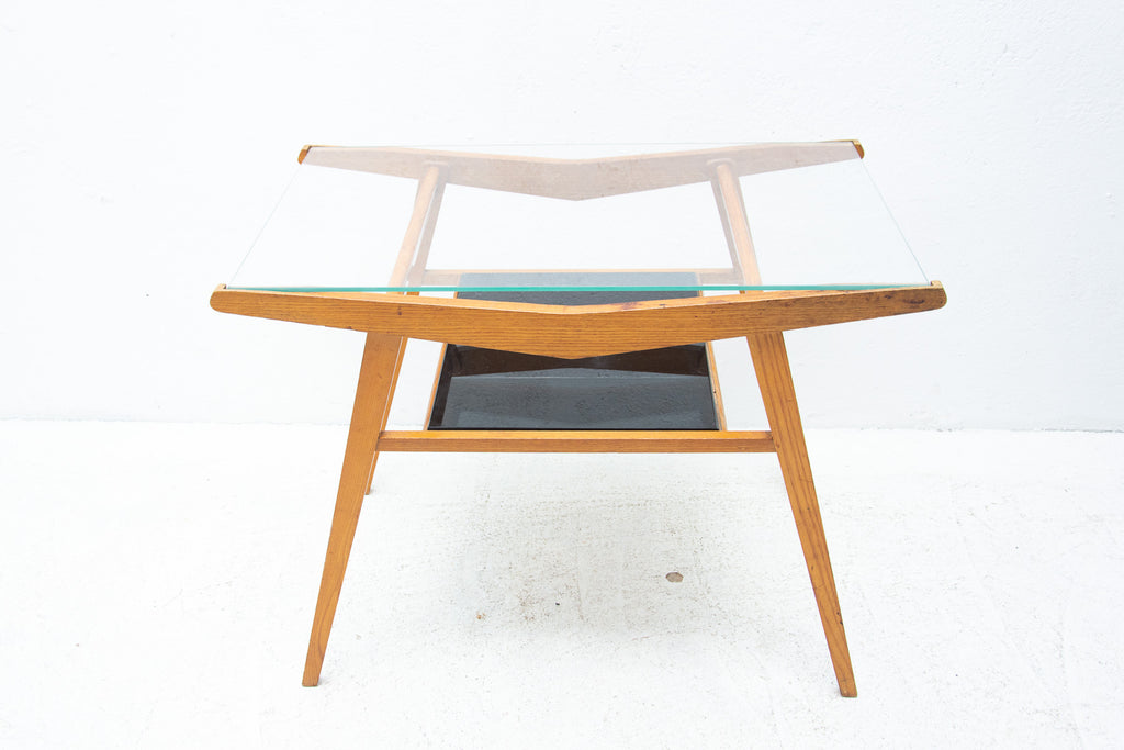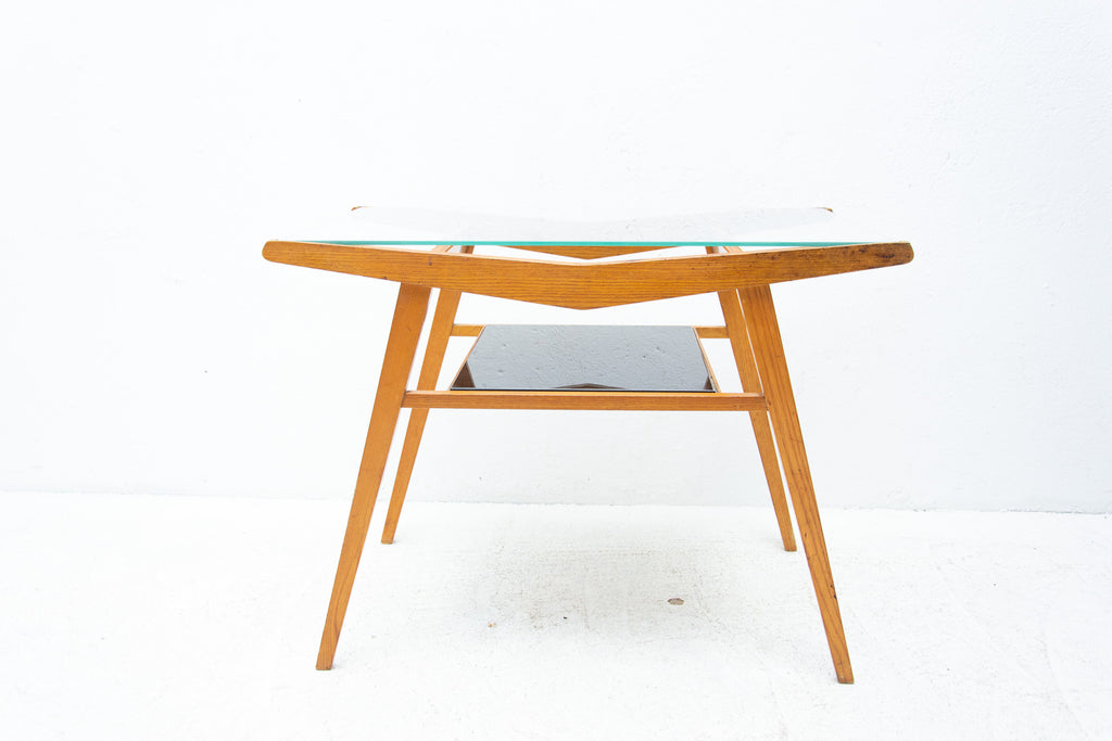 Mid century coffee table, made in the 1960´s in the former Czechoslovakia. Associated with world-renowned EXPO 58 exhibition in Brussels. Glass tabletop, black glass middle part of the table, beech wood construction.