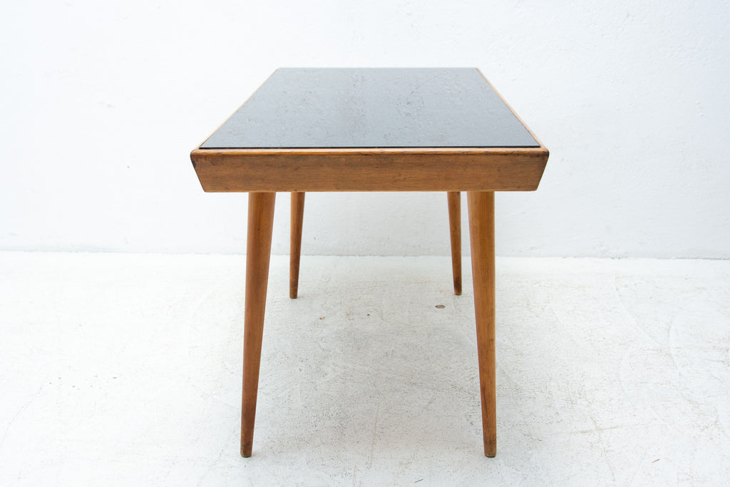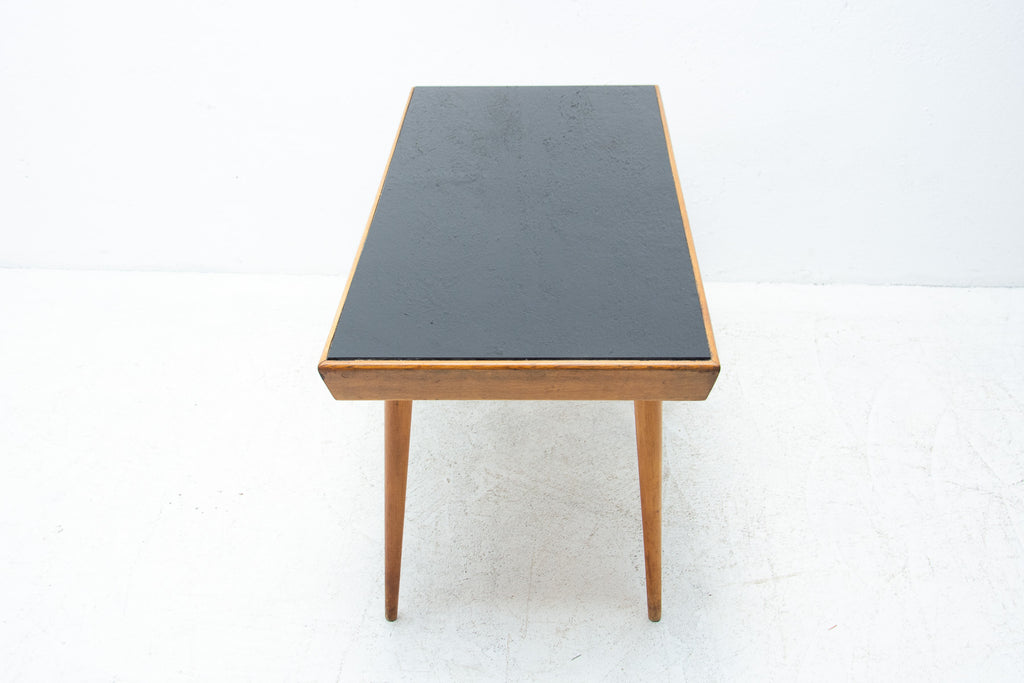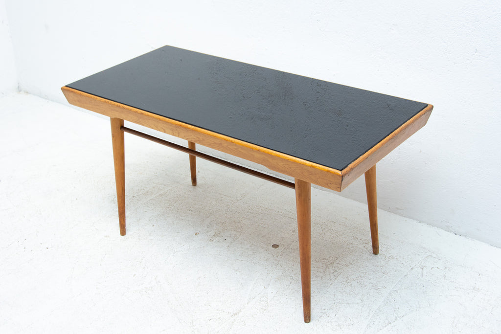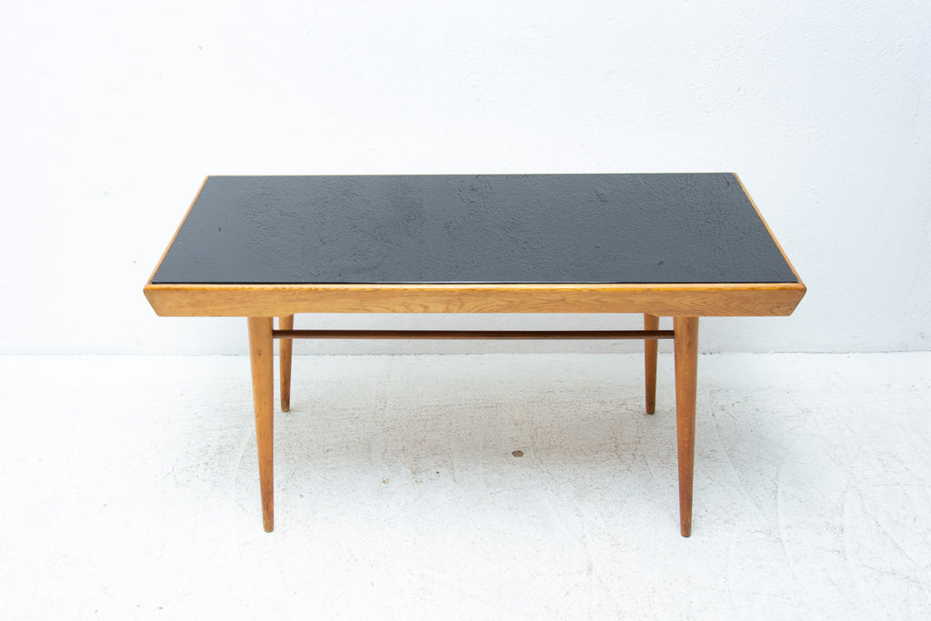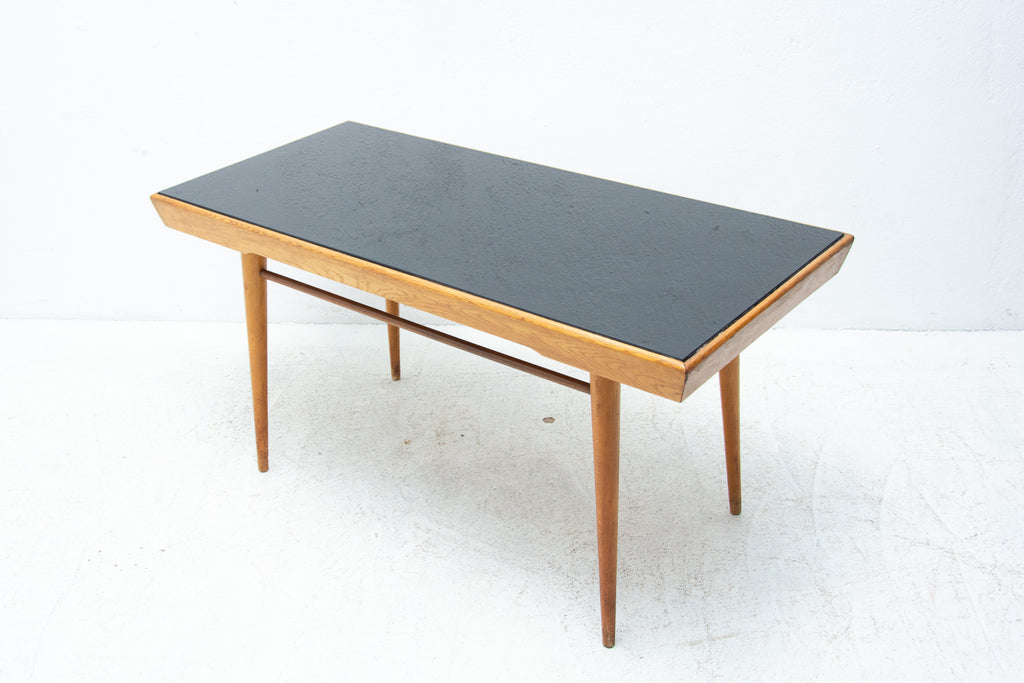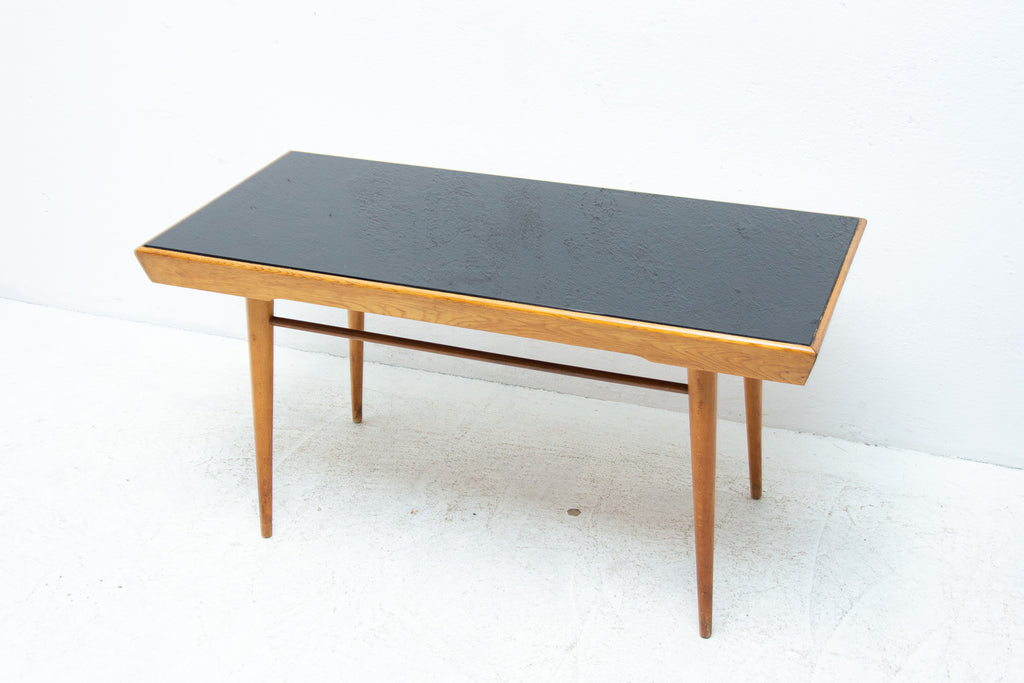 Mid century opaxite glass coffee table from the 1960´s. Associated with the world-renowned exhibition EXPO 58 in Brussels. It was produced by "Interiér Praha". It features a beechwood structure and a black glass tabletop. In good Vintage condition, shows signs of age and using.