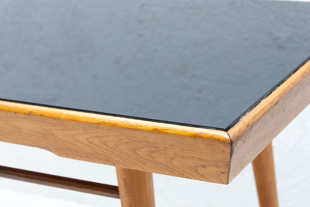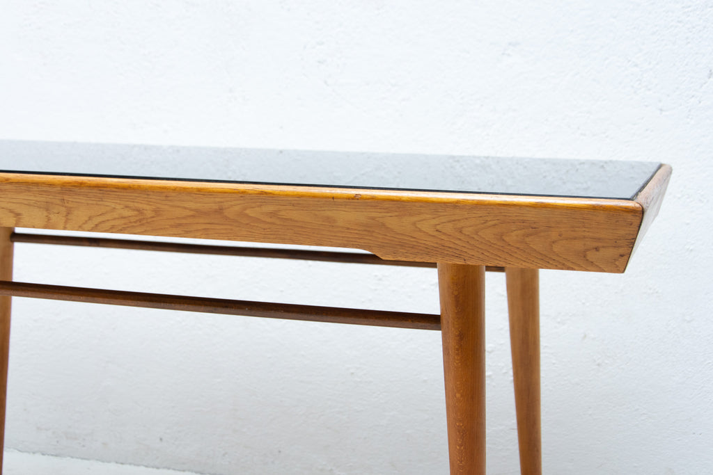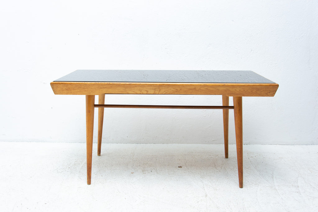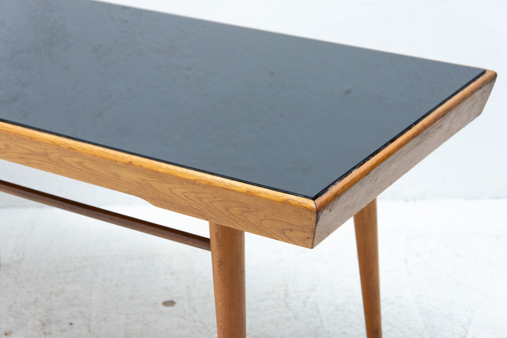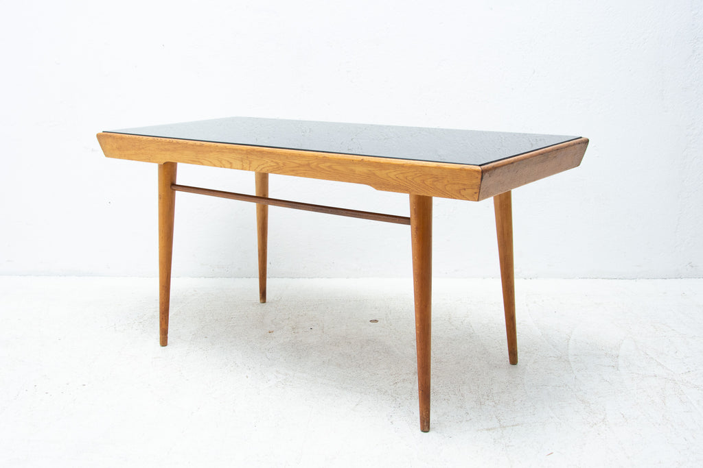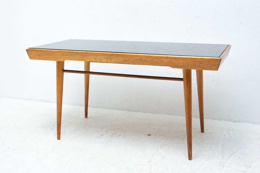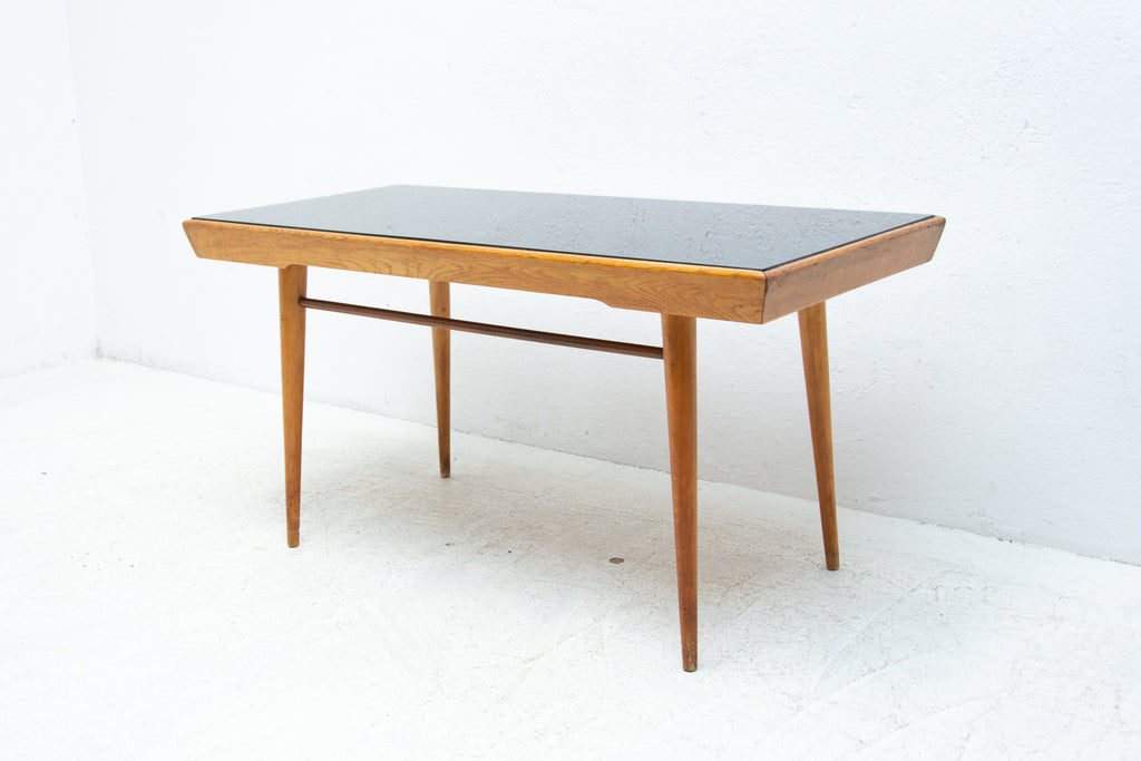 Mid century opaxite glass coffee table from the 1960´s. Associated with the world-renowned exhibition EXPO 58 in Brussels. It was produced by "Interiér Praha". It features a beechwood structure and a black glass tabletop. In good Vintage condition, shows signs of age and using.