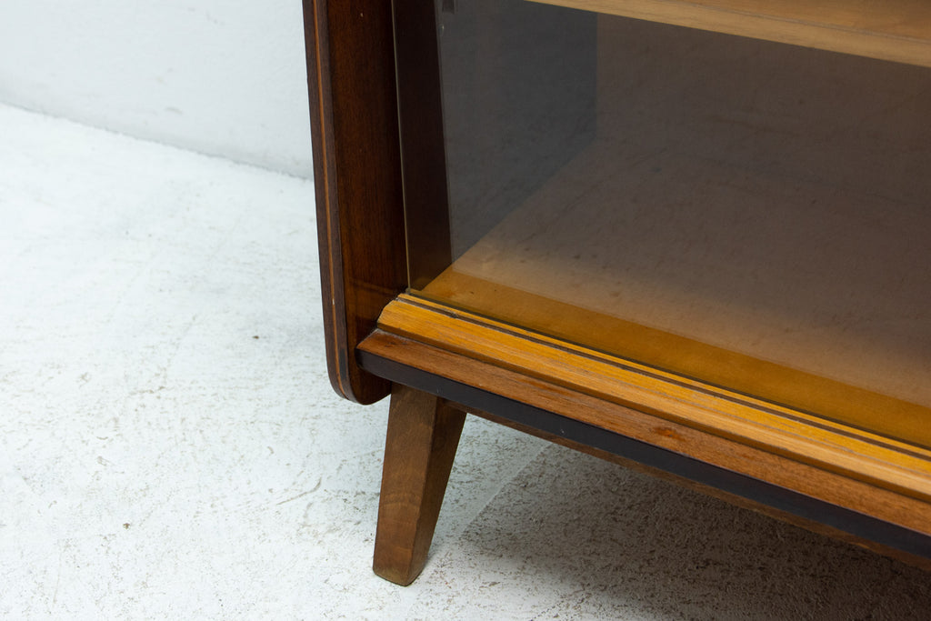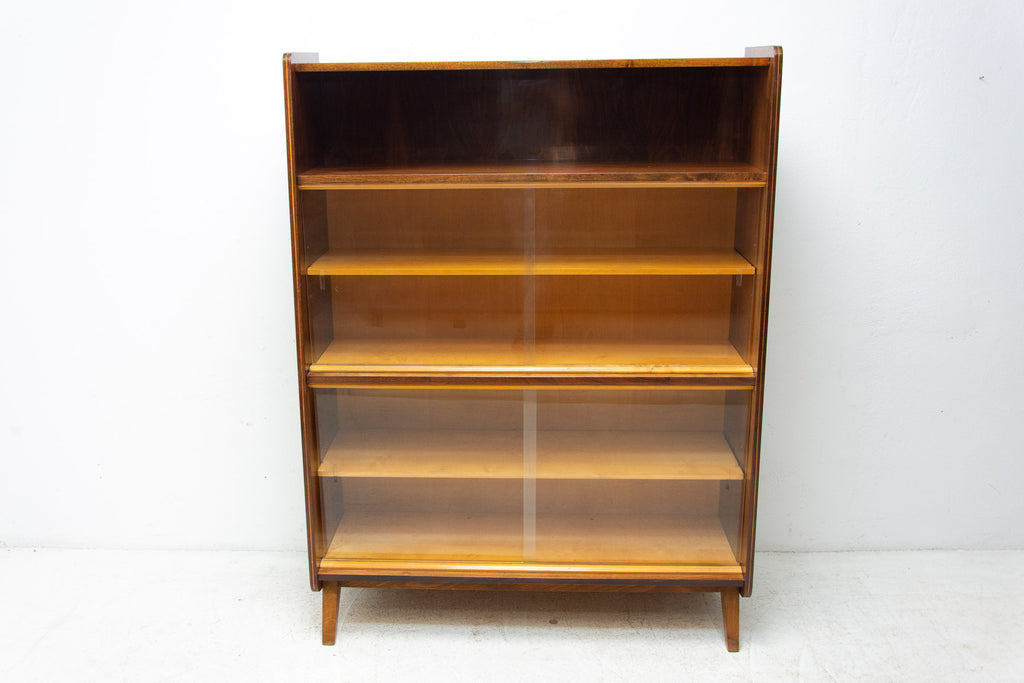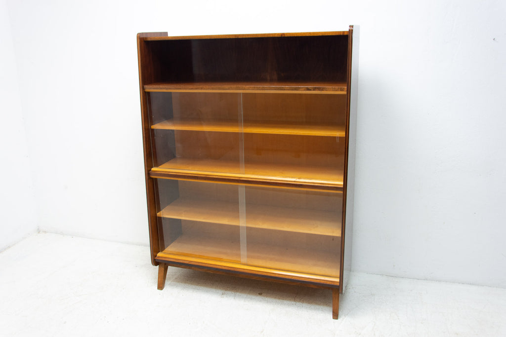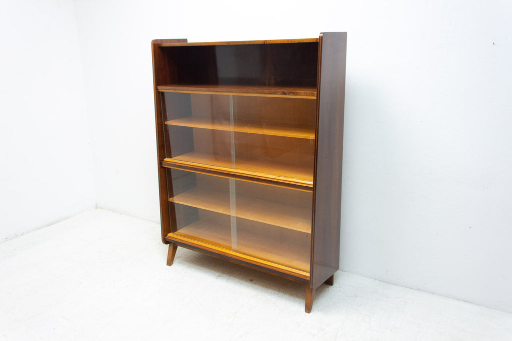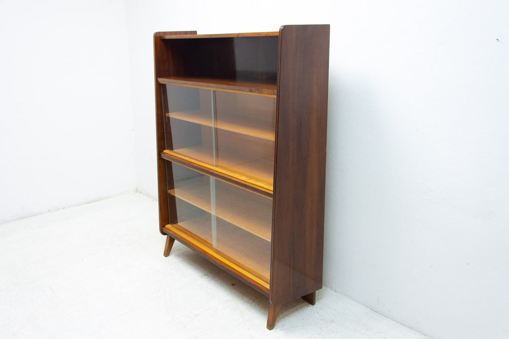 Mid century Vintage bookcase from the 1960´s. It was designed by Frantisek Jirák and was manufactured by Jitona company in the former Czechoslovakia. Features a simple design, a glazed section with five storage spaces. In Very good condition. Beautiful walnut veneer.