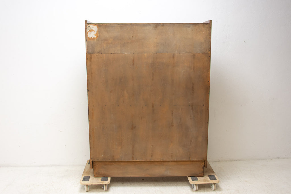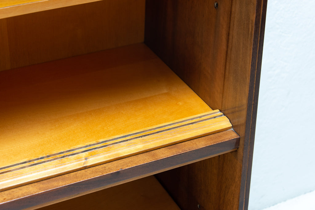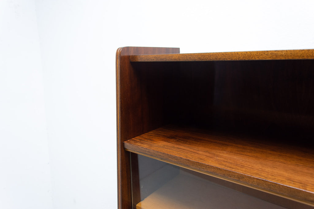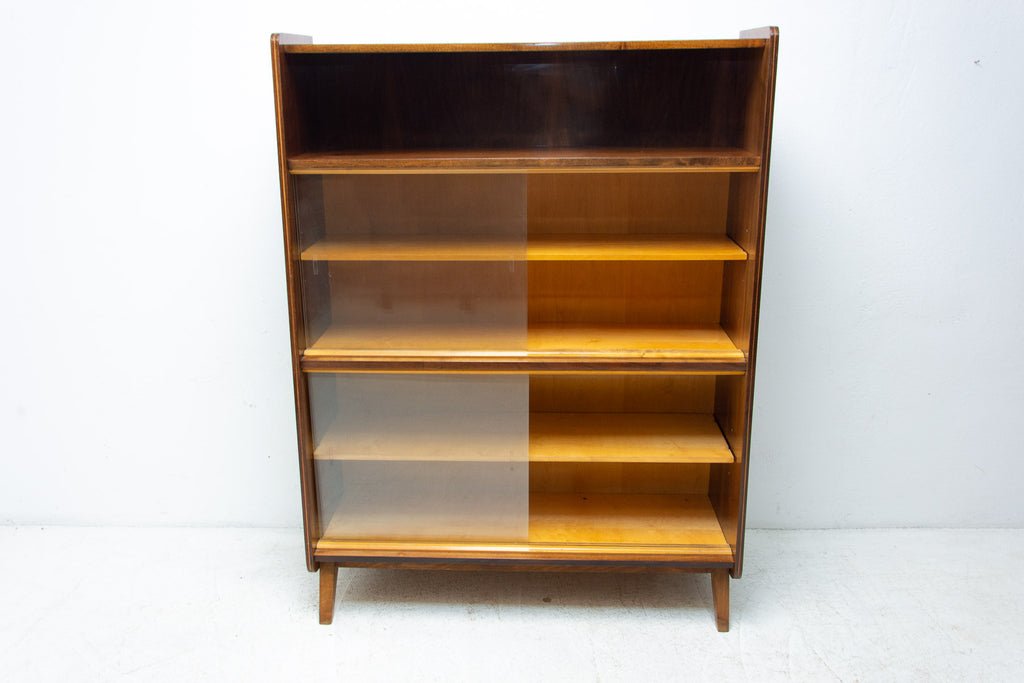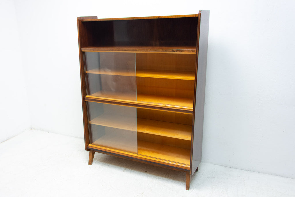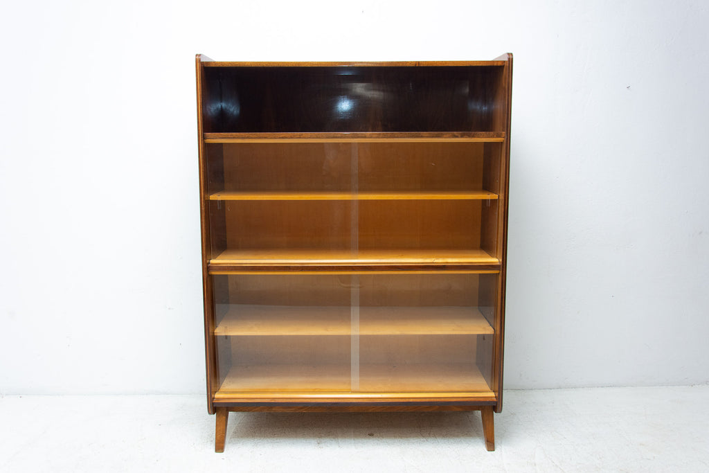 Mid century Vintage bookcase from the 1960´s. It was designed by Frantisek Jirák and was manufactured by Jitona company in the former Czechoslovakia. Features a simple design, a glazed section with five storage spaces. In Very good condition. Beautiful walnut veneer.