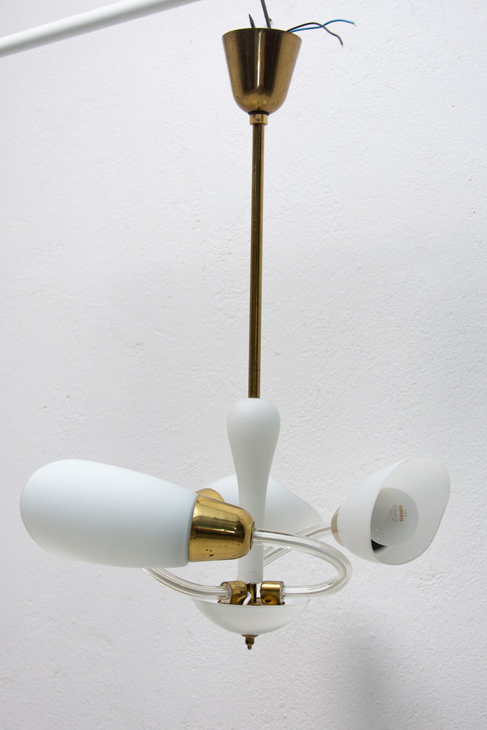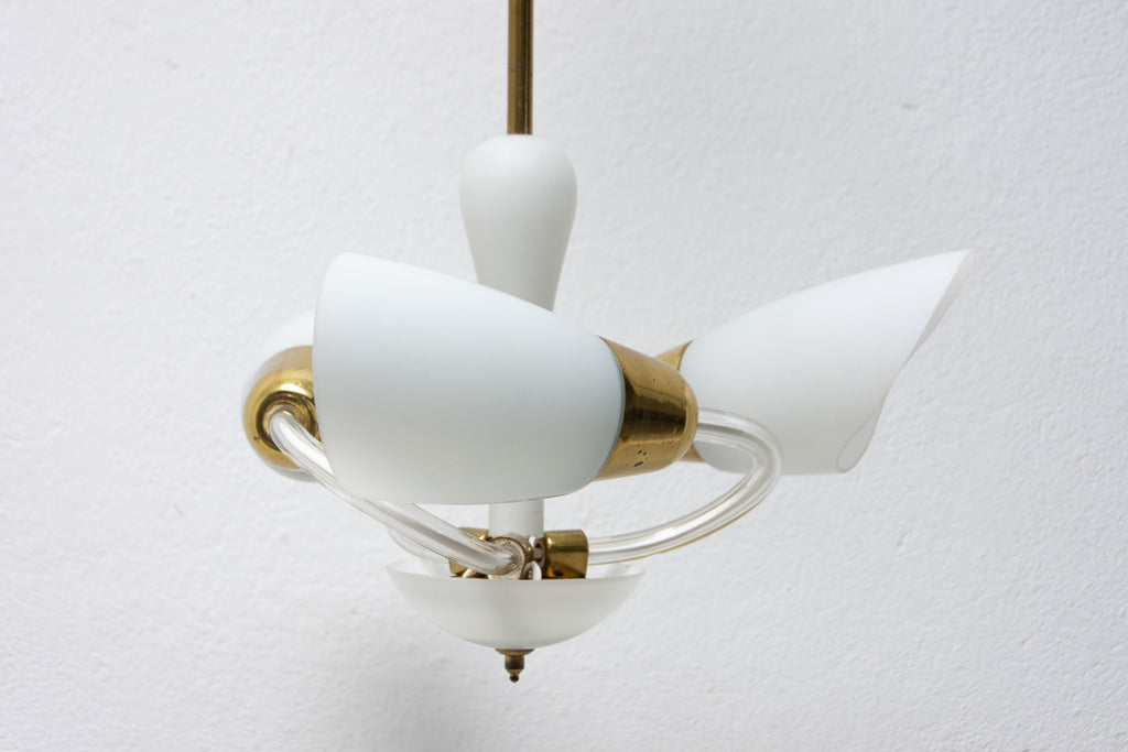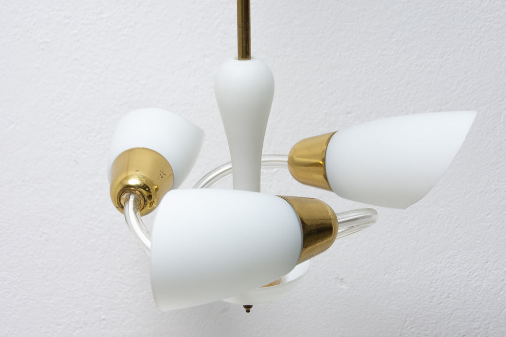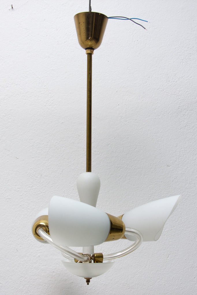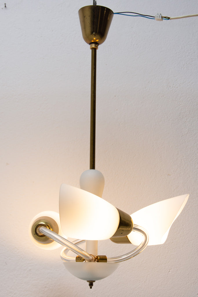 Mid century brass and glass pendant lamp in the shape of the bloom, it was made in Czechoslovakia in the 1960´s. In very good condition, new wiring.