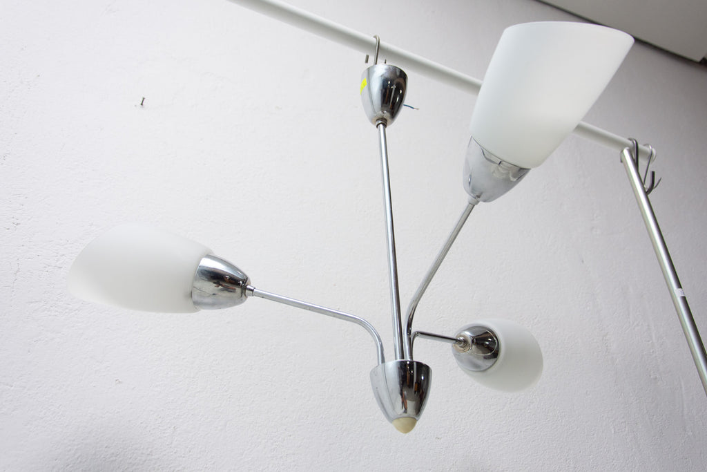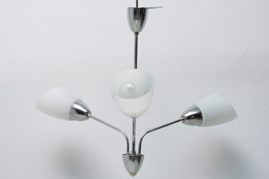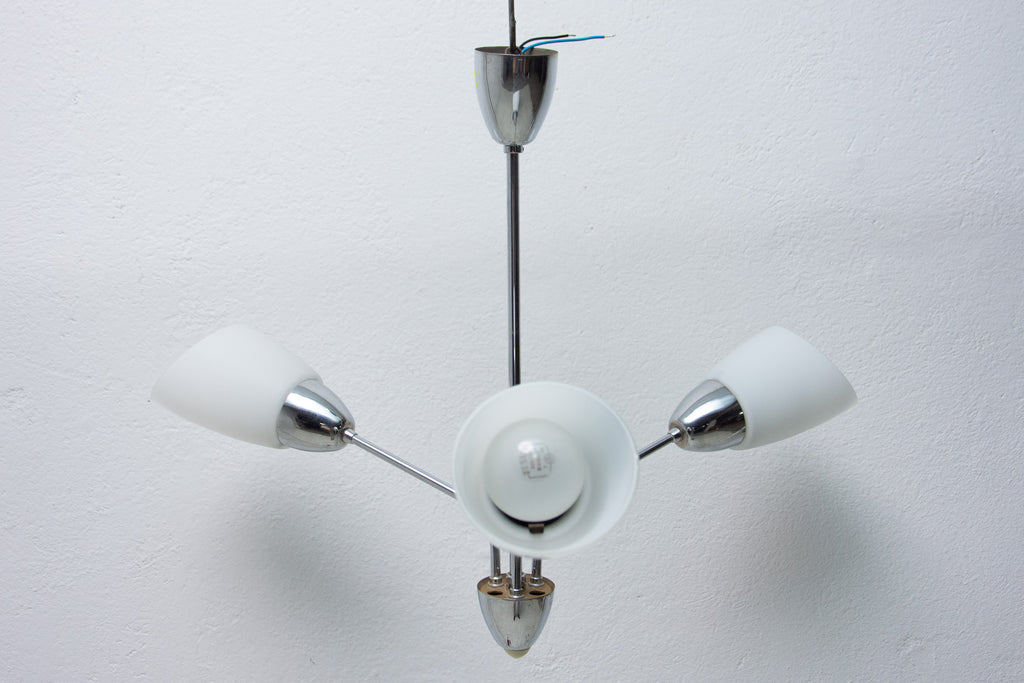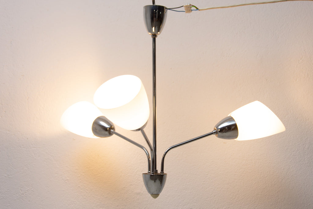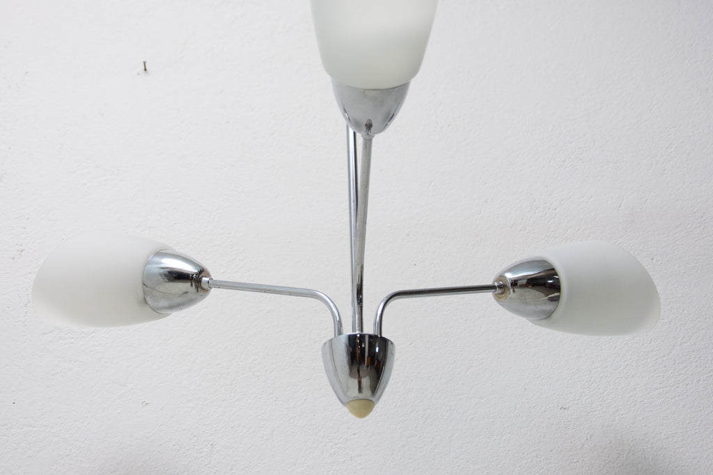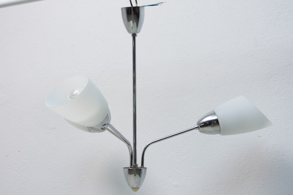 Czechoslovak milky glass and chrome pendant lamp in the shape of flower, made in the former Czechoslovakia in the 1960´s. It features 2 chrome arms with lampshades made of milky glass. In very good condition, new wiring.