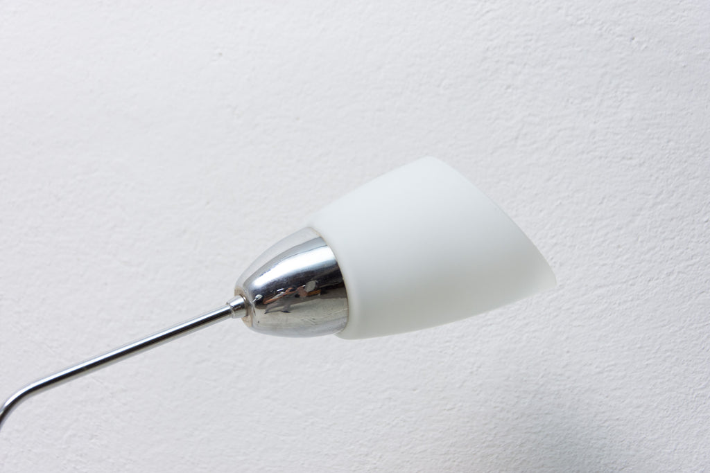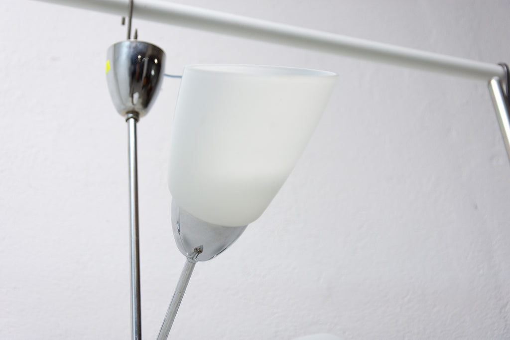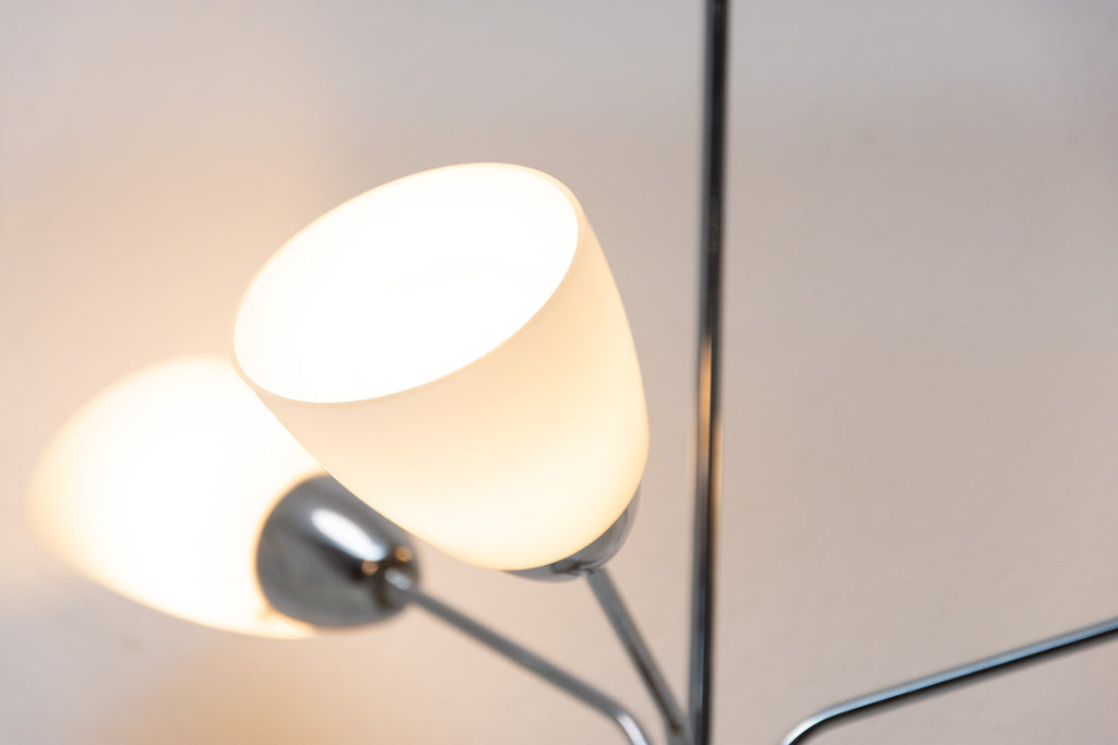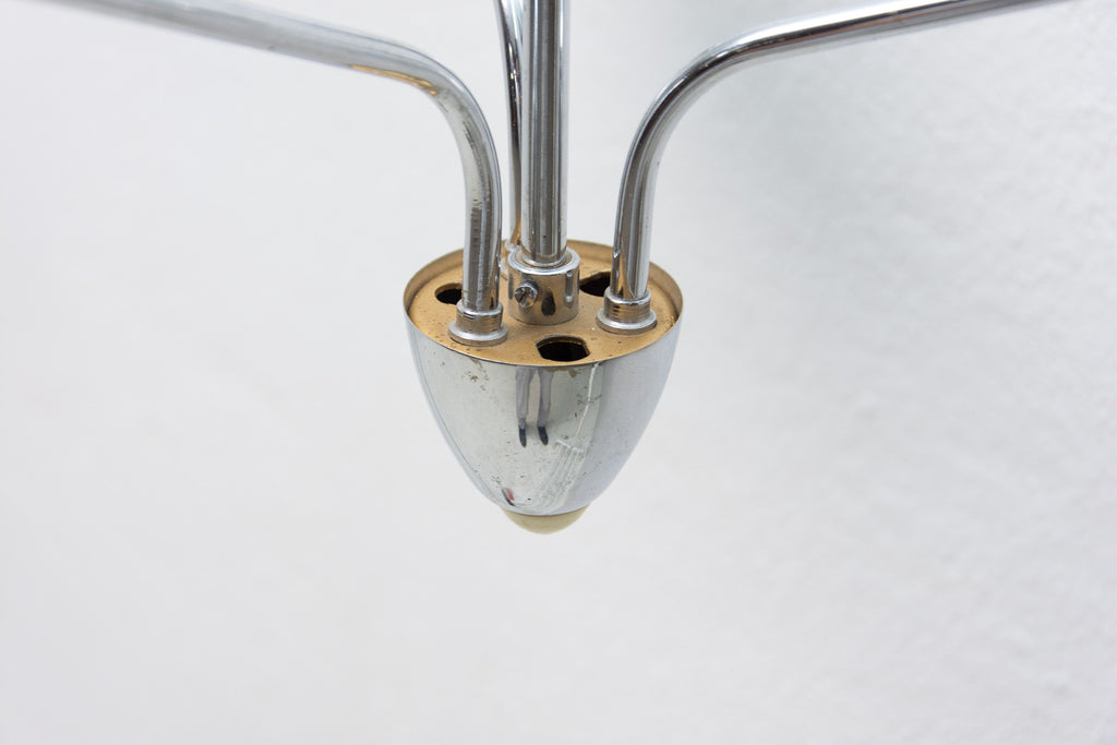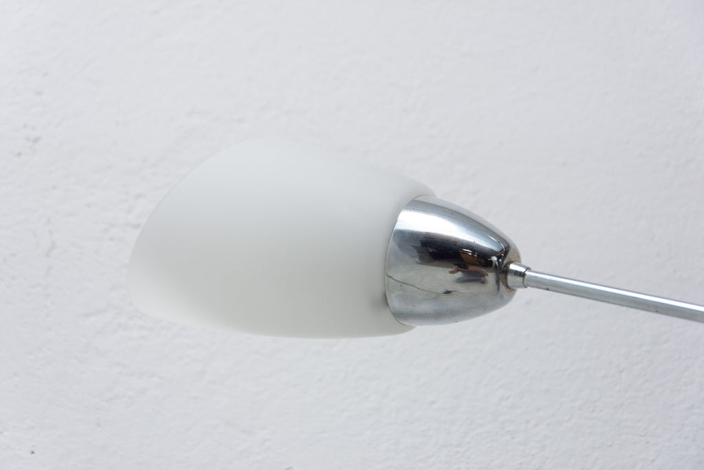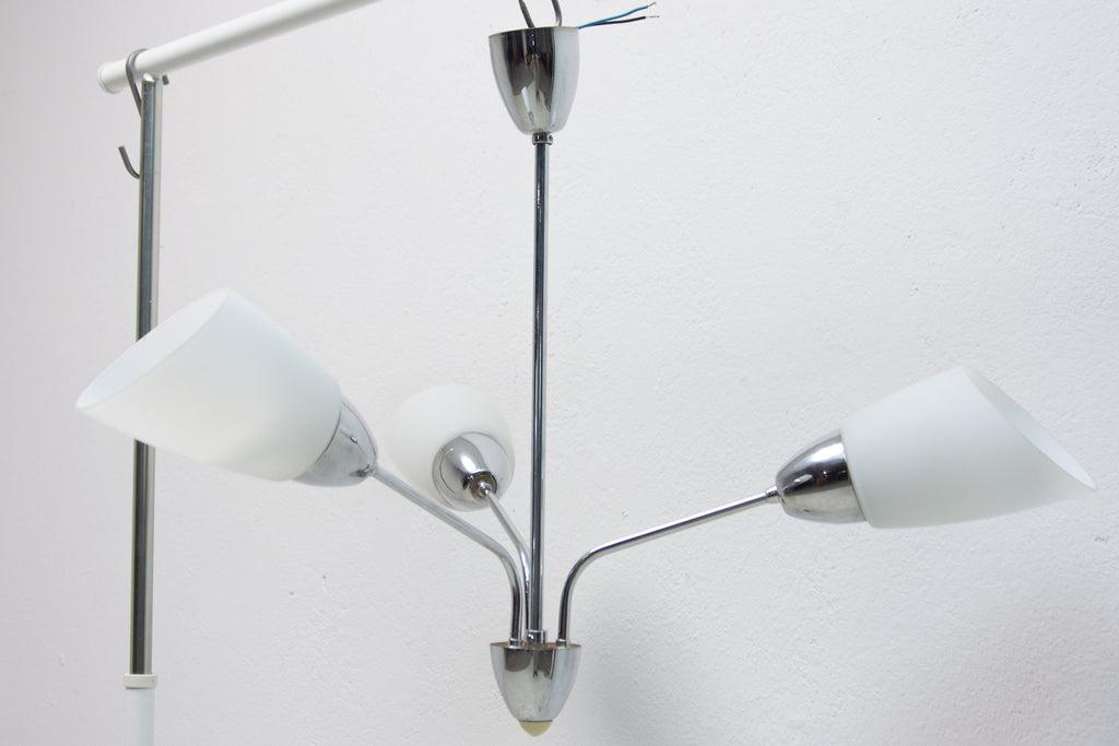 Czechoslovak milky glass and chrome pendant lamp in the shape of flower, made in the former Czechoslovakia in the 1960´s. It features 2 chrome arms with lampshades made of milky glass. In very good condition, new wiring.