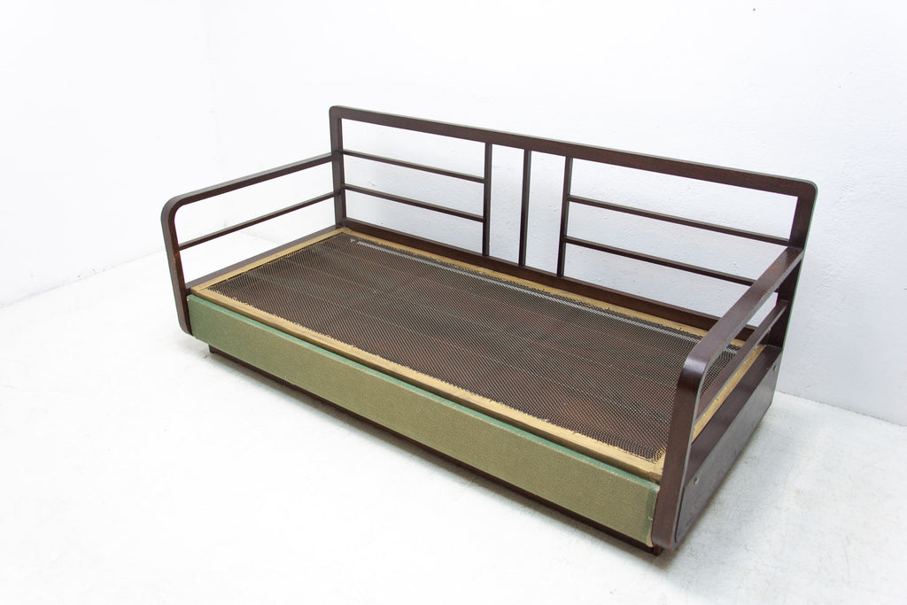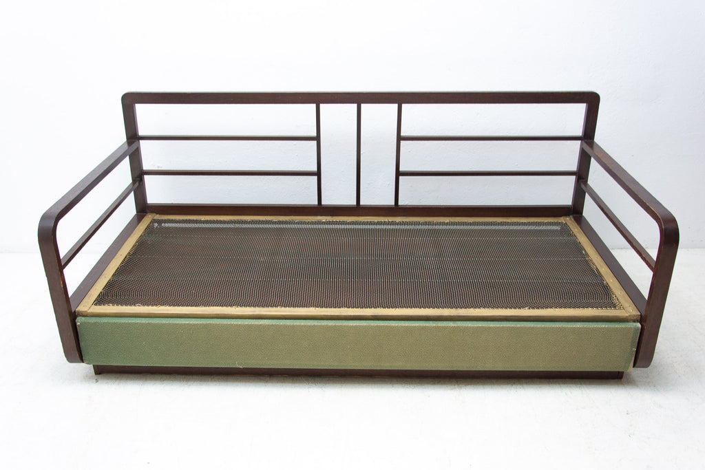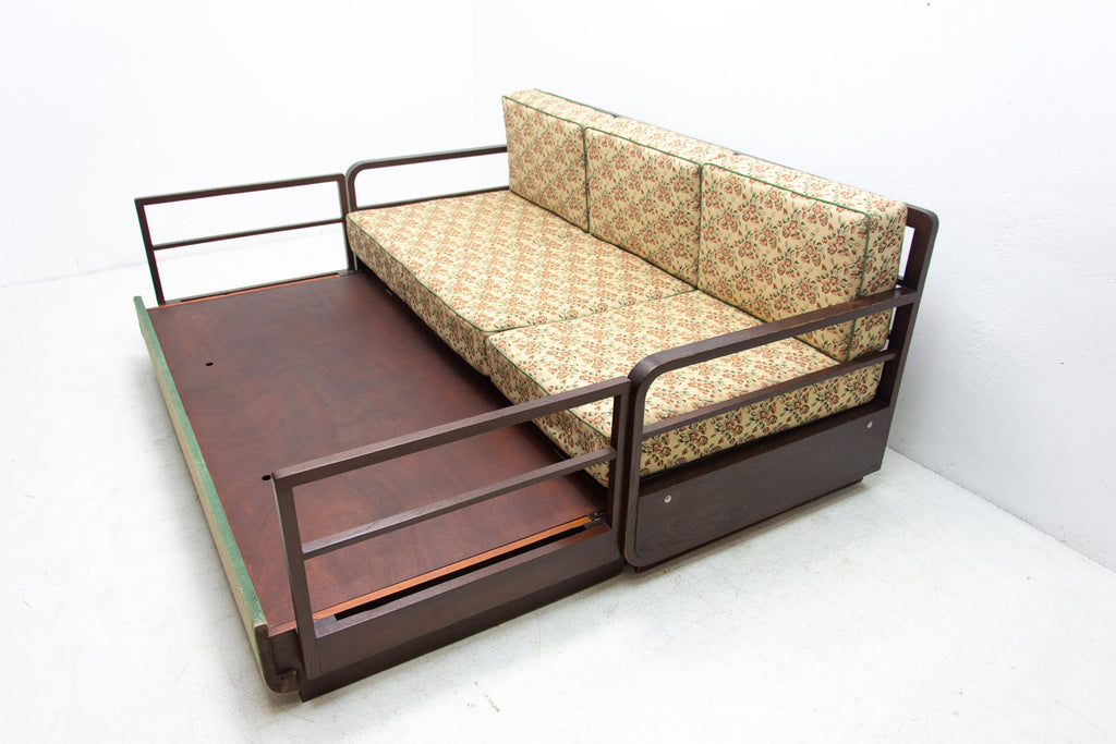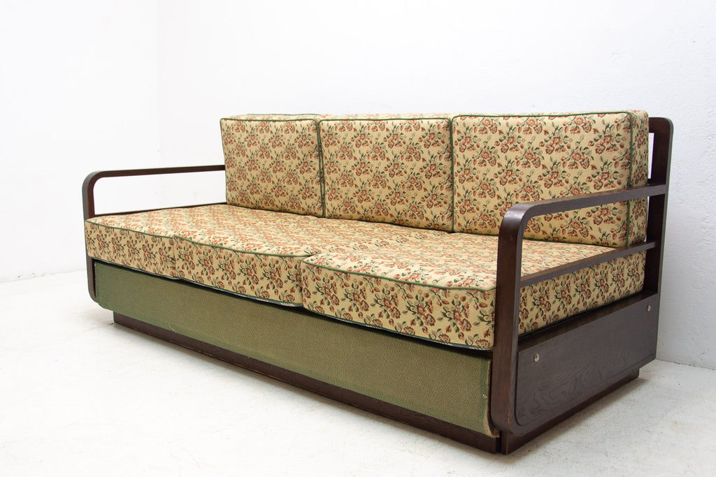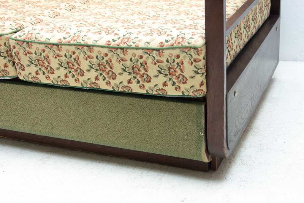 Mid century sofabed in ART DECO style, simple design fits into the context of the design creation in Czechoslovakia between 1930´s-1950´s. Dark stained oak wood. Traces of wear and tear commensurate with age. In good vintage condition. In order to assemble a fully-fledged folding bed, it is necessary to purchase one more new mattress, as can be seen from the photos.