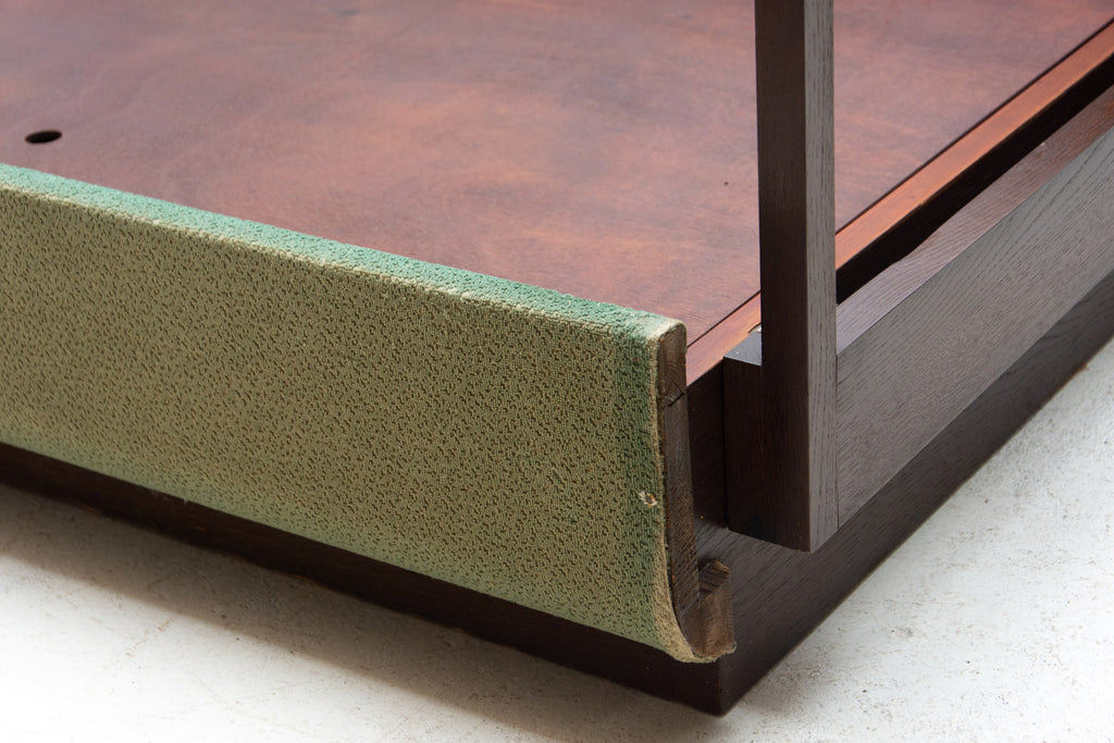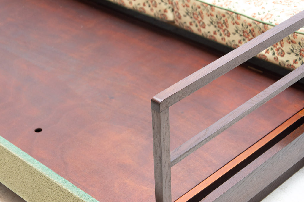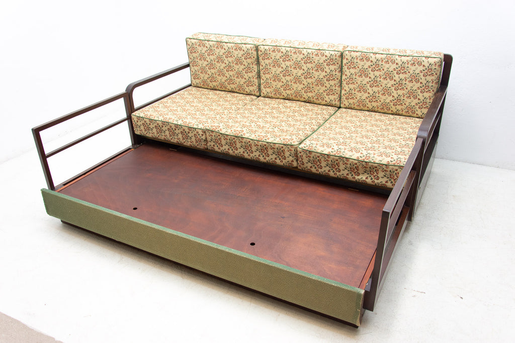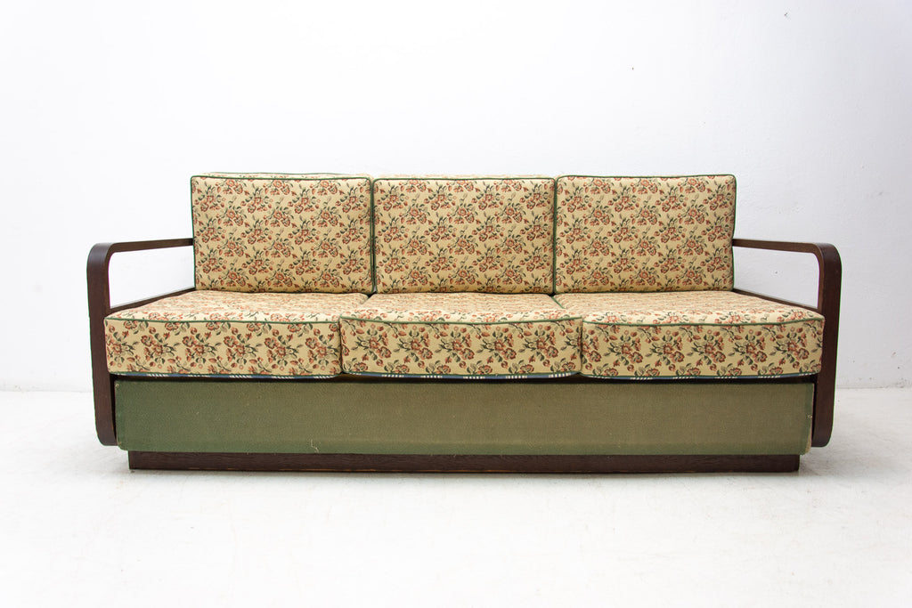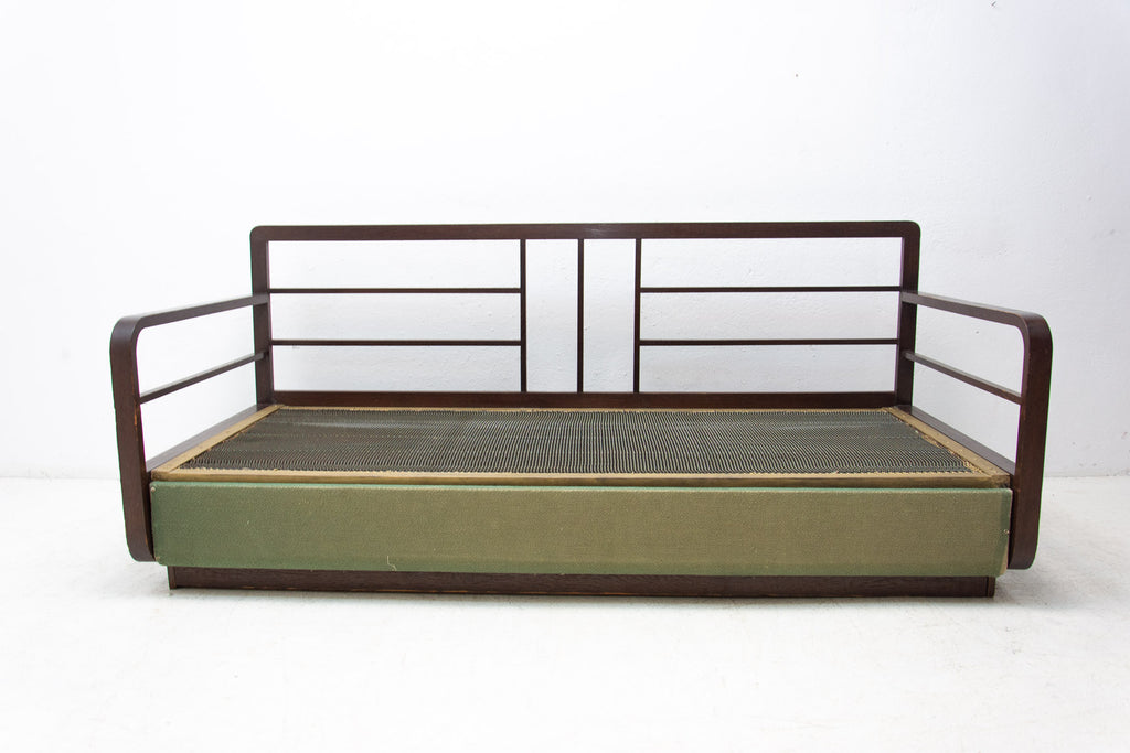 Mid century sofabed in ART DECO style, simple design fits into the context of the design creation in Czechoslovakia between 1930´s-1950´s. Dark stained oak wood. Traces of wear and tear commensurate with age. In good vintage condition. In order to assemble a fully-fledged folding bed, it is necessary to purchase one more new mattress, as can be seen from the photos.