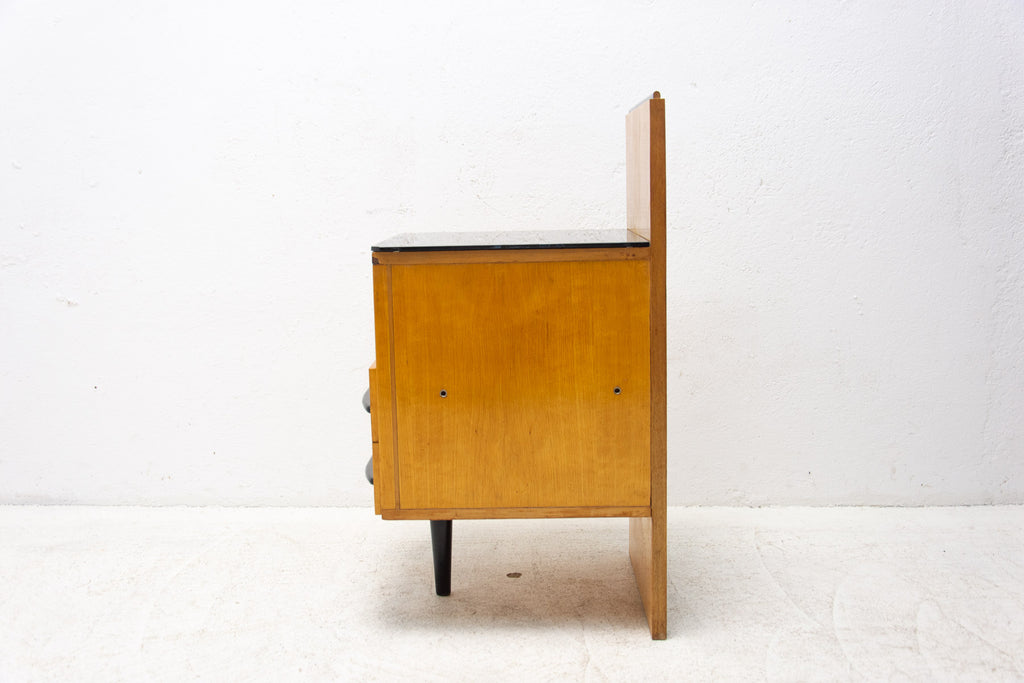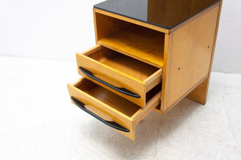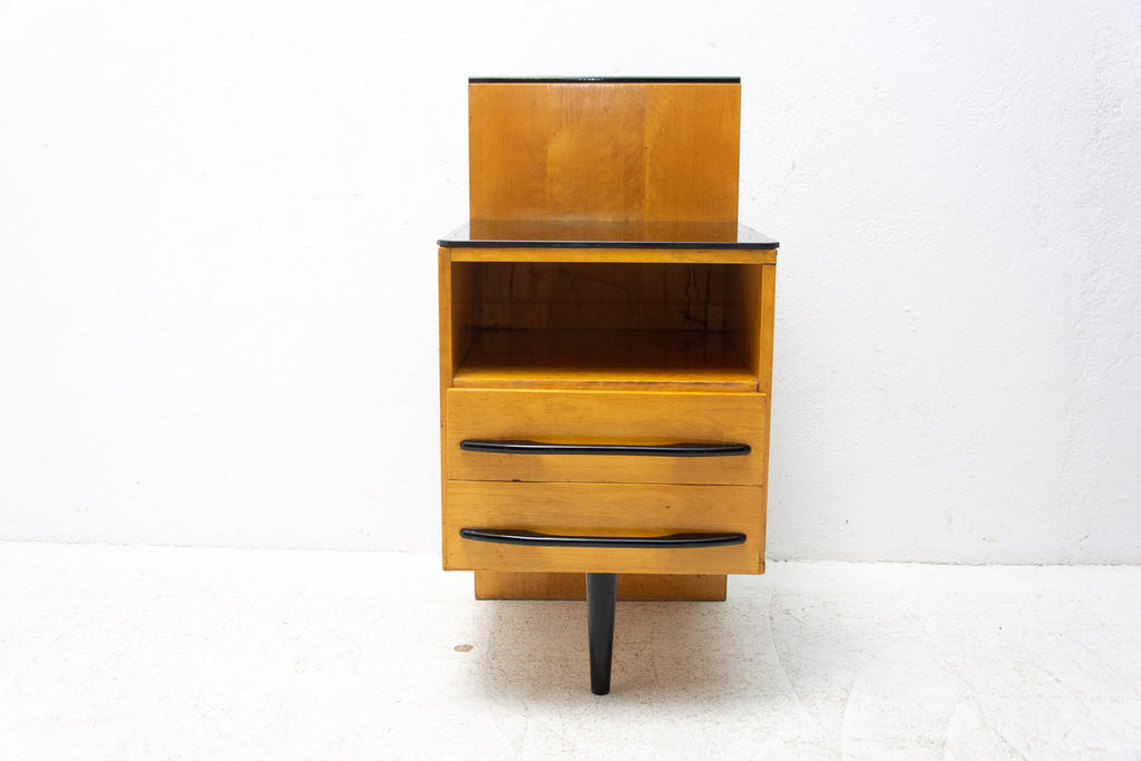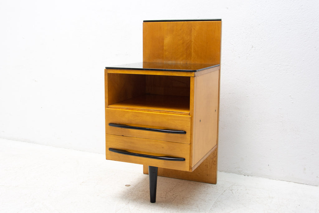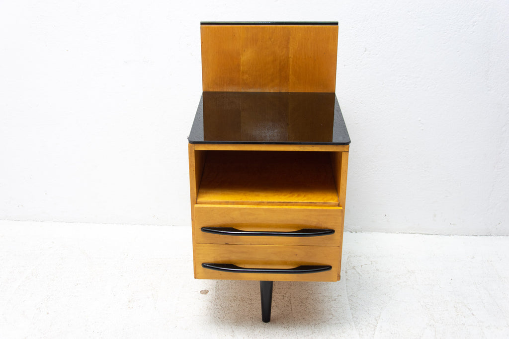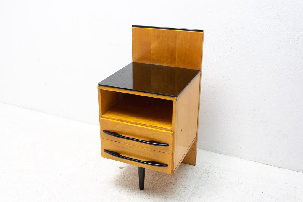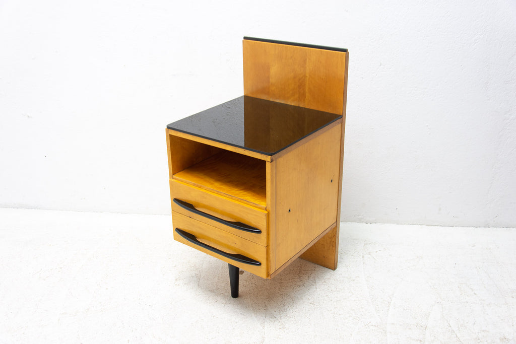 This midcentury nightstand/bedside table was designed by Mojmír Požár for UP Závody and made in the former Czechoslovakia in the 1960´s. Made of ash wood and black glass.