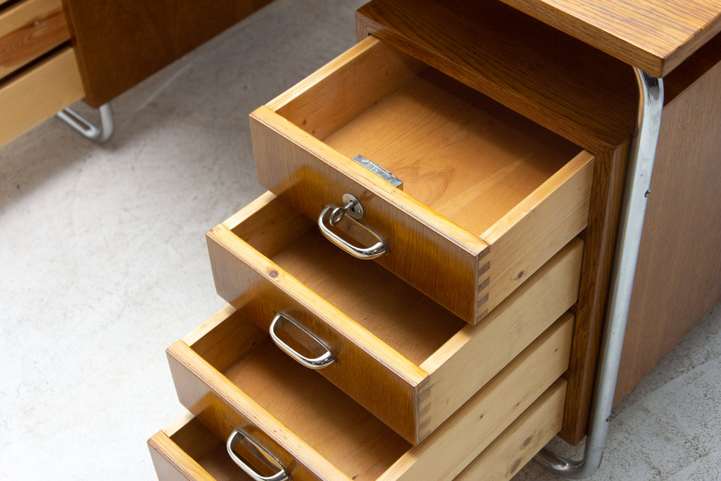 Material: tubular, chrome-plated steel, slatted veneer plywood, drawer body made of solid spruce