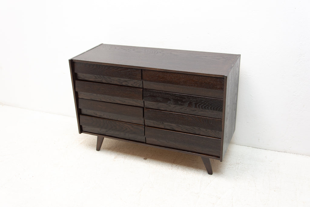 Mid century chest of drawers, model no. U-453, designed by Jiří Jiroutek for Interiér Praha. It was made in the former Czechoslovakia in the 1960´s. This model is associated with the world-famous EXPO 58 in Brussels. It´s made of oak wood and and plywood and drawers have plastic inner parts.