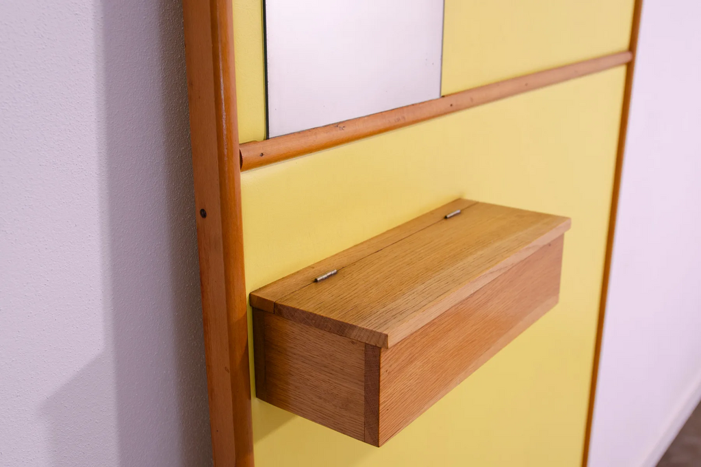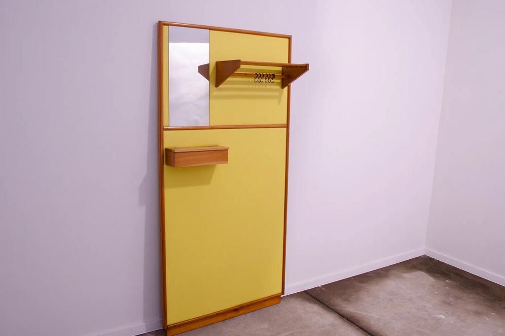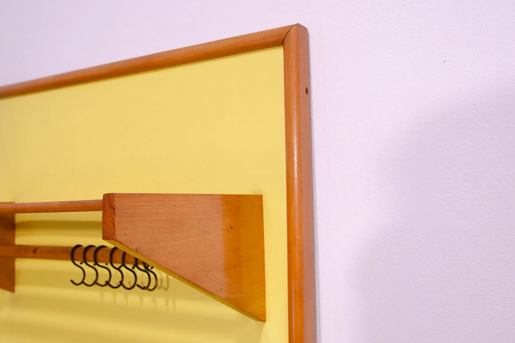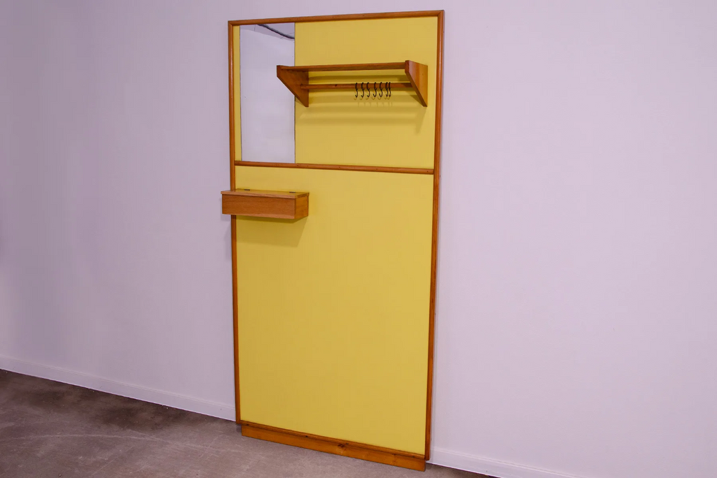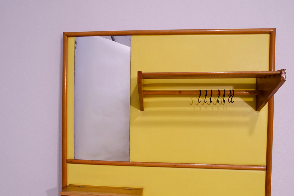 This hall coat rack was made in the former Czechoslovakia in the 1950´s and produced by Dřevokov company. Material: plywood, wood, leatherette, metal. It can be mounted on the wall or laid freely on the floor.