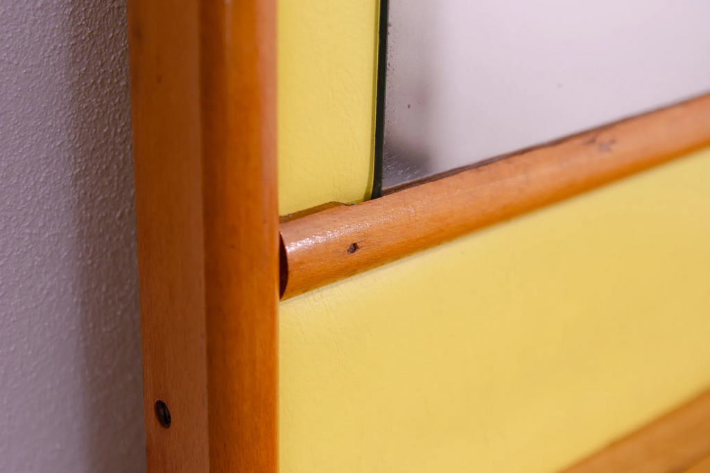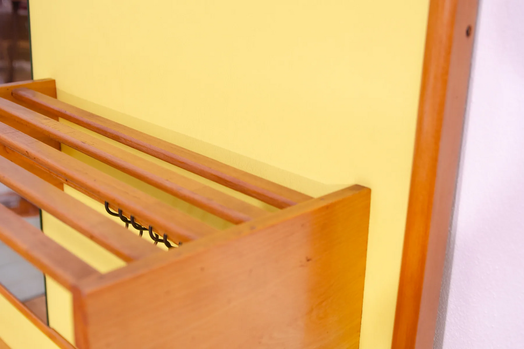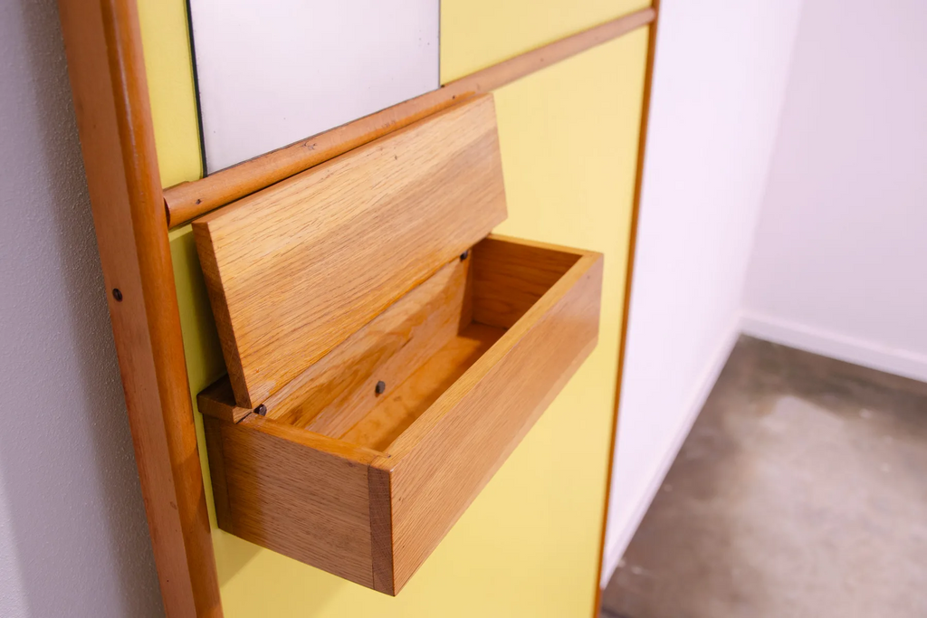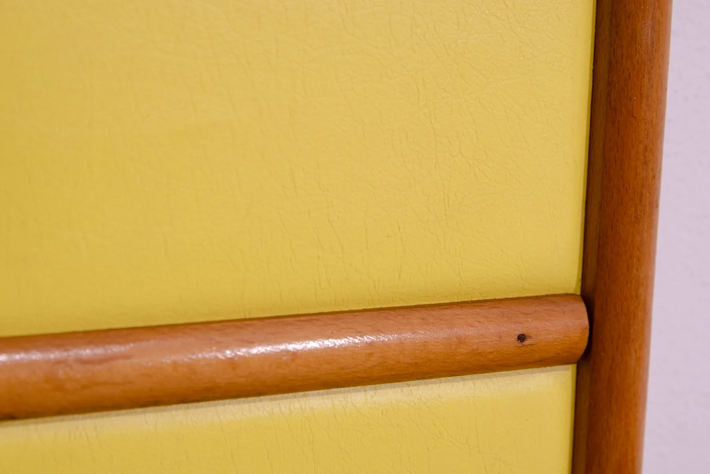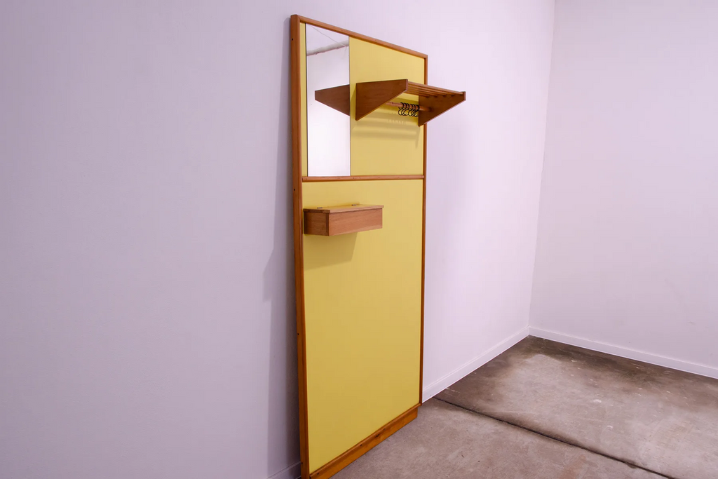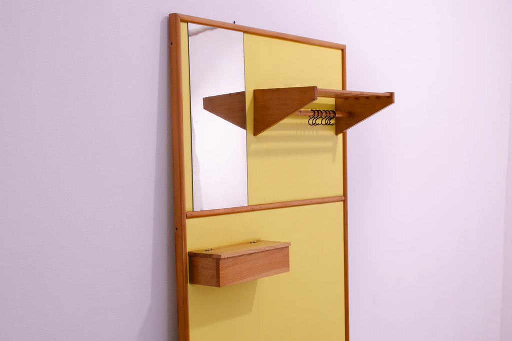 This hall coat rack was made in the former Czechoslovakia in the 1950´s and produced by Dřevokov company. Material: plywood, wood, leatherette, metal. It can be mounted on the wall or laid freely on the floor.
