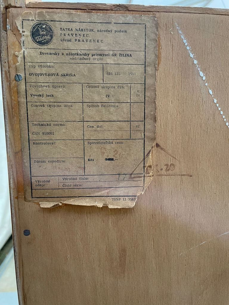 The original production label confirms provenance and the high-quality manufacturing standards typical of Tatra Nábytok.
